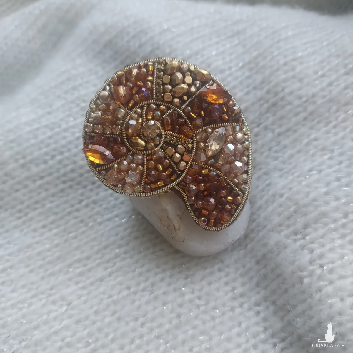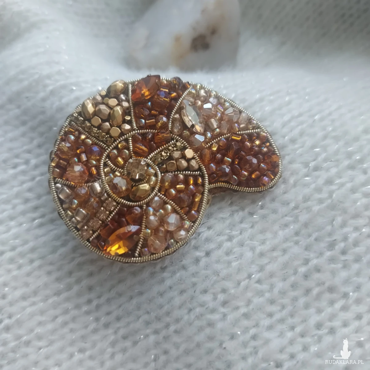 Broszka MUSZLA orginalna, niepowtarzalna urocza - w kolorze bursztynu, szampana i złota.