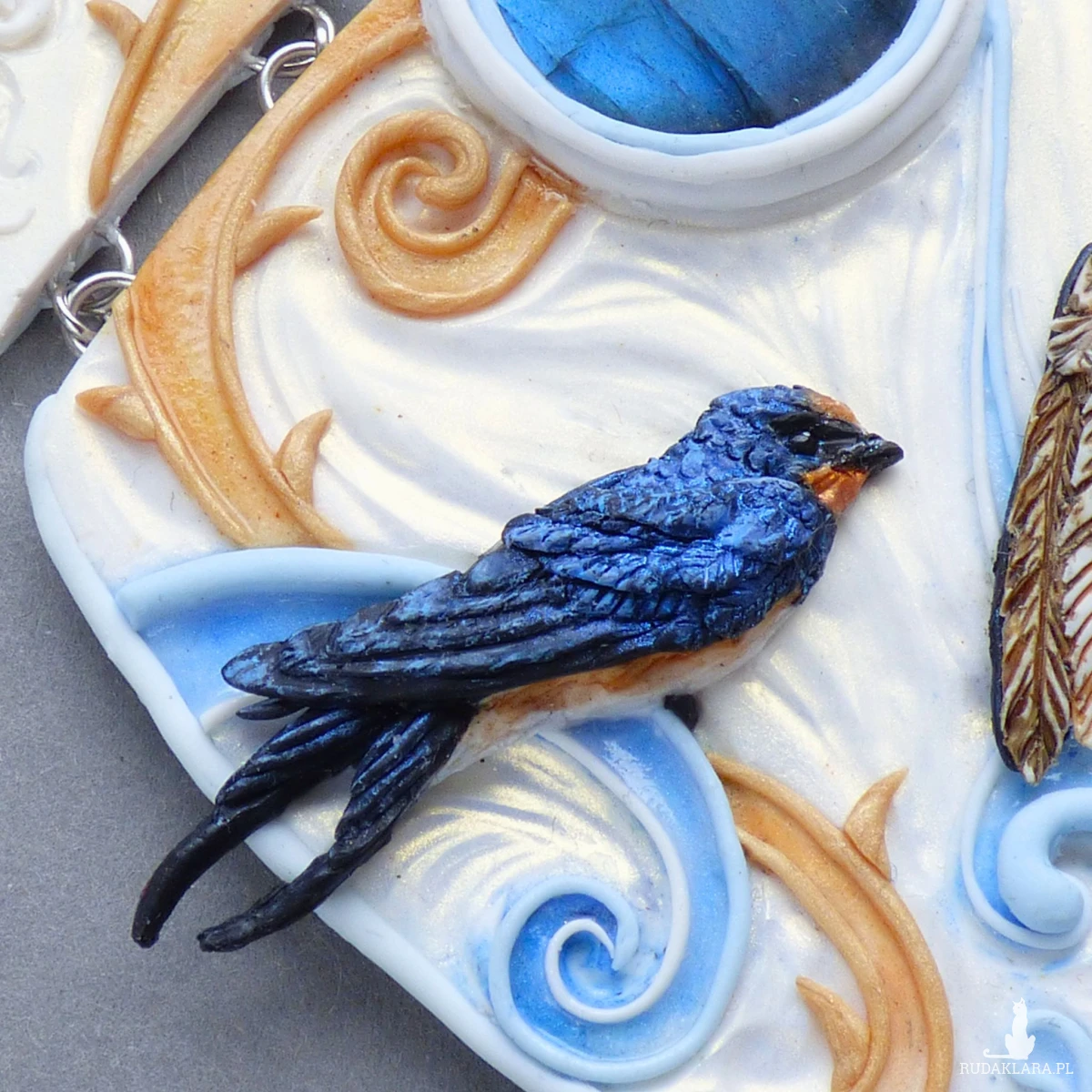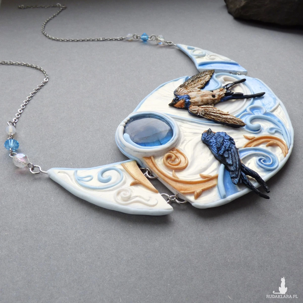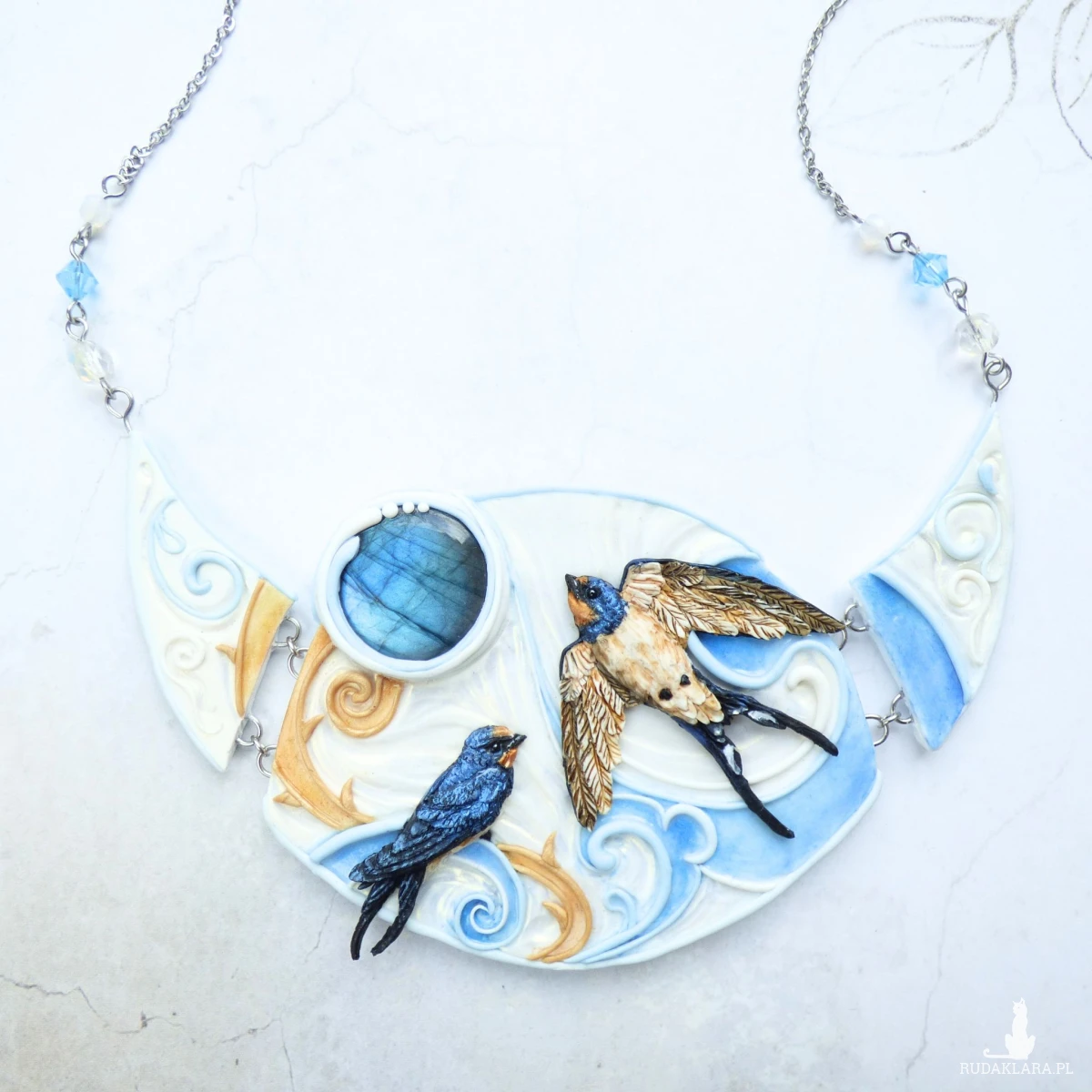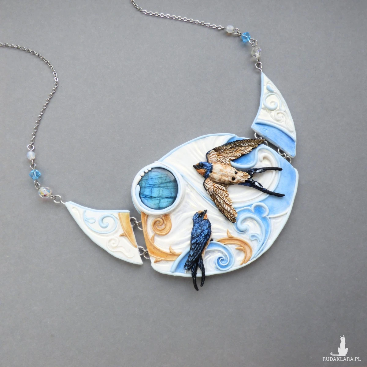 Unikatowy naszyjnik inspirowany motywem jaskółek – ptaków nadziei, wierności i powrotu do domu. Głównym motywem są dwie misternie rzeźbione jaskółki, osadzone na płaskorzeźbie z falistymi ornamentami symbolizującymi wiatr i lot ku wolności. Tło utrzymane jest w pastelowych odcieniach błękitu i bieli, oraz muśnięte proszkiem metalicznym, dzięki czemu mieni się w promieniach światła.