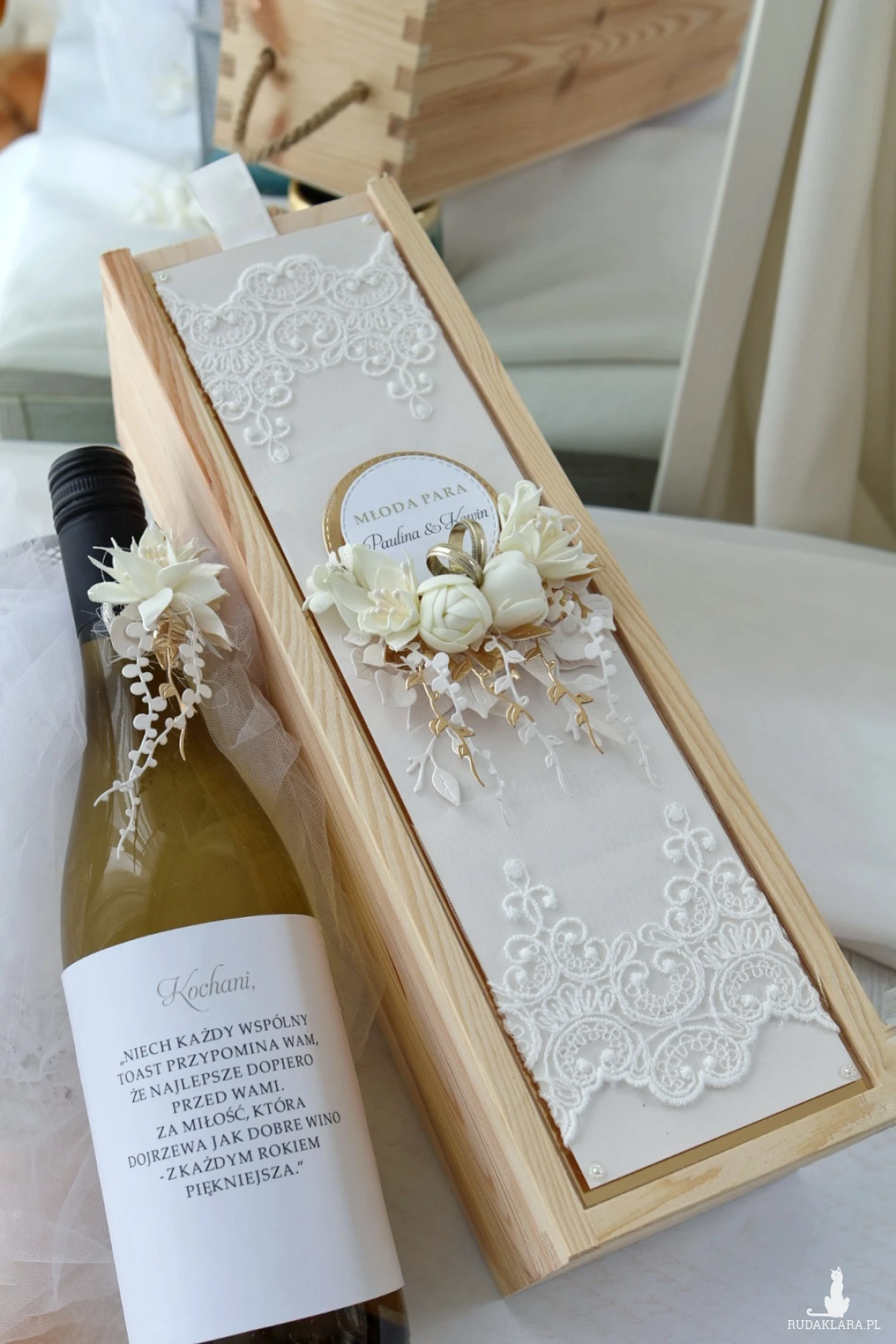 Zestaw zawiera kartkę w drewnianym pudełku (z opcją kieszonki), skrzynkę na wino (butelka we własnym zakresie), etykietę i zawieszkę z personalizacją oraz torebkę prezentową.