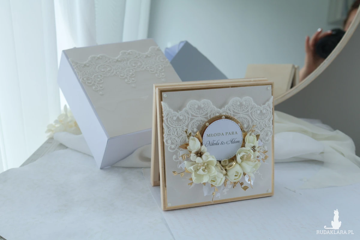 Wpiszę imiona, datę, życzenia i cytat, a całość utrzymana jest w kremowo-złotej elegancji z delikatną koronką.