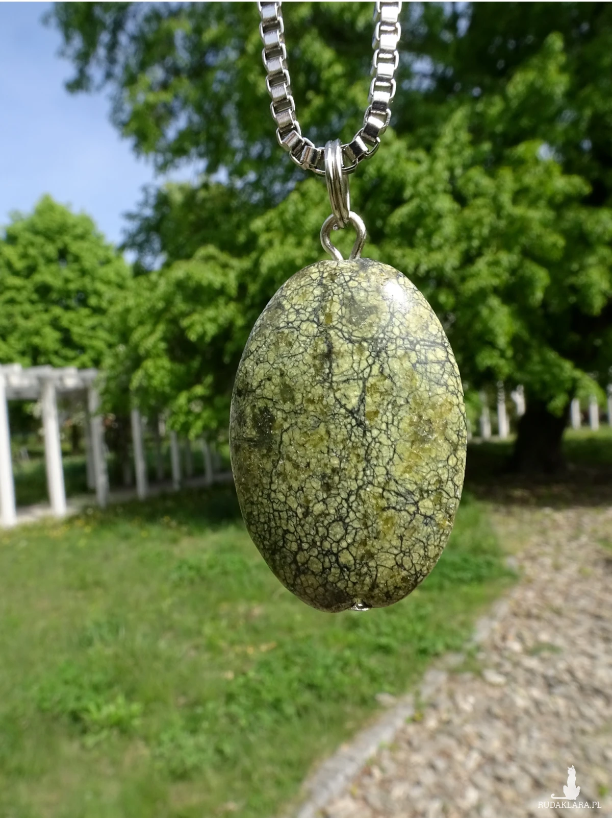 Wisiorek z łańcuszka ze stali chirurgicznej i zawieszki z zielonego jaspisu w kształcie łezki o wymiarach ok. 3,7x1,9cm. Długość z zapięciem 45cm.