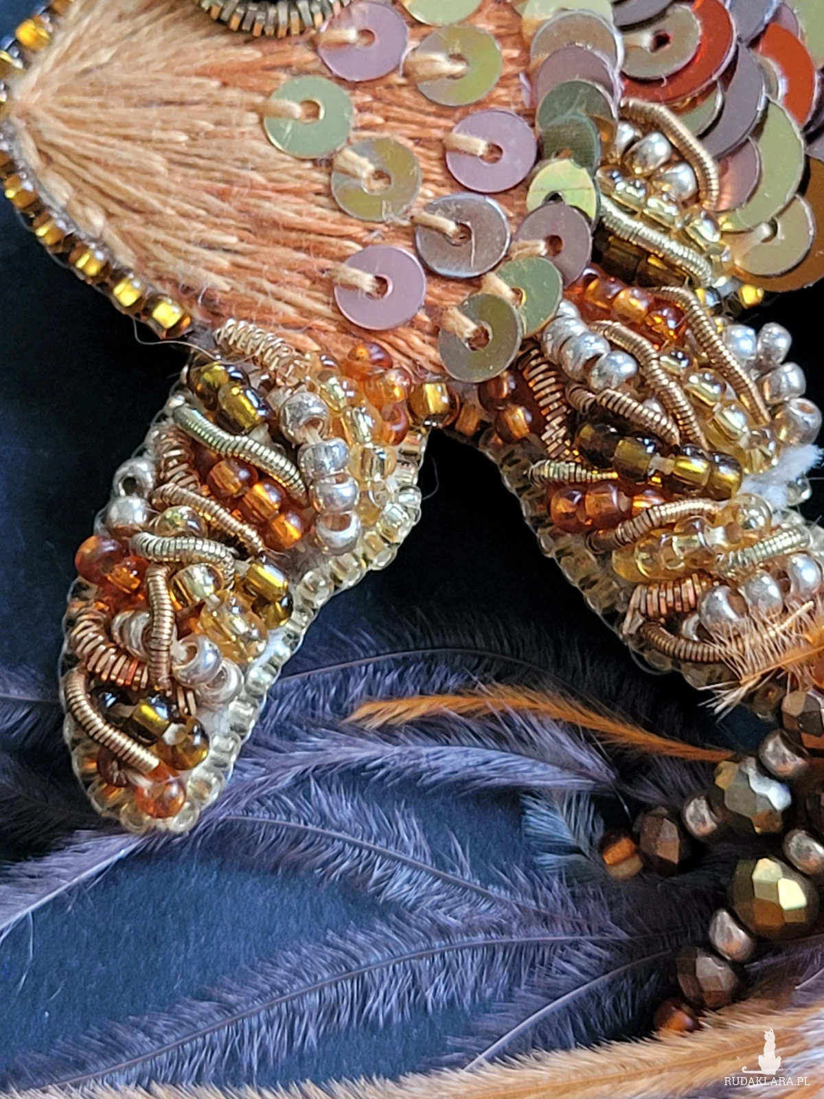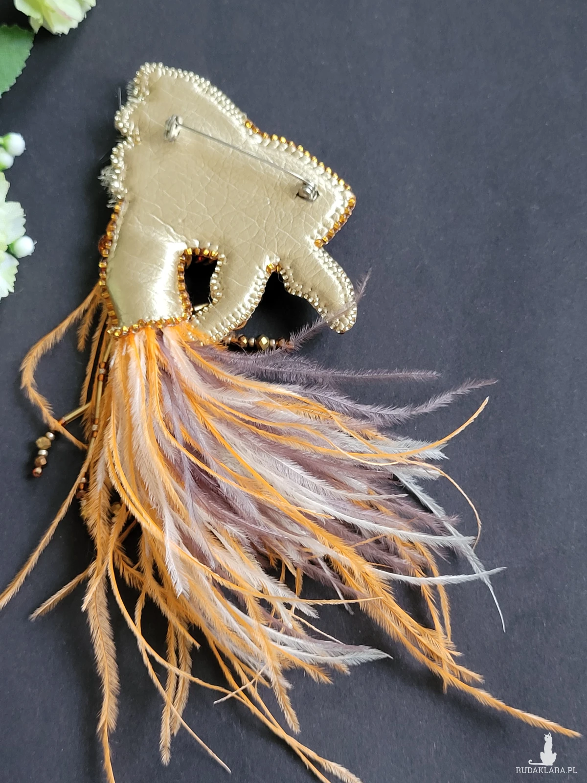 🧡💛🤎 Odcienie ecru, złota, beżu i pomaranci nadają broszce elegancji i magicznego uroku. Pióra subtelnie poruszają się przy każdym ruchu i nadają lekkości.