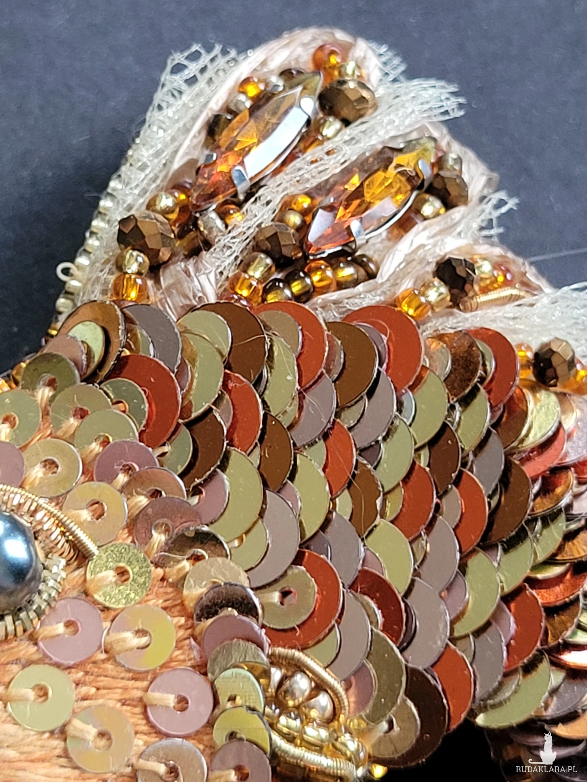 Unikatowa, ręcznie haftowana broszka w kształcie niezwykłej ryby. Połączenie lśniących cekinów, koralików, kryształków i piór sprawia, że ten dodatek jest prawdziwym dziełem sztuki!