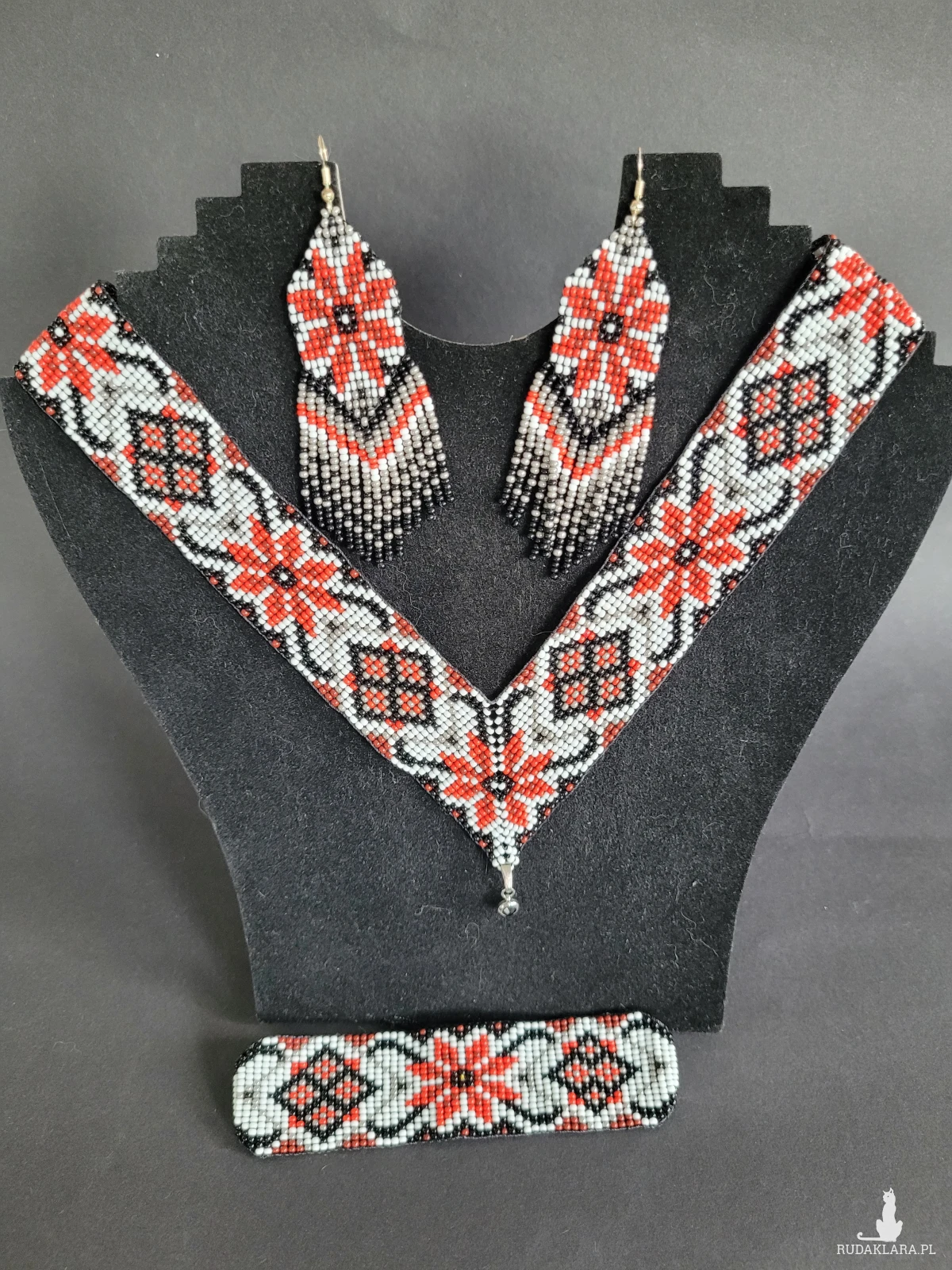 Komplet bużuterii "Słowiańska gwiazda" składa się z naszyjnika, bransoletki oraz kolczyków ręcznie robionych na krosnie z czeskich koralików szklanych Preciosa.