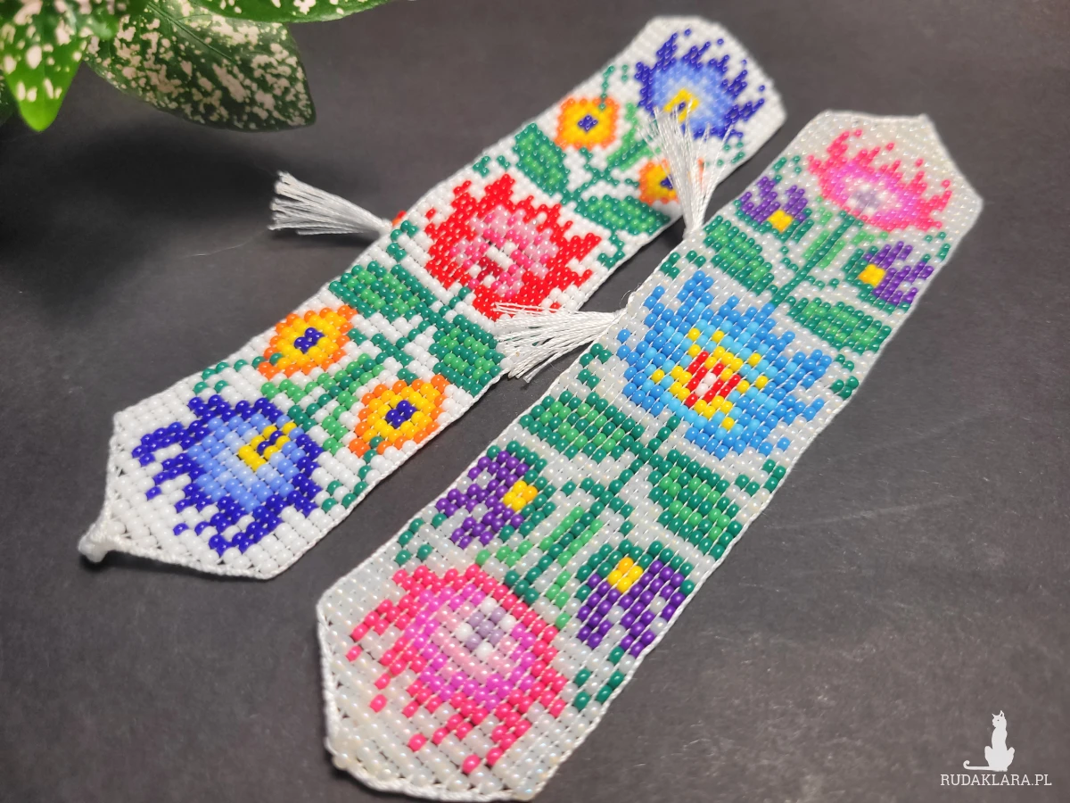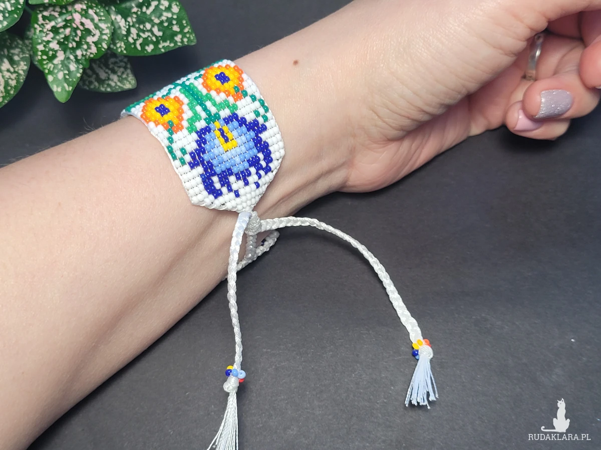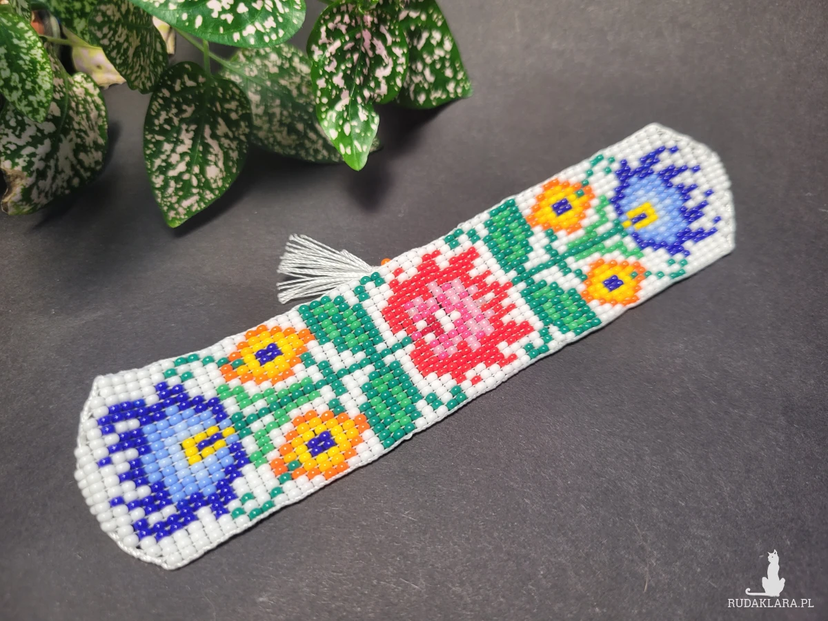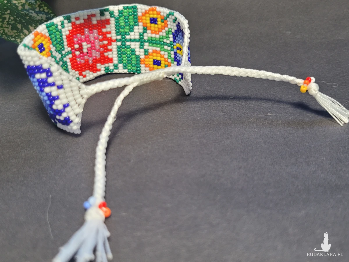 Bransoletka z wielobarwnymi kwiatami na białym tle, inspirowana tradycyjnym polskim motywem etnicznym wytkana na krosnie z koralików czeskich Preciosa.