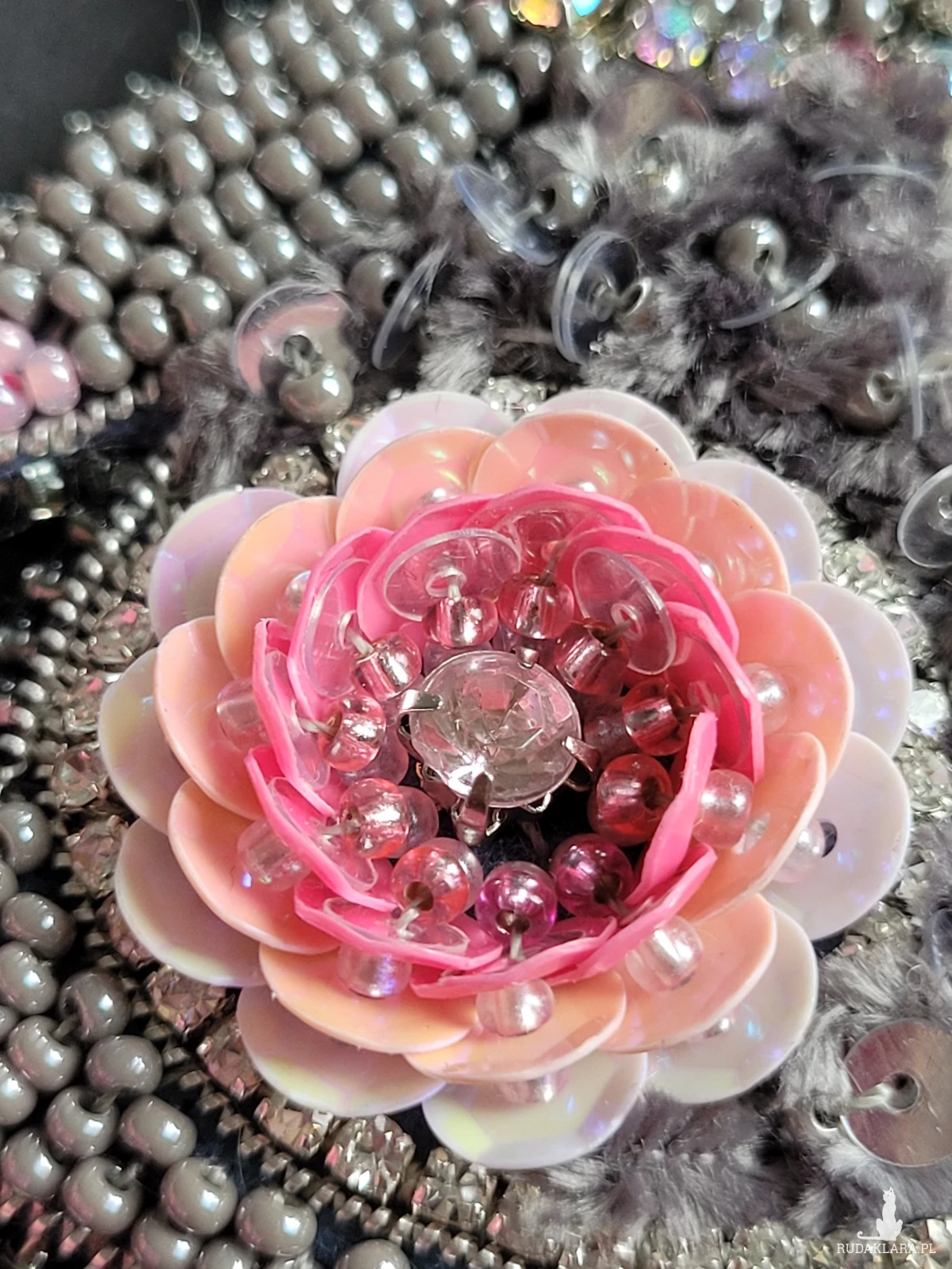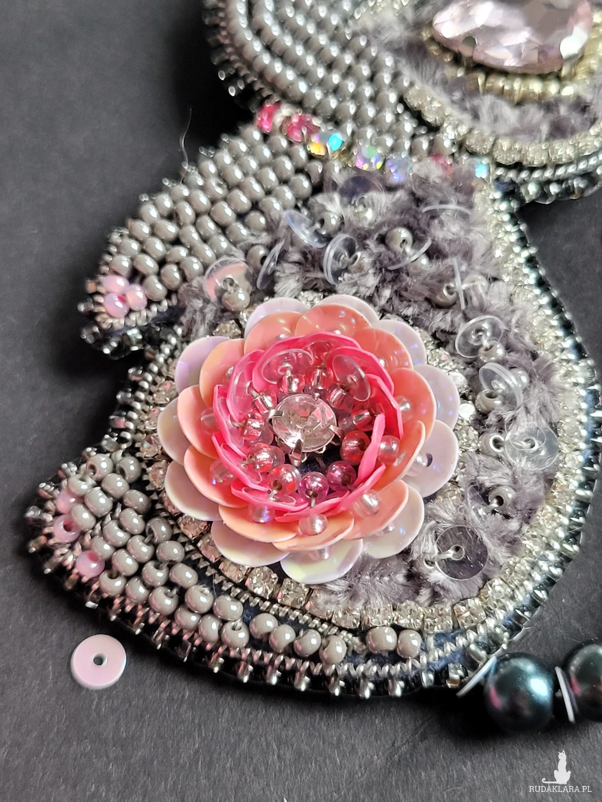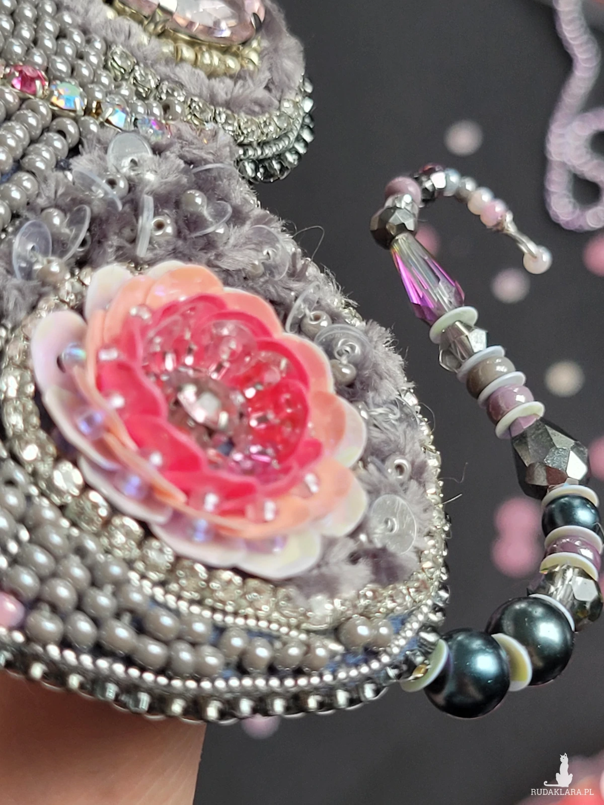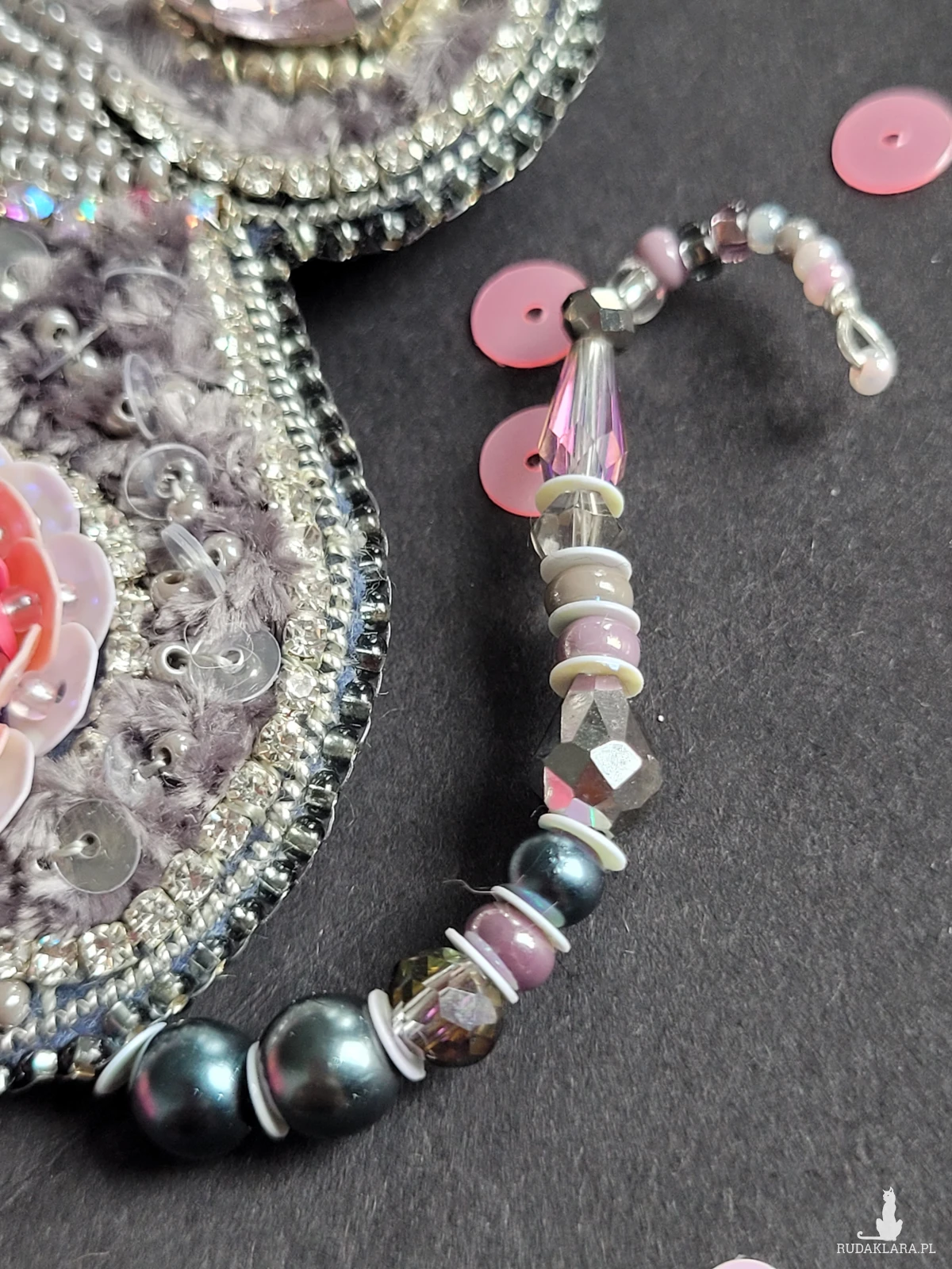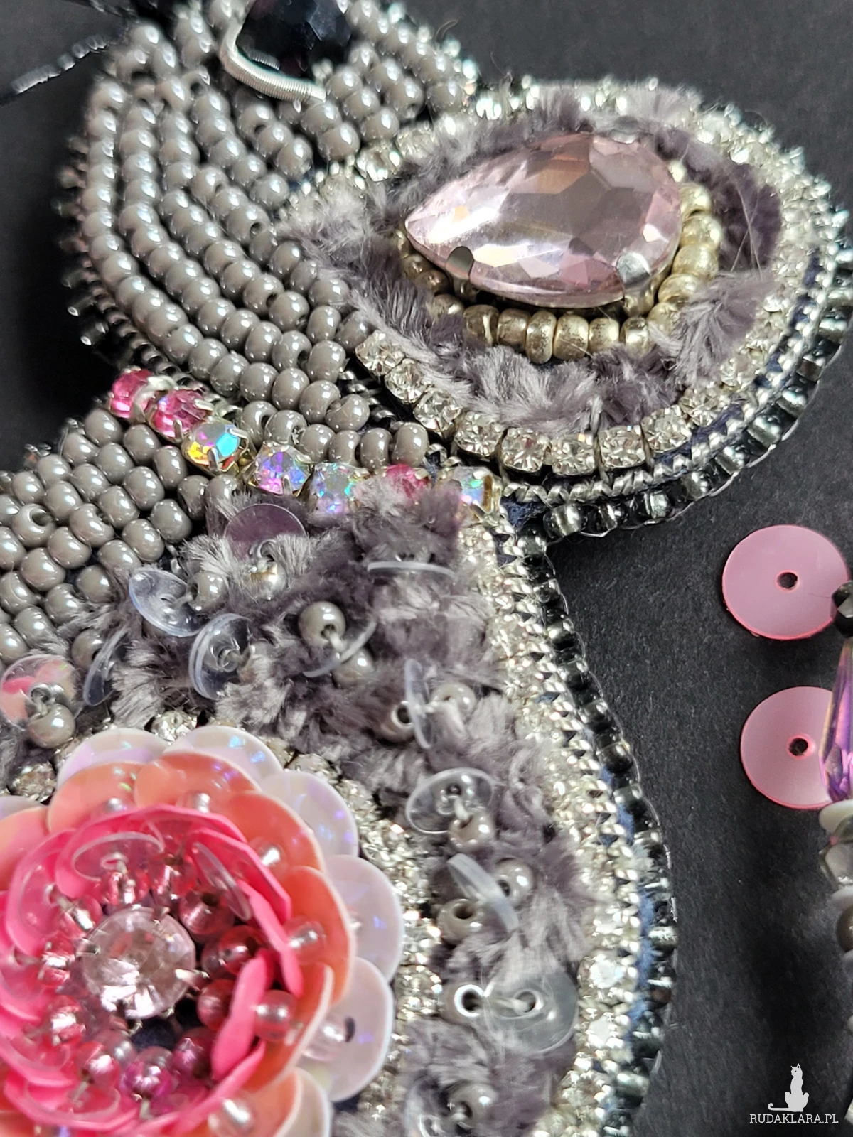 Ręczne wykonanie z koralików, cekinów, kryształków, tkaniny i ozdobnych perełek.