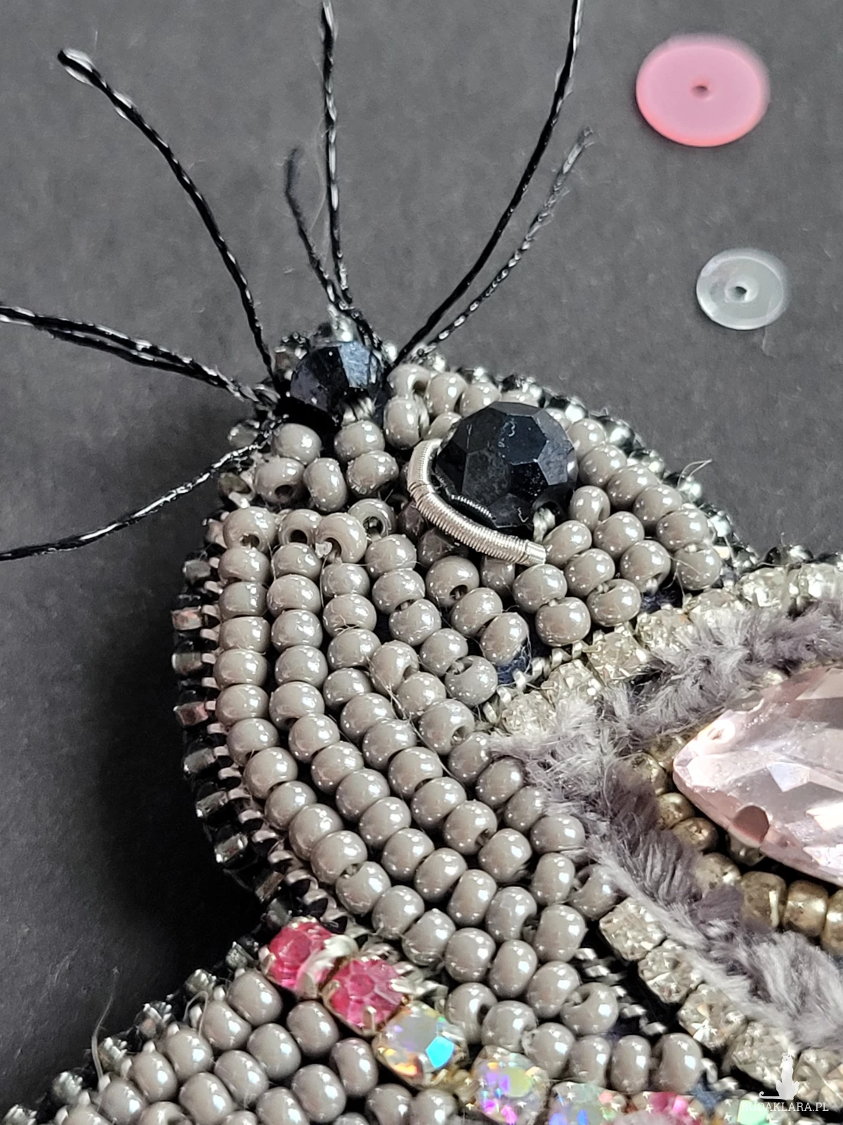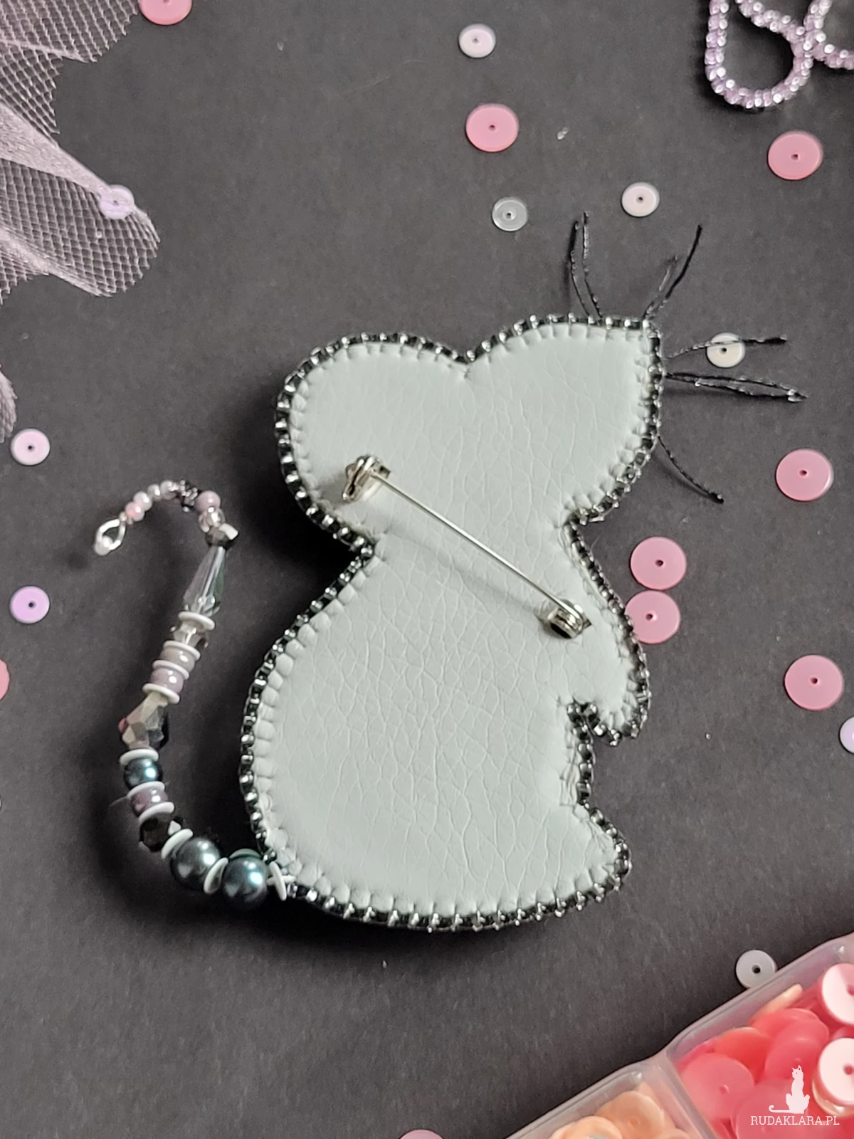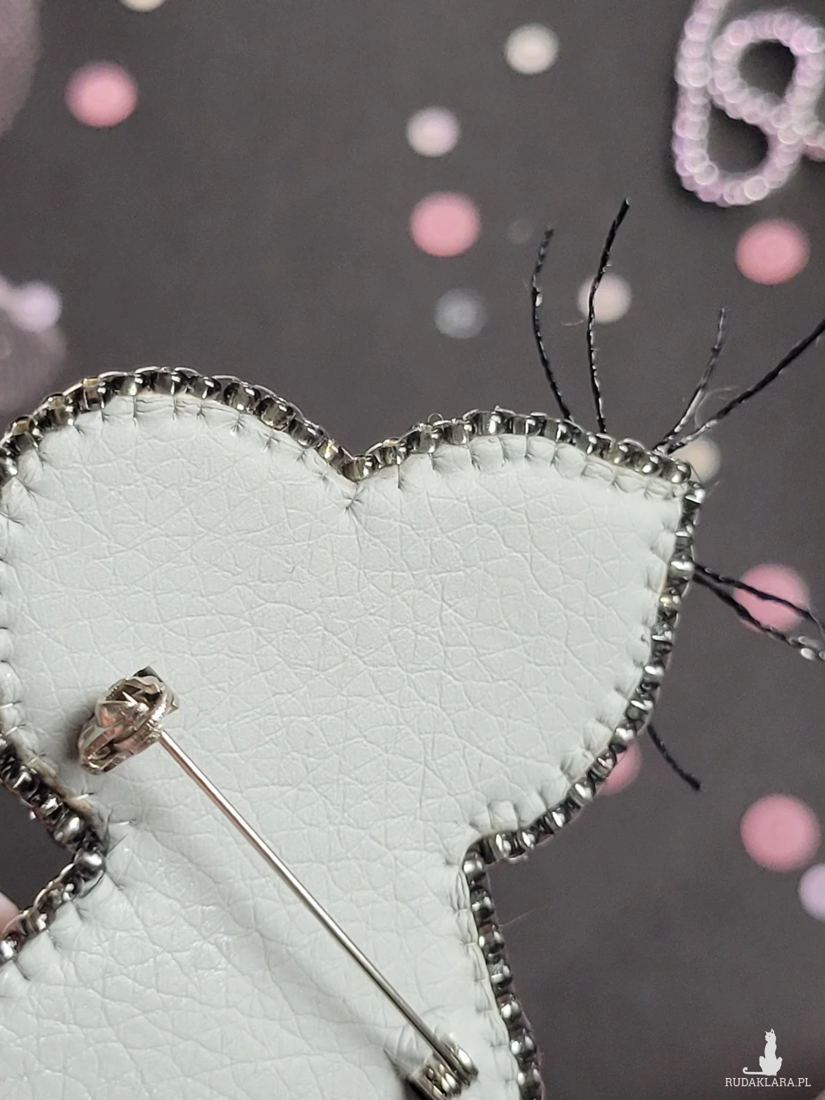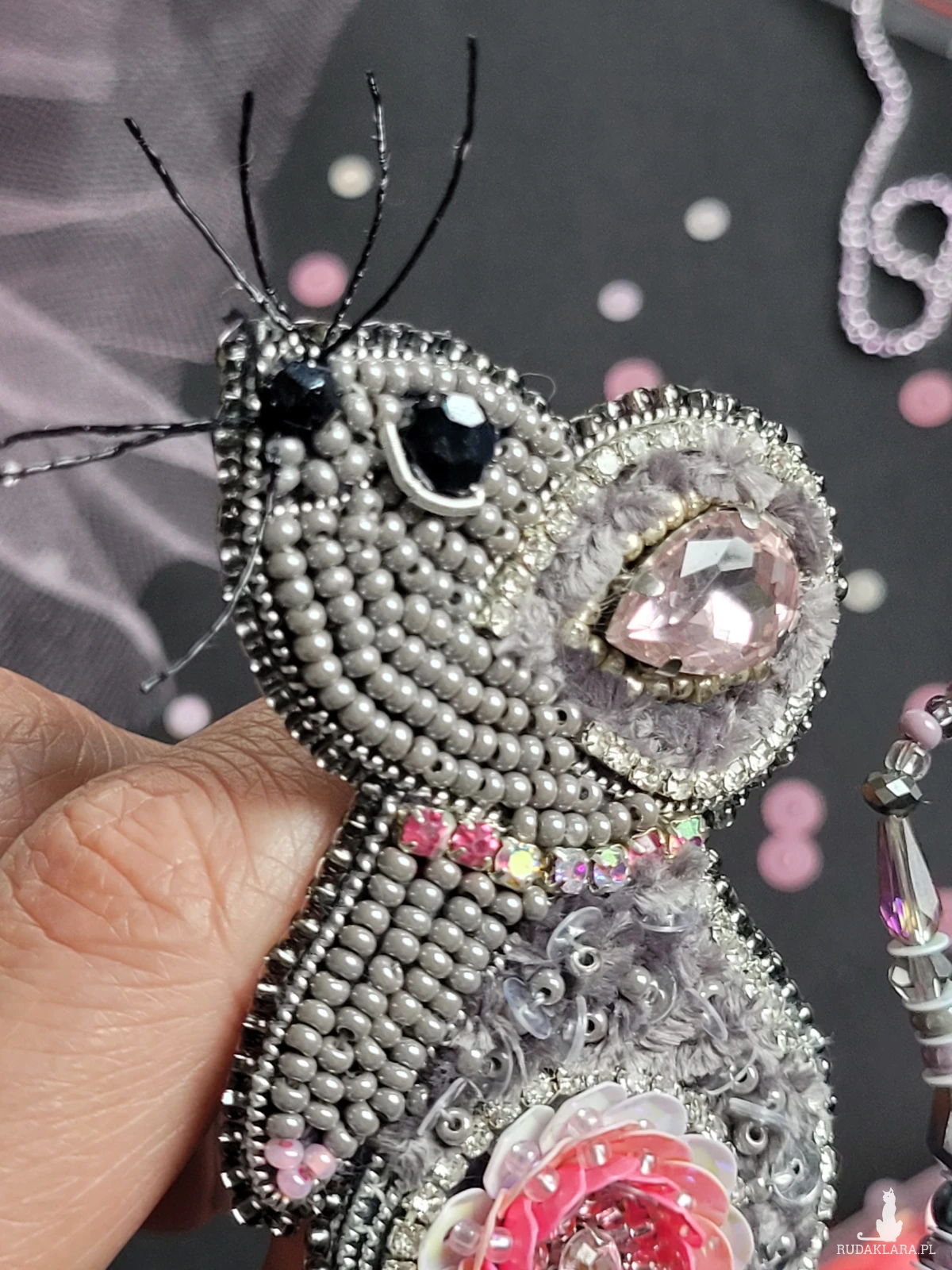 Broszka w kształcie słodkiej myszki z dużymi oczami i błyszczącymi elementami.