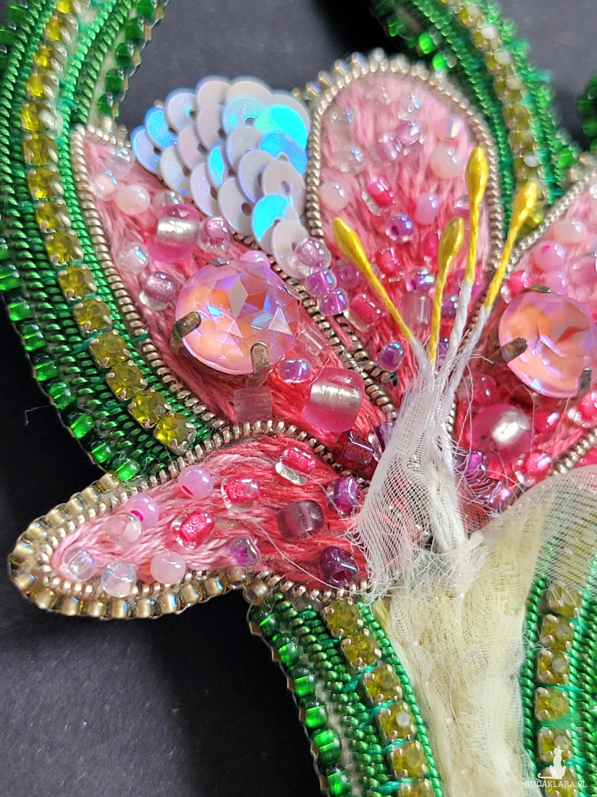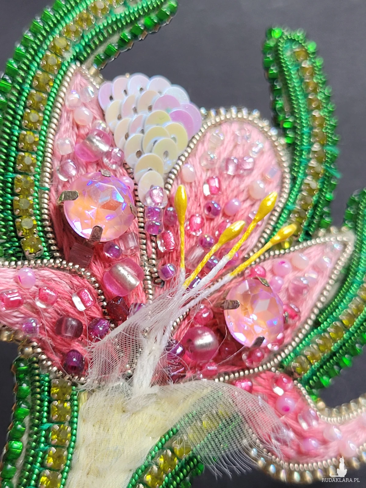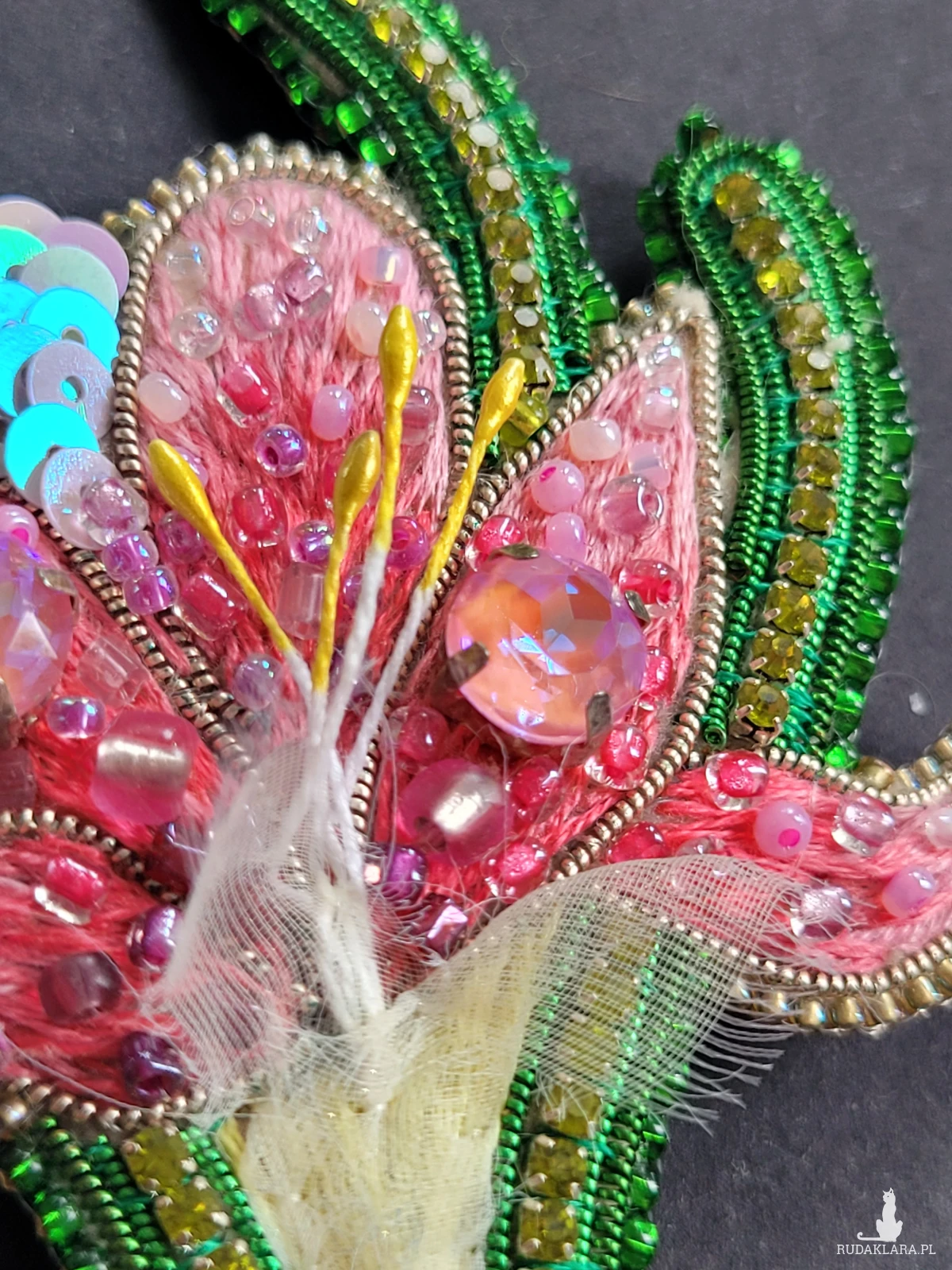 🔸 Materiały: wysokiej jakości szklane koraliki, duże połyskujące kryształy, ozdobne koraliki, tkanina szyfon, skóra ekologiczna (tył broszki).