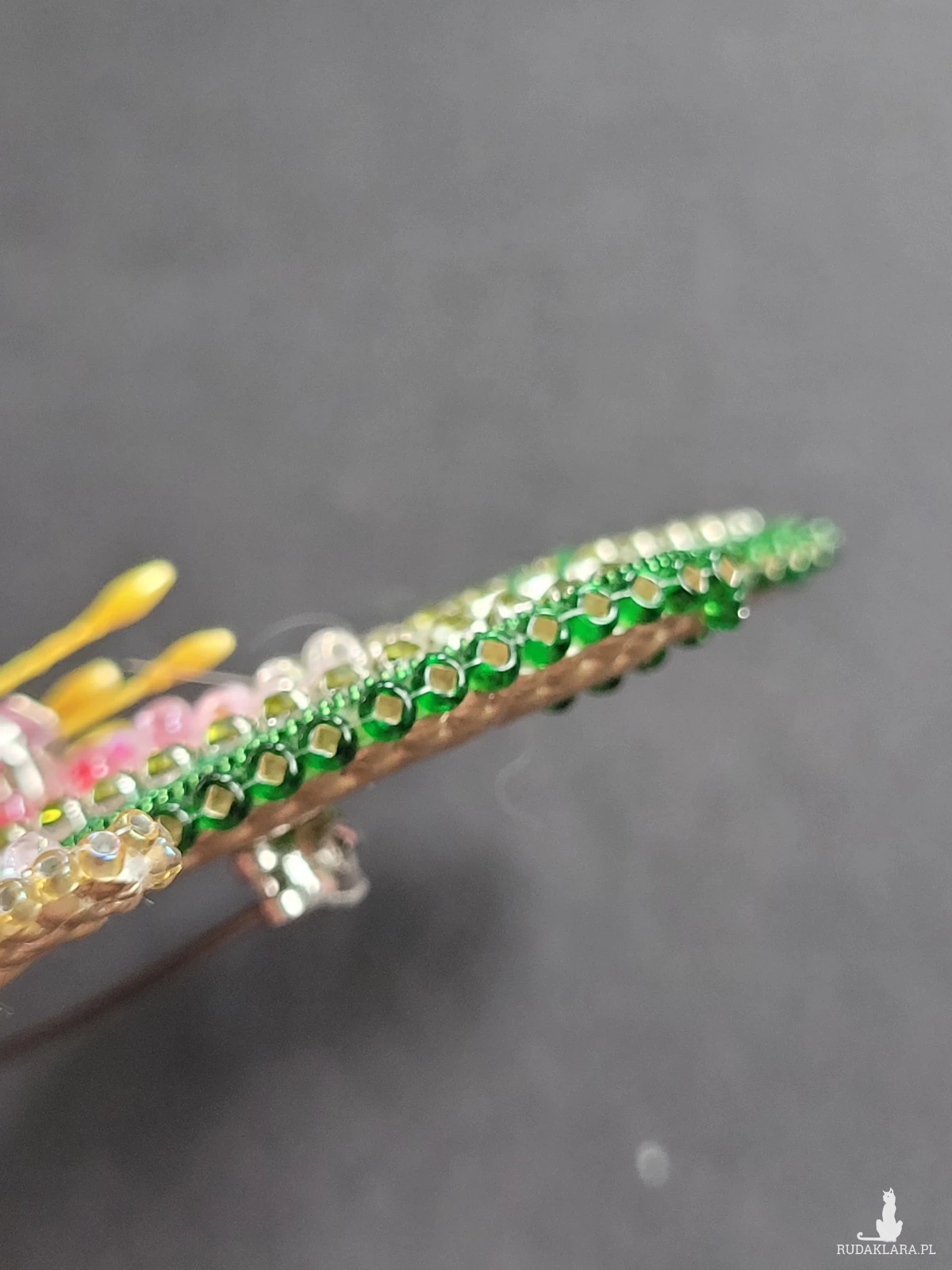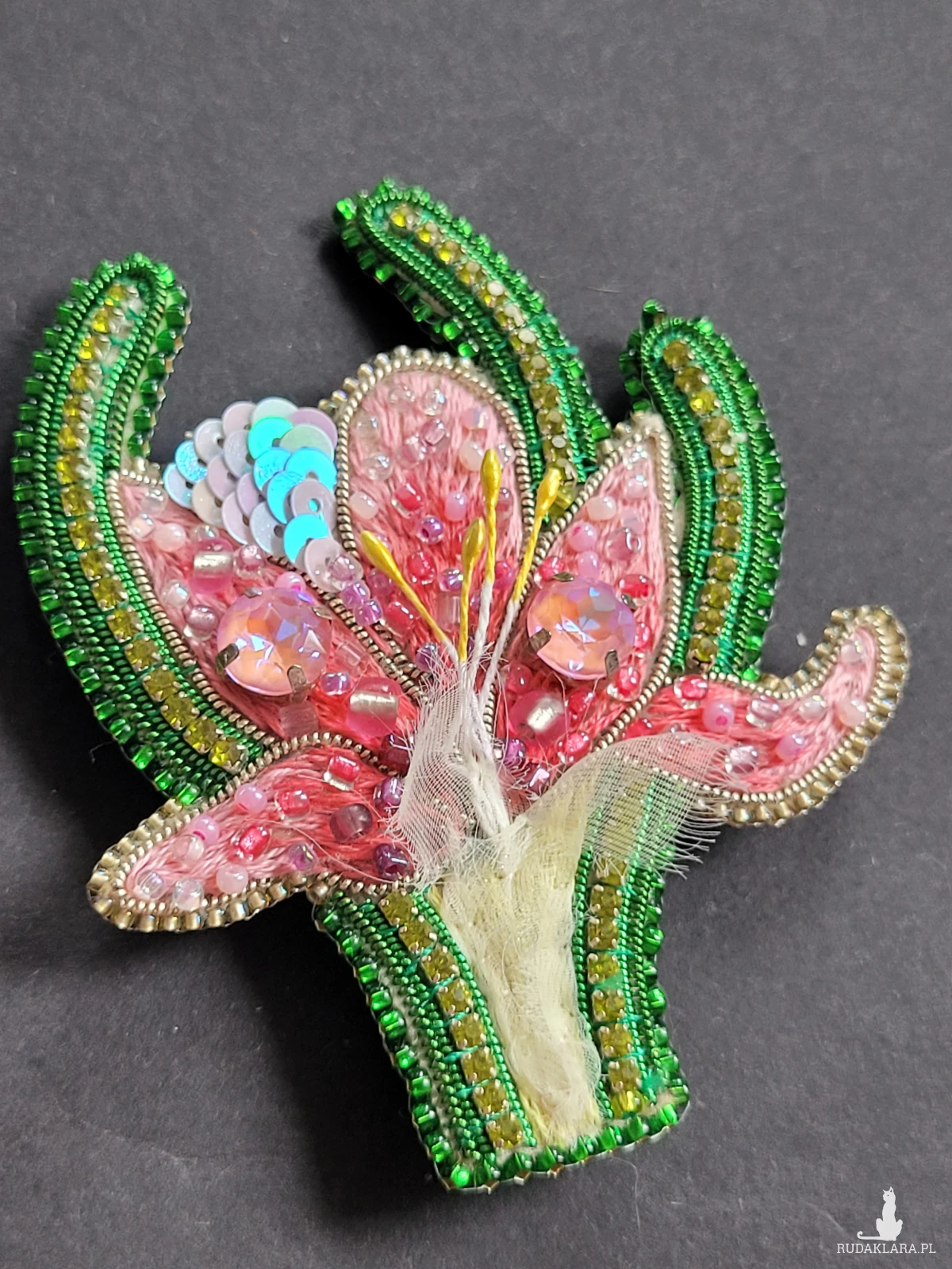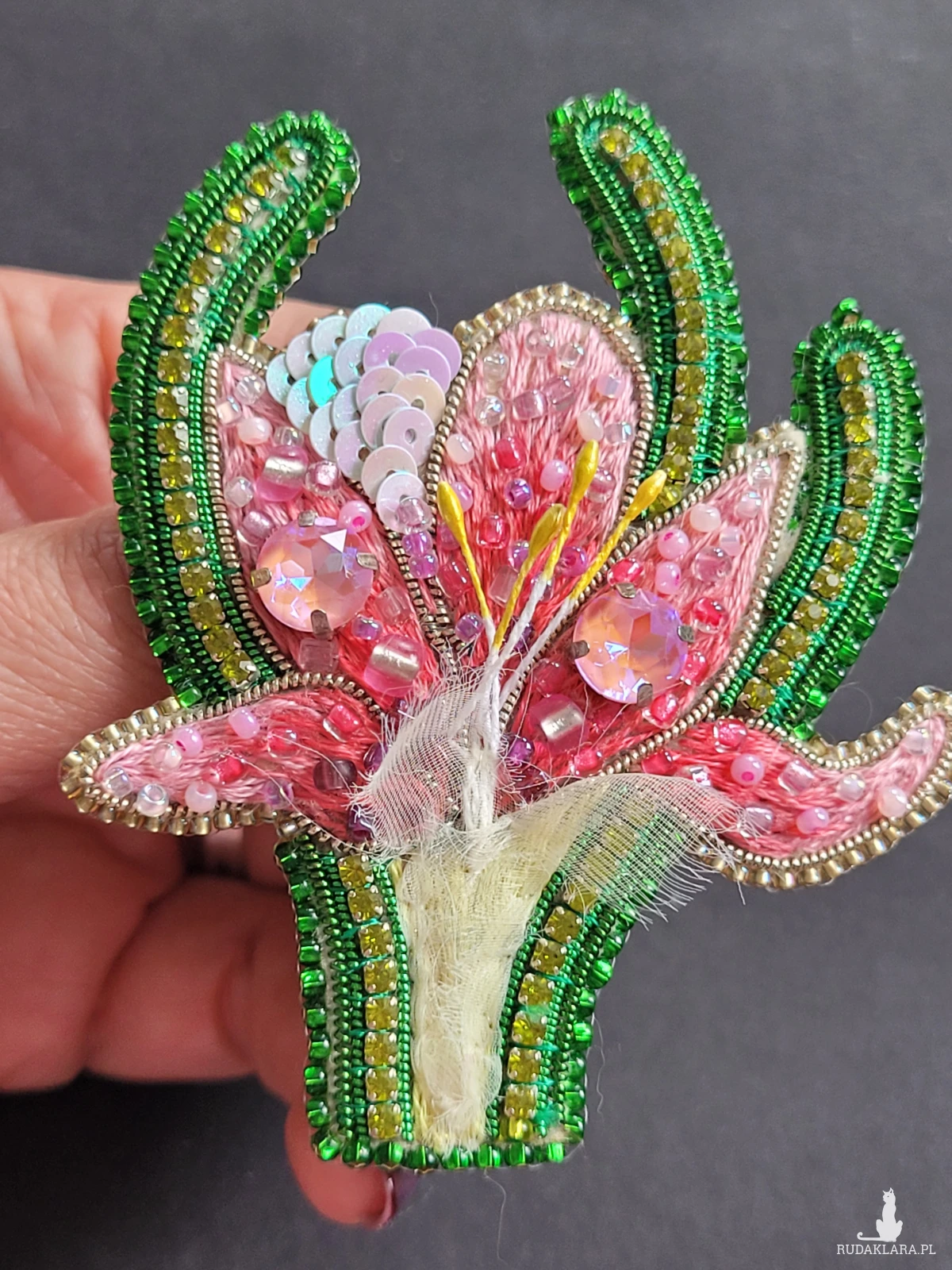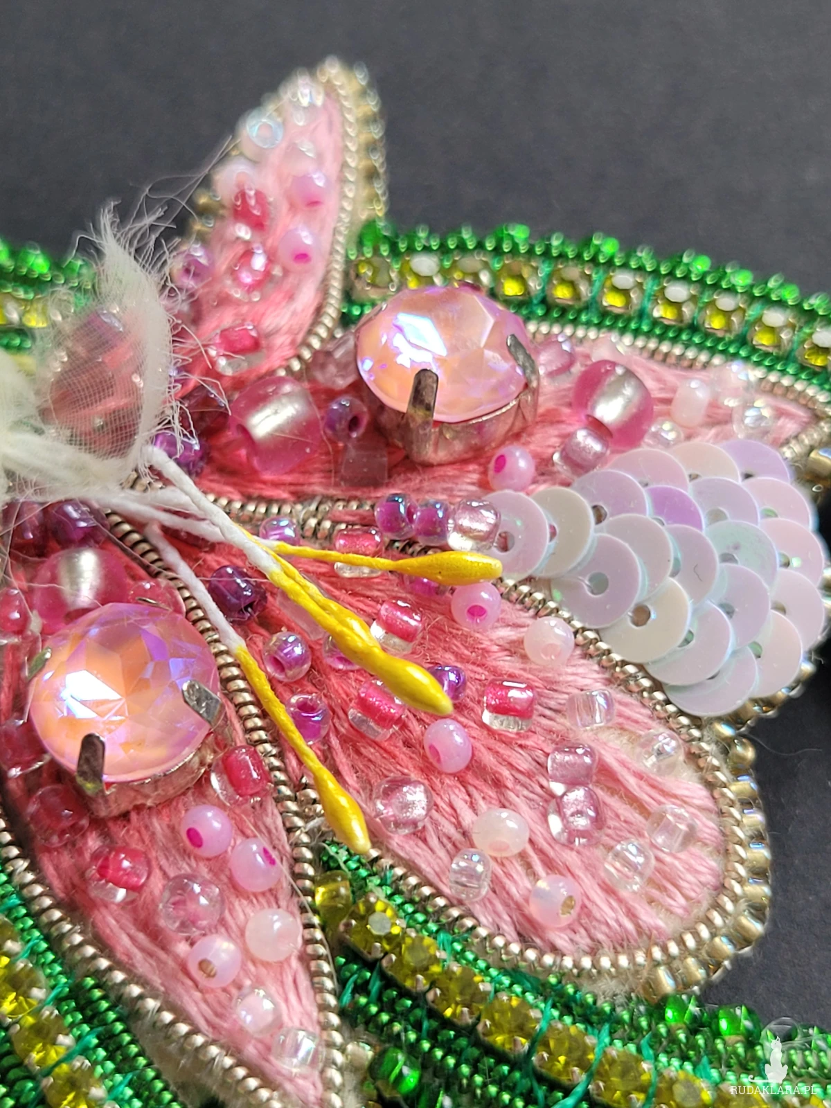 🔸 Materiały: wysokiej jakości szklane koraliki, duże połyskujące kryształy, ozdobne koraliki, tkanina szyfon, skóra ekologiczna (tył broszki).