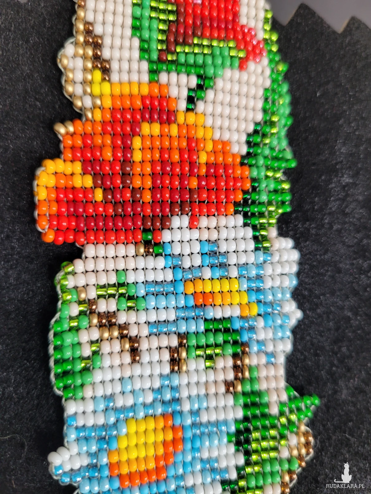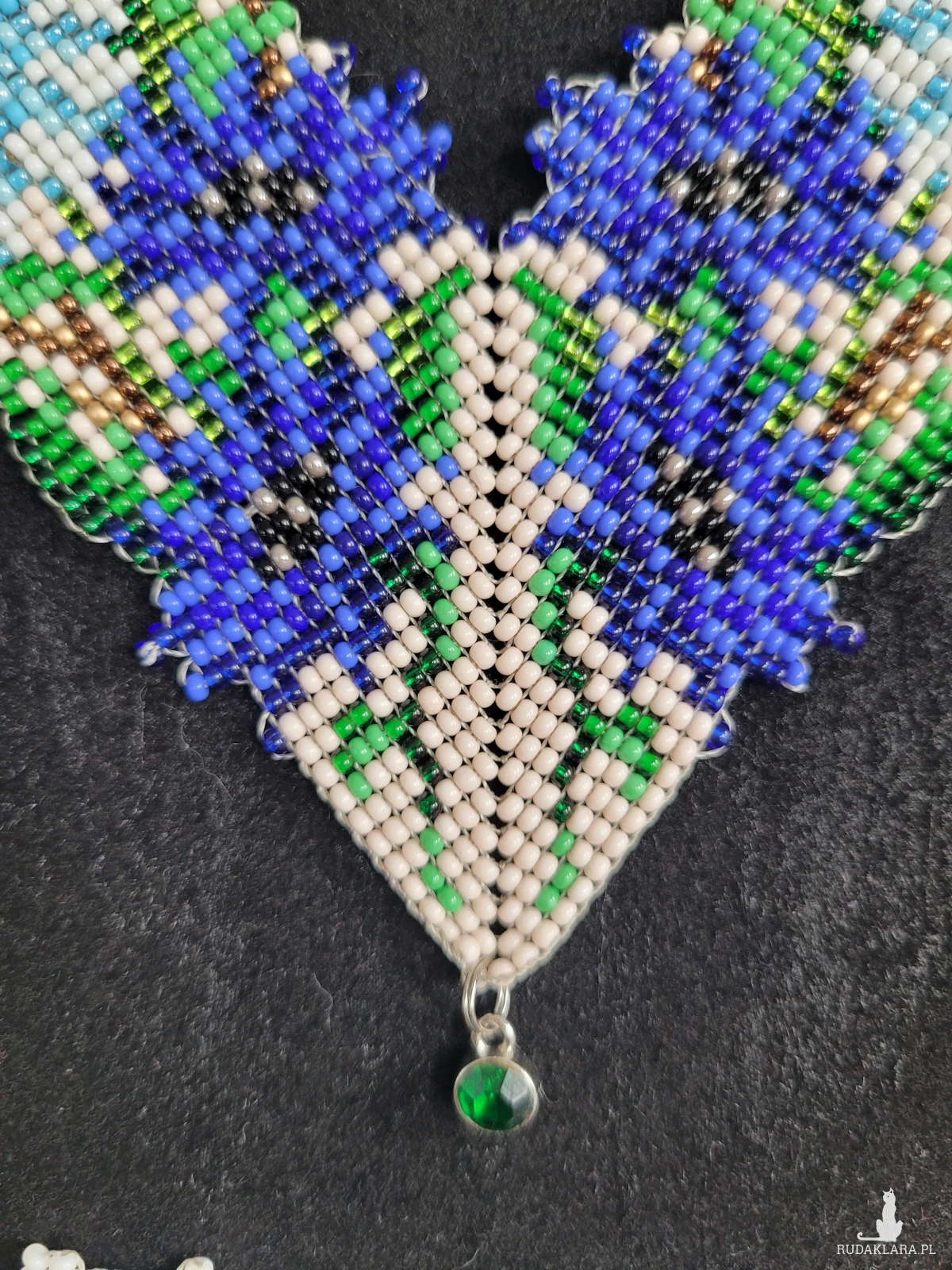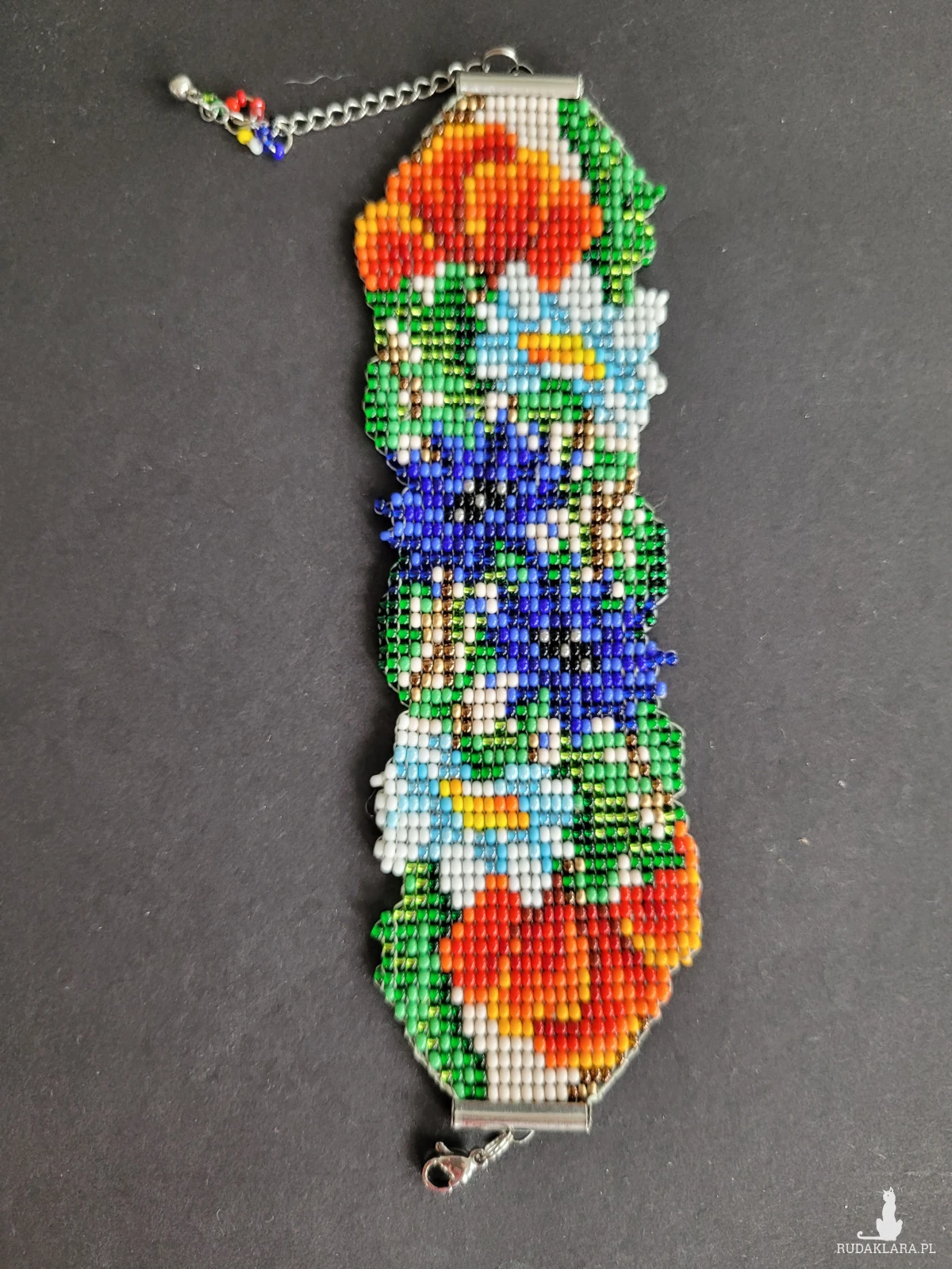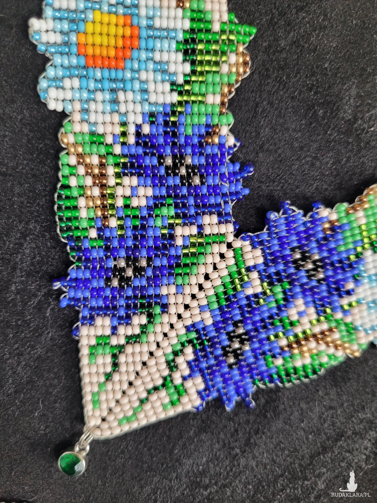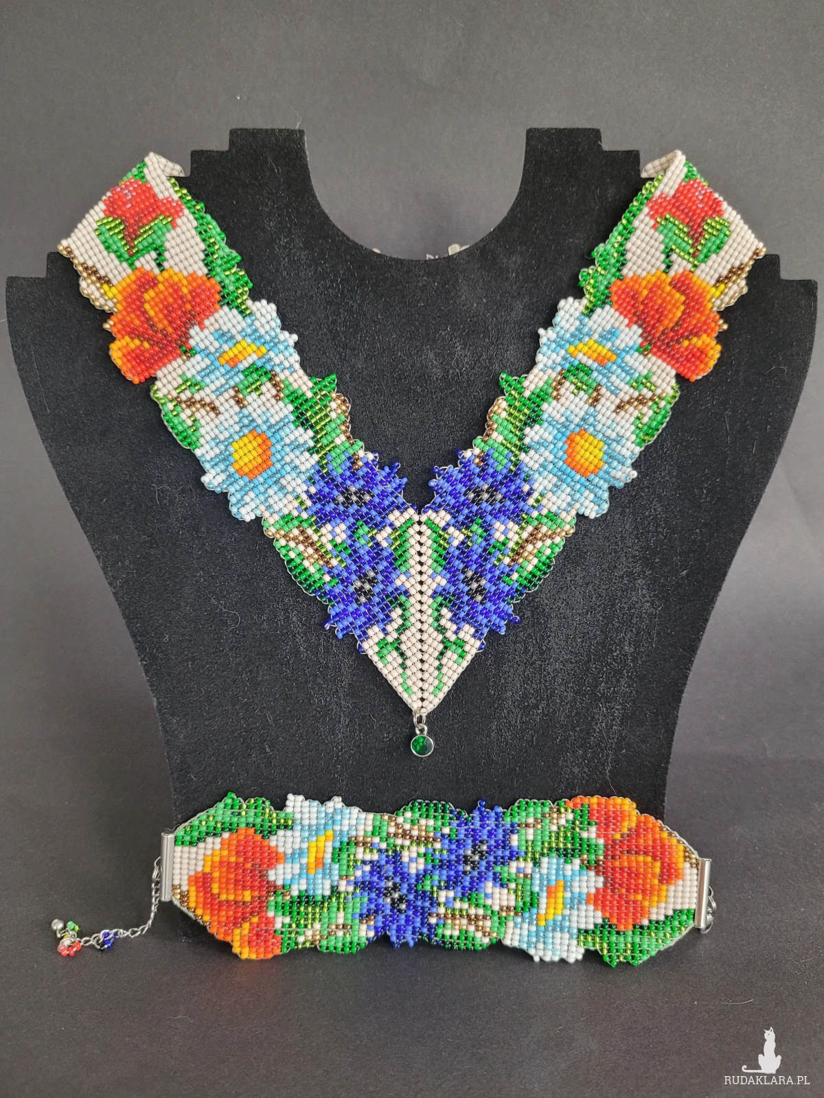 Unikatowy komplet biżuterii wykonany ręcznie metodą tkania koralikami. Wzór inspirowany naturą – piękne kwiaty w intensywnych barwach (niebieskie, żółte, białe i zielone) tworzą niezwykle efektowną i elegancką kompozycję.