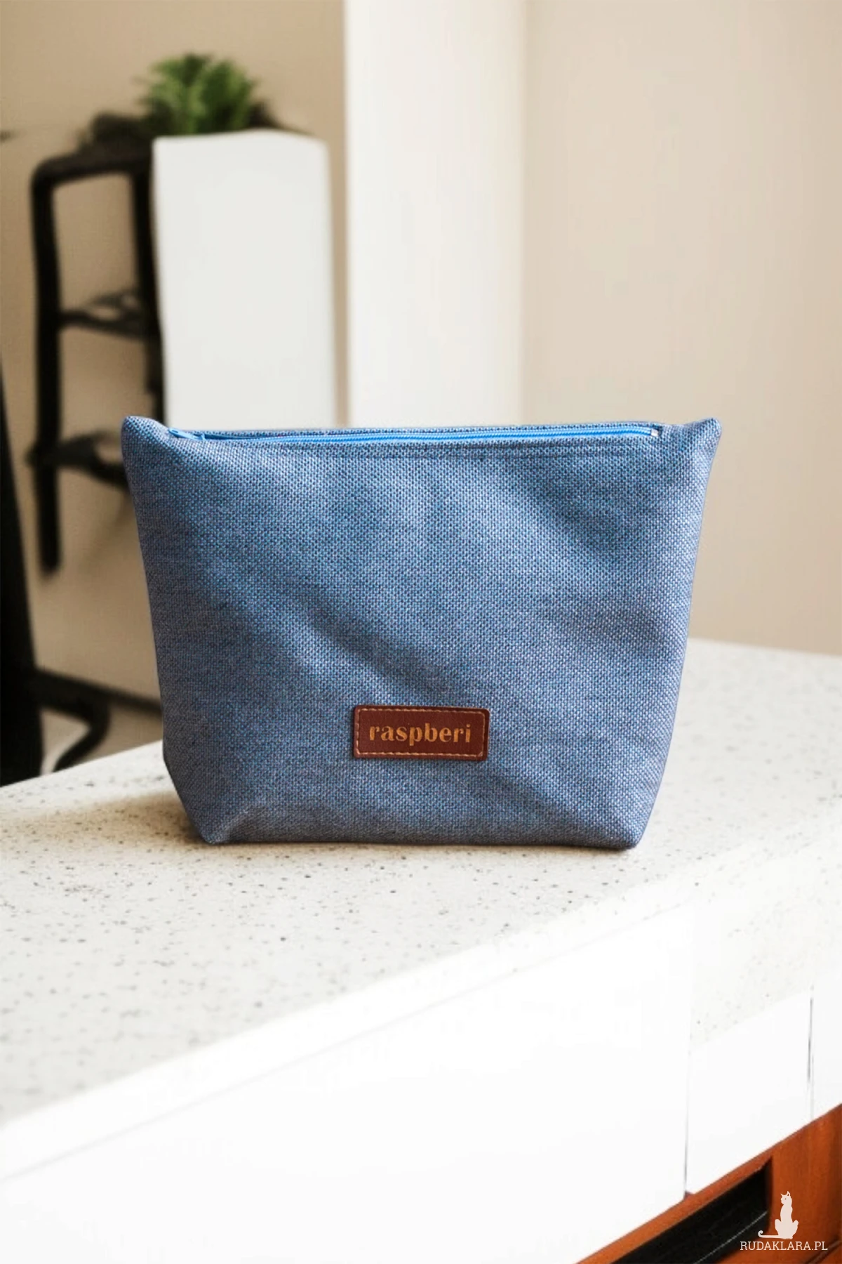 Duża kosmetyczka wykonana z niebieskiej plecionej tkaniny.