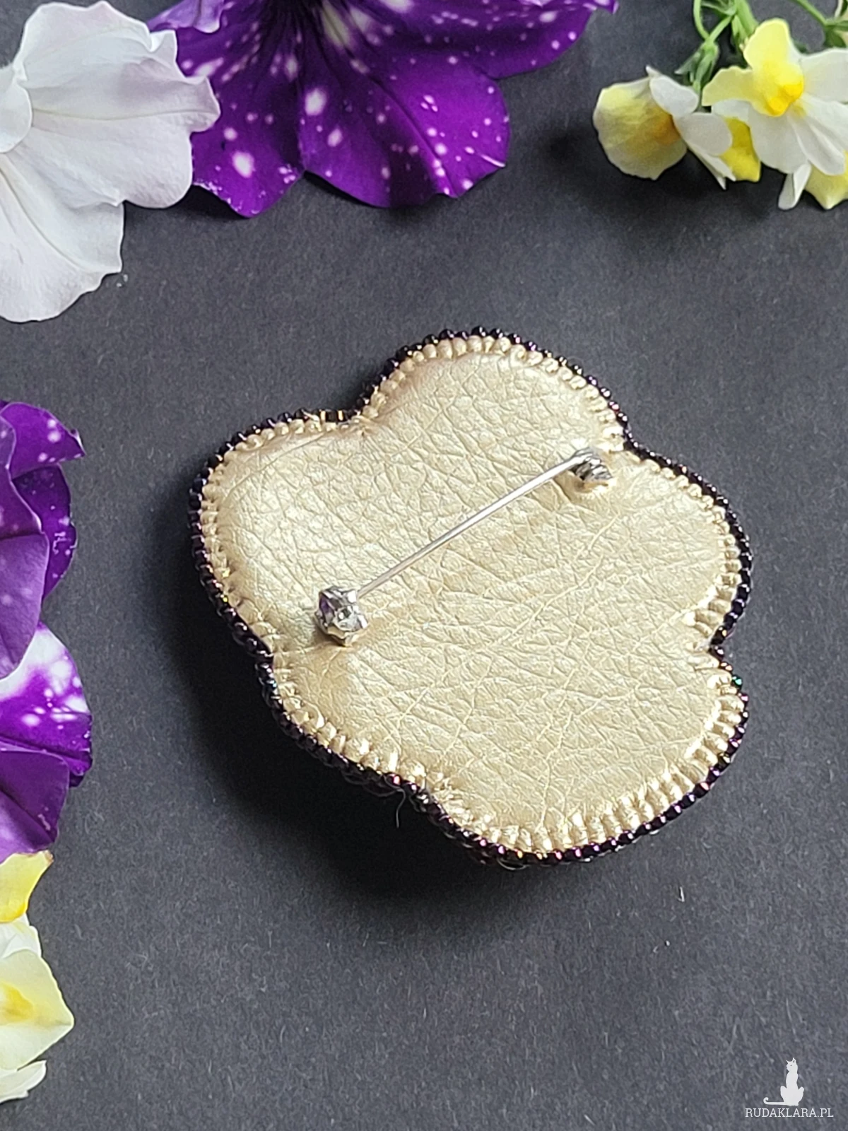 Urocza, ręcznie haftowana broszka przedstawiająca kwiat bratka.