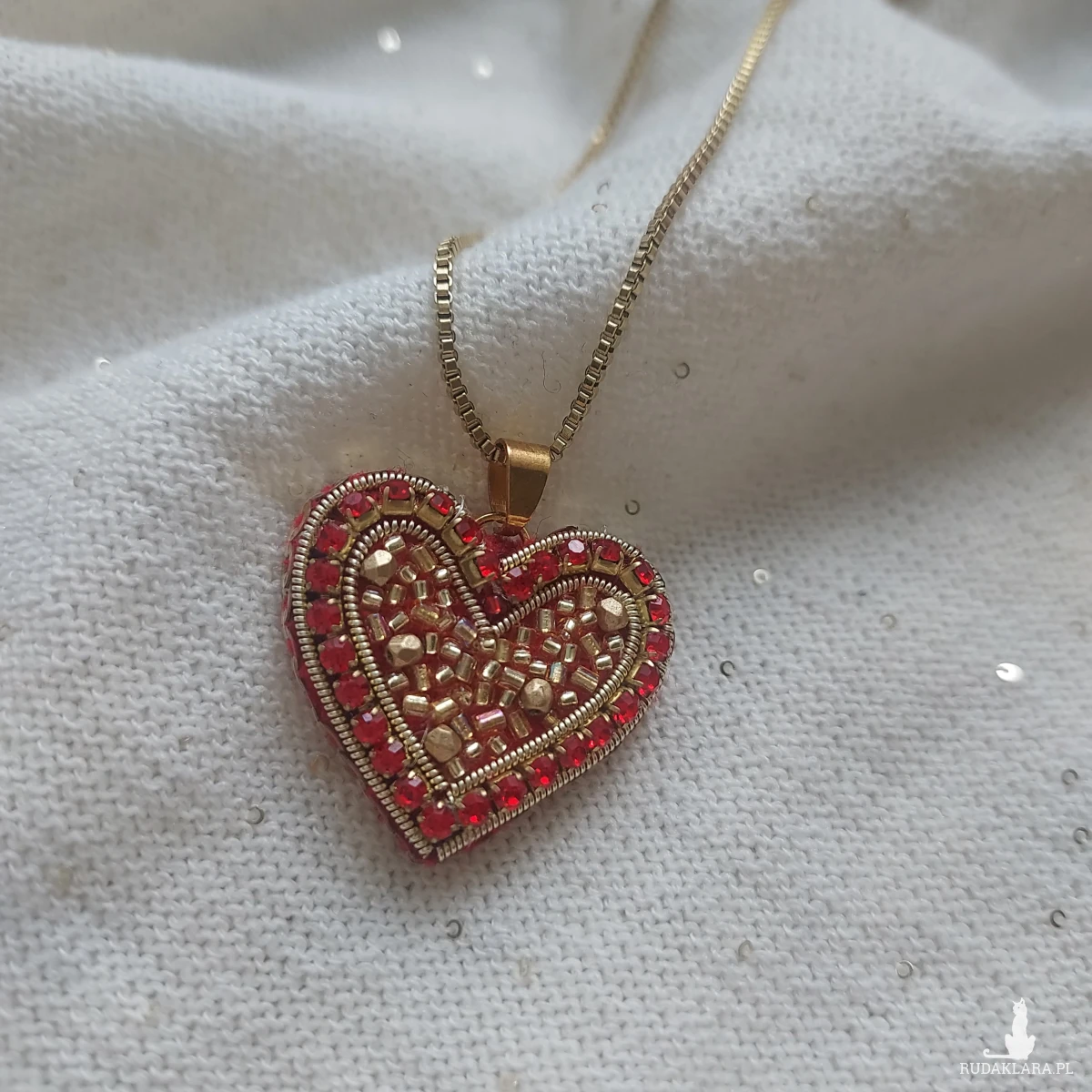 Czeewono-złote serce- uroczy, pełen blasku, niepowtarzalny powstał techniką haftu koralikowego.