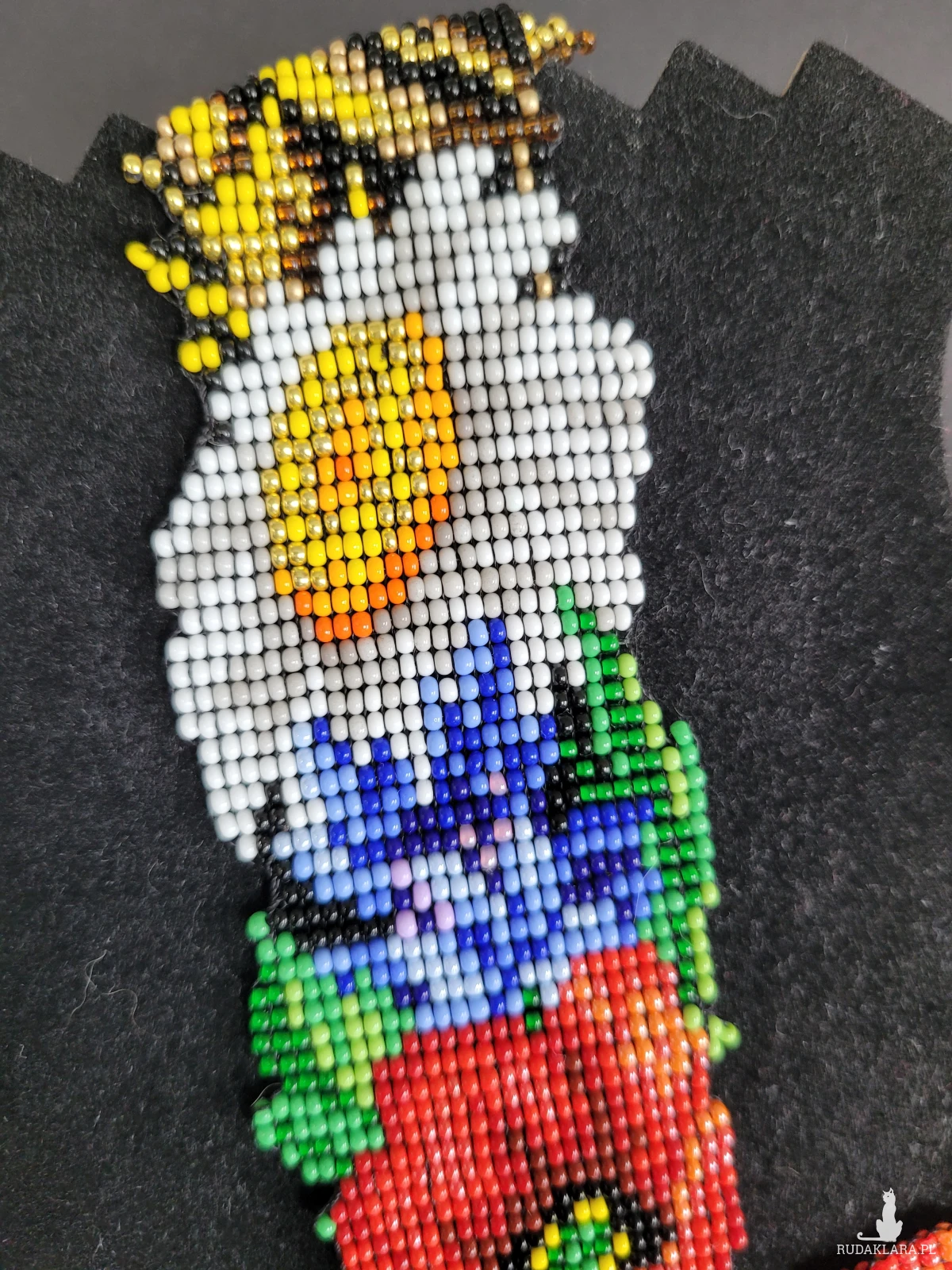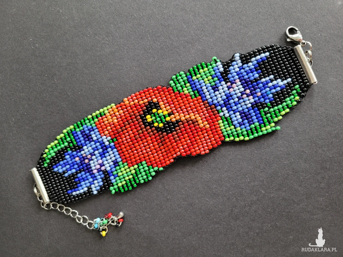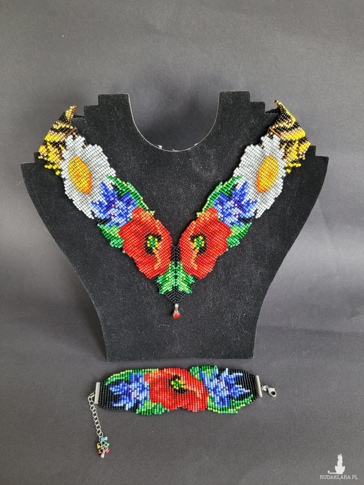 Unikatowy komplet biżuterii wykonany ręcznie metodą tkania koralikami. Wzór inspirowany naturą – piękne kwiaty w intensywnych barwach (niebieskie, żółte, białe i zielone) tworzą niezwykle efektowną i elegancką kompozycję.