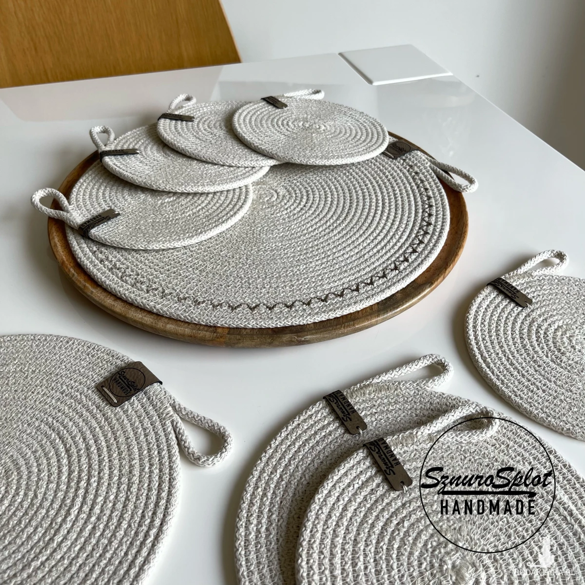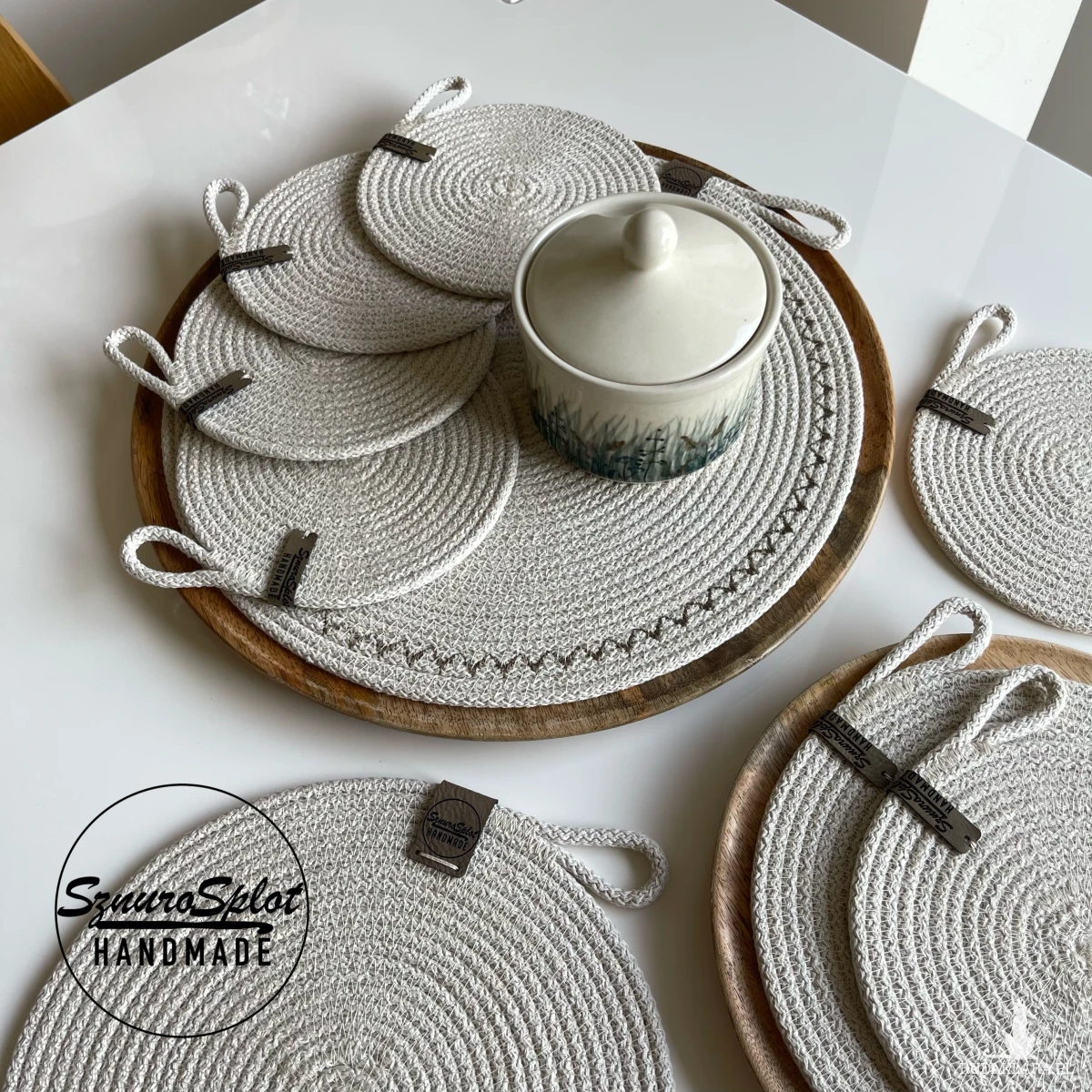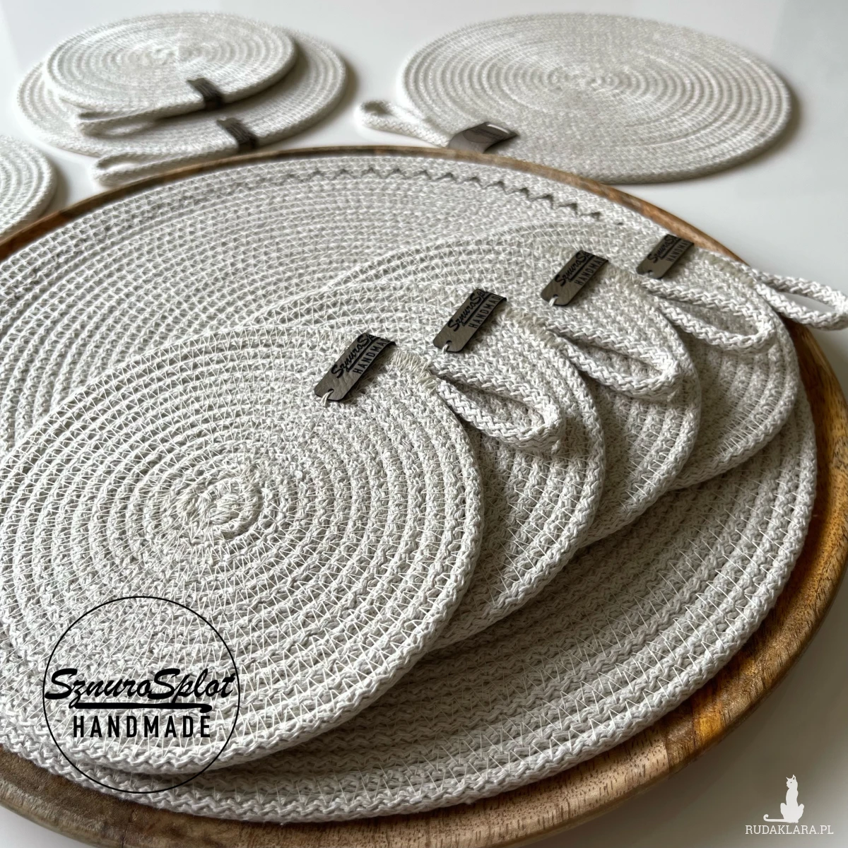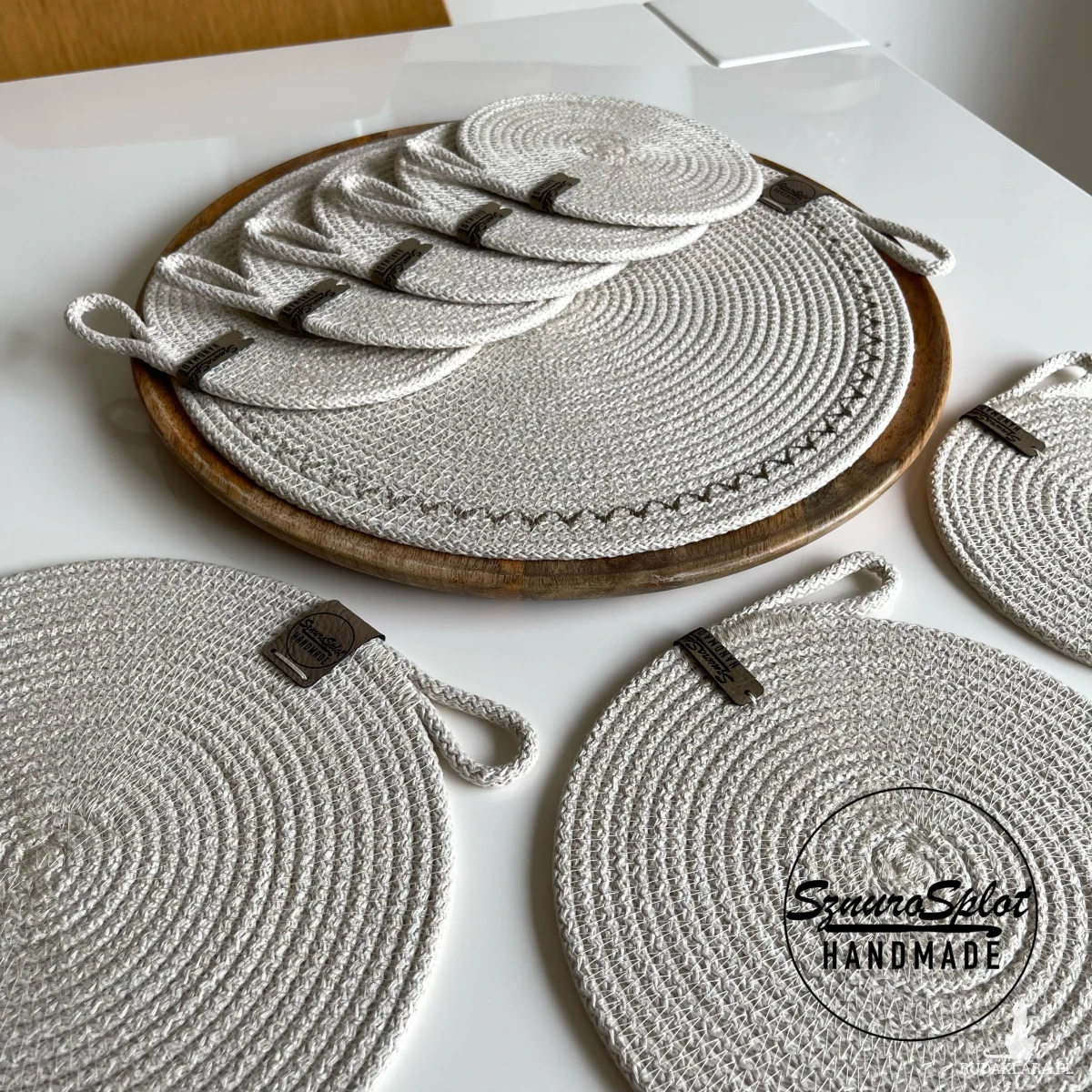 Nowy wzór dziewięciu podkładek uszytych ze sznurka bawełnianego.
