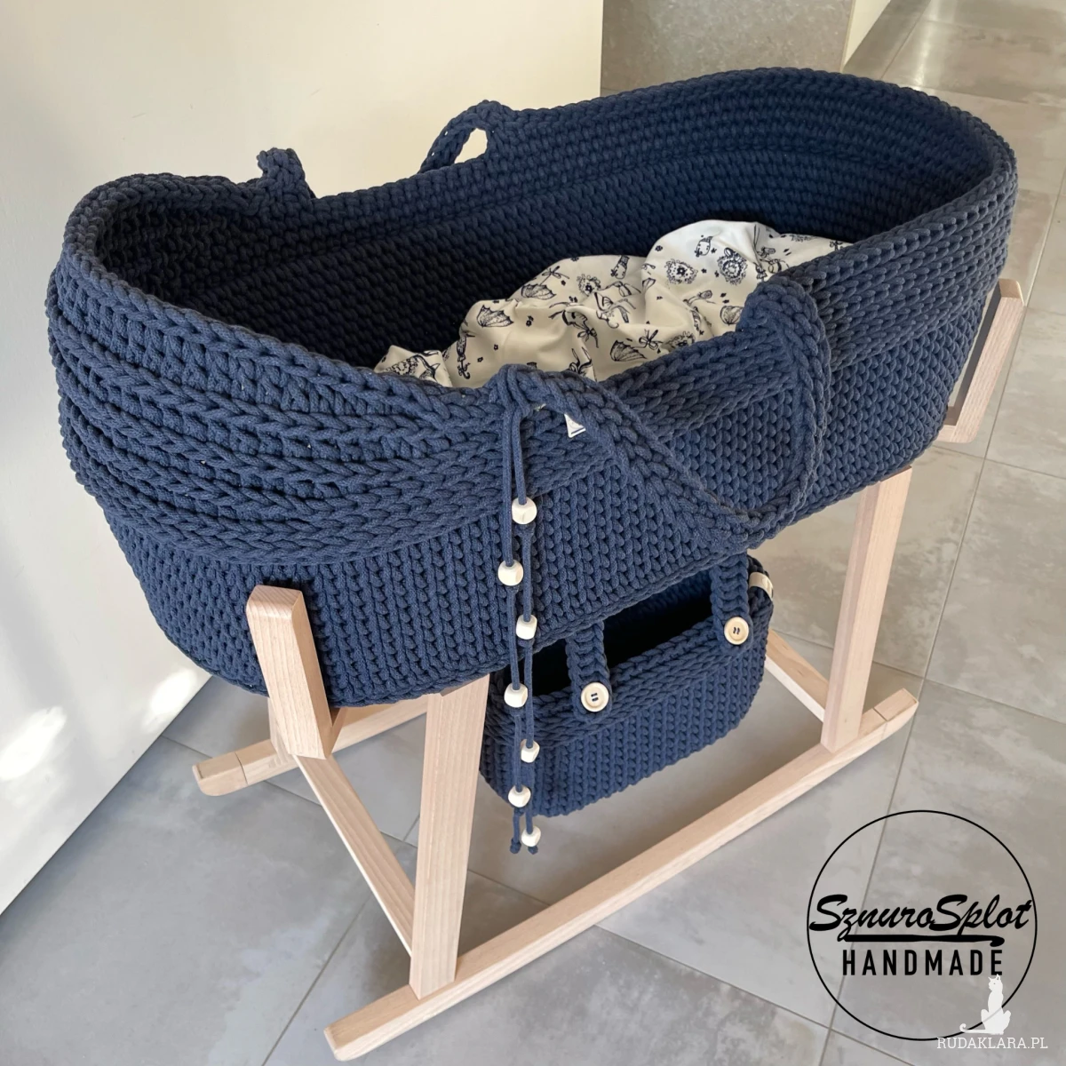 Kosz na bazie grubej sklejki, wykonany szydełkiem ze sznurka bawełnianego - odpowiedni dla noworodka. Gdy z niego wyrośnie może służyć jako kosz na zabawki. Jest miły w dotyku. Wzór wykonany w kolorze 47 ze wzornika. Wydziergany jest bardzo ściśle - nie ma prześwitów i śladów łączeń kolejnych rzędów. Cena dotyczy kosza.
