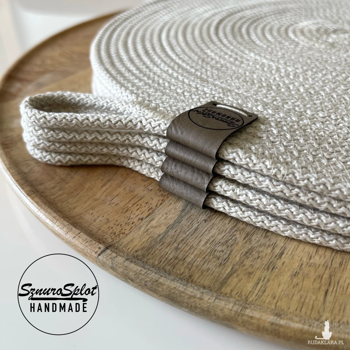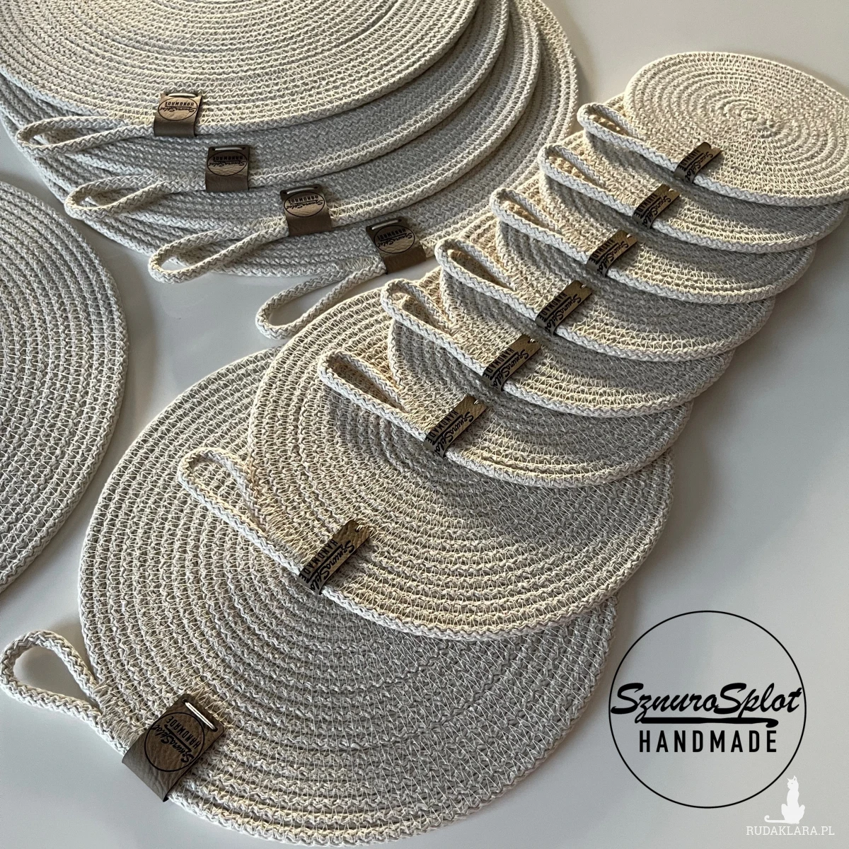 Komplet dziesięciu podkładek uszytych ze sznurka bawełnianego.