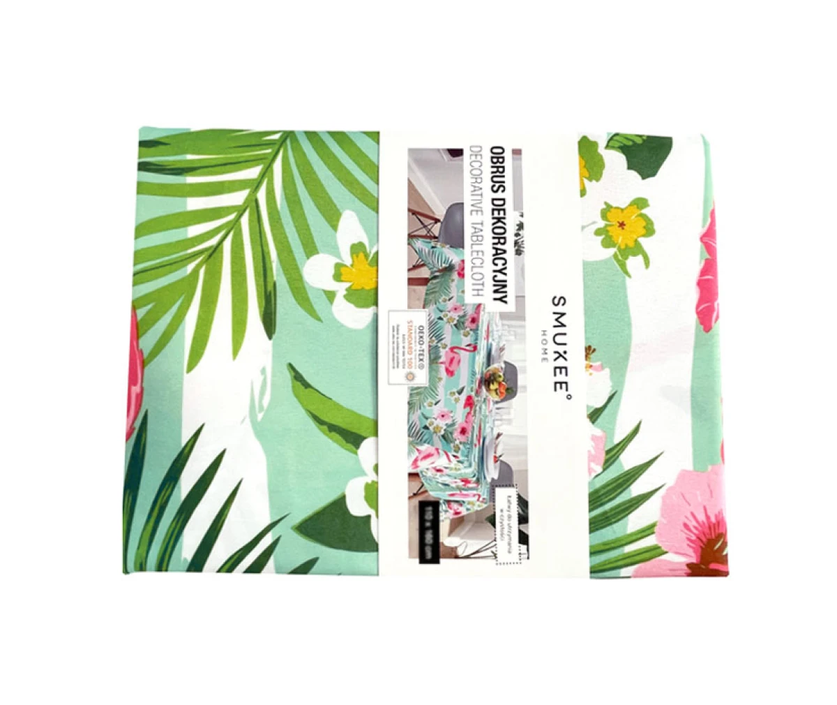 Nowy obrus ze wzorem we flamingi, liście i kwiaty. Rozmiar: 110 x 160 cm, materiał poliester 100 %, plamoodporny. Prać w 30 stopniach, certyfikat "OEKO-TEX Standard 100". Dekoracyjny obrus na stół do salonu, jadalni, kuchni, restauracji, kawiarni itp.
