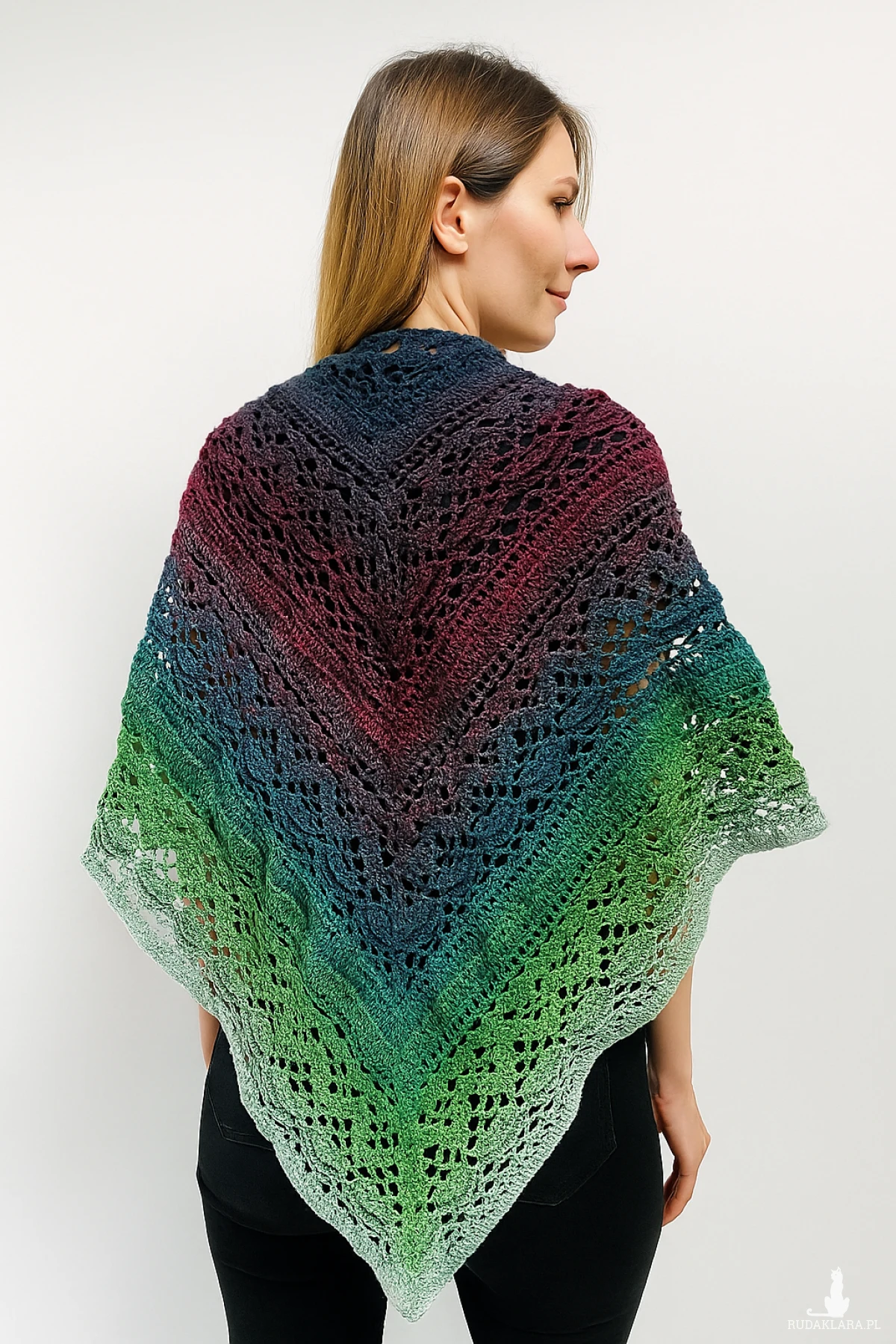 Chustę Klaziena wykonałam na szydełku z wysokiej jakości włóczki ombre Yarn Art Flowers, 250 g, która zachwyca intensywnością koloru i delikatnością. Przędza bawełniano-akrylowa charakteryzuje się trwałością, sprężystością i miękkością.
