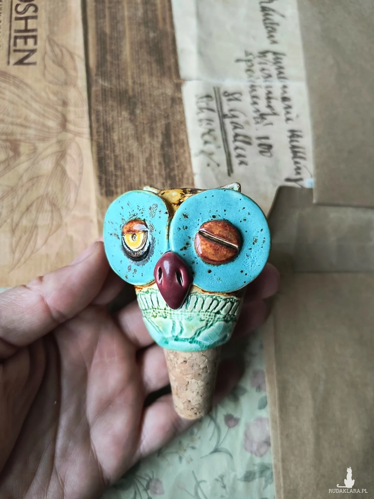 Korek do wina z nasadką z ceramiki w postaci sowy. W stylu vintage. Wymiary ok 5 x 7,5 cm. Serdecznie polecam jako miły upominek dla bliskiej sercu osoby. Układ kolorów może nieznacznie się różnić od tego na zdjęciu.