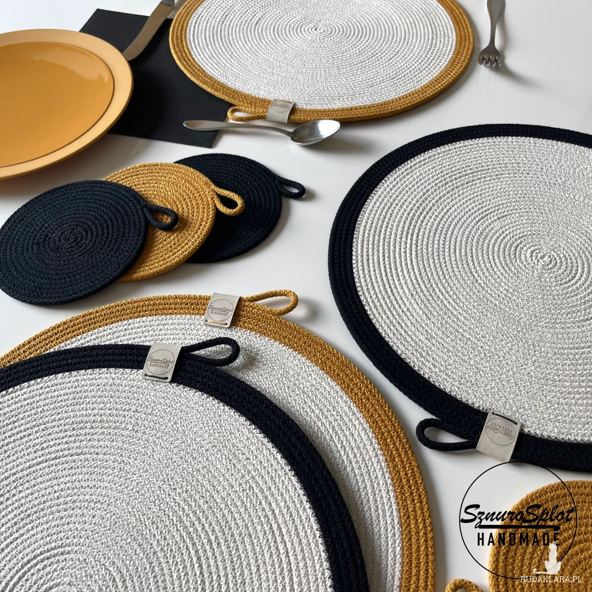 Komplet ośmiu podkładek uszytych ze sznurka bawełnianego.