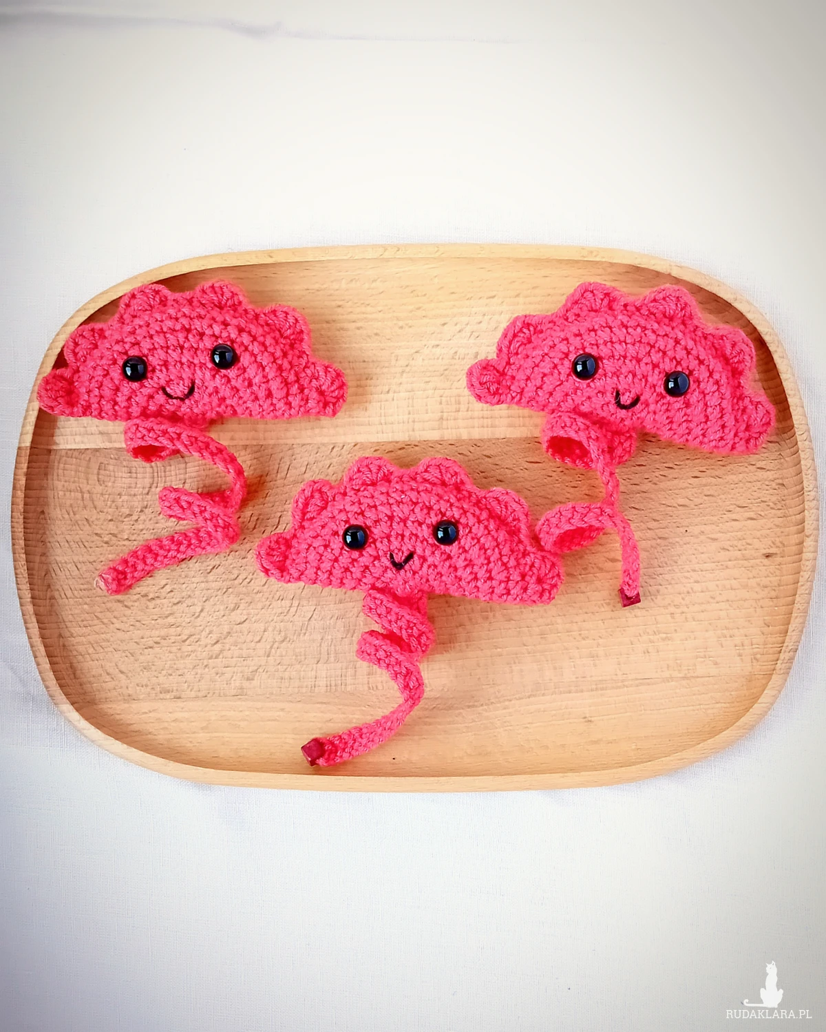 Pierożki wykonałam na szydełku, buźka jest przyszyta, a plastikowe oczka są zabezpieczone w środku przed wypadnięciem. Sznureczek przechodzący przez książkę jest dość elastyczny i rozciąga się od 22 do 28 cm, więc dopasuje się do różnych rozmiarów książek. Sznureczek jest zakończony kolorowym koralikiem.