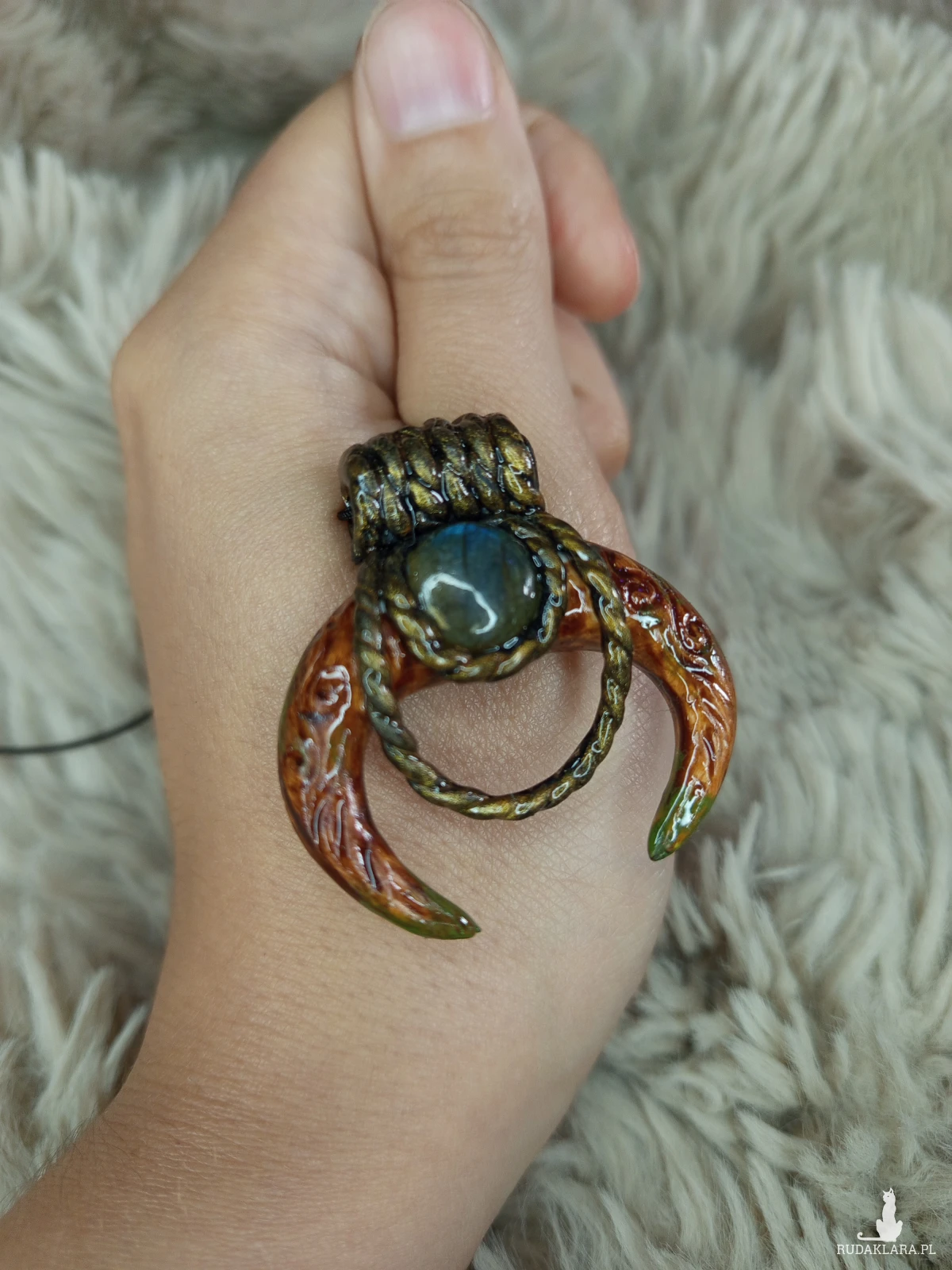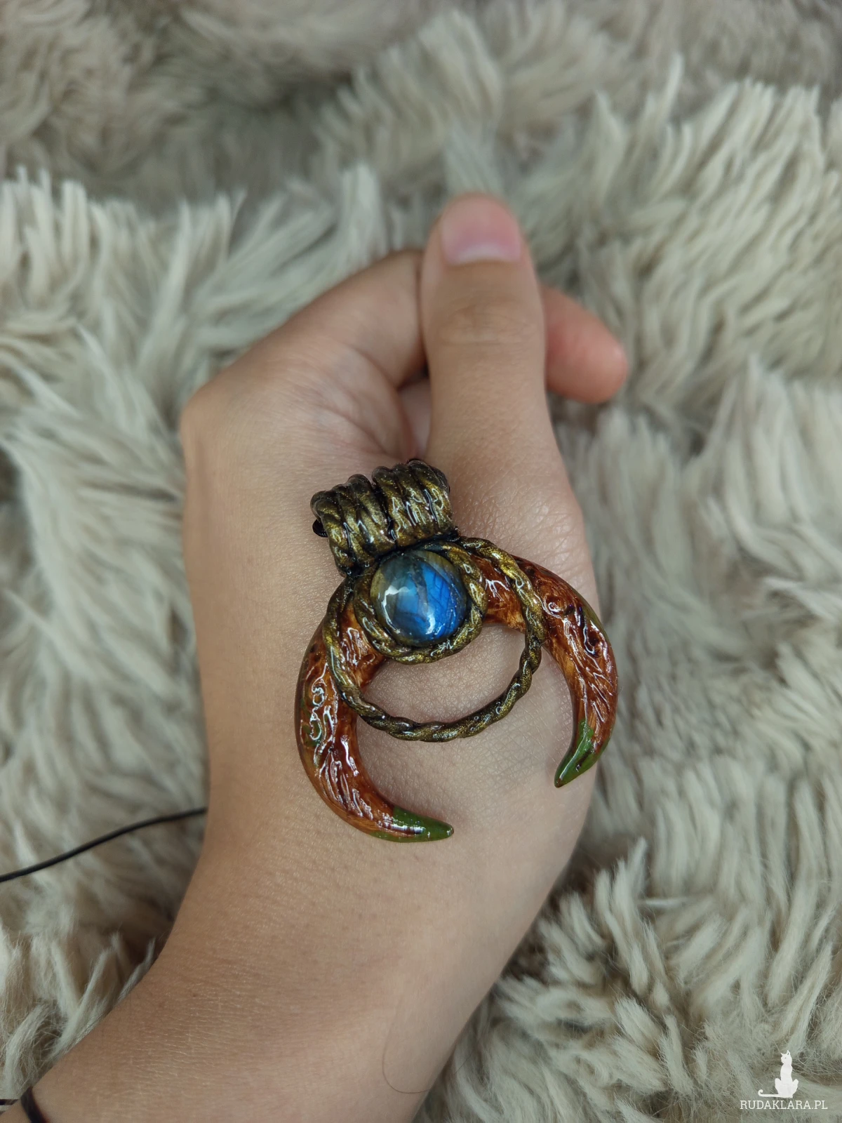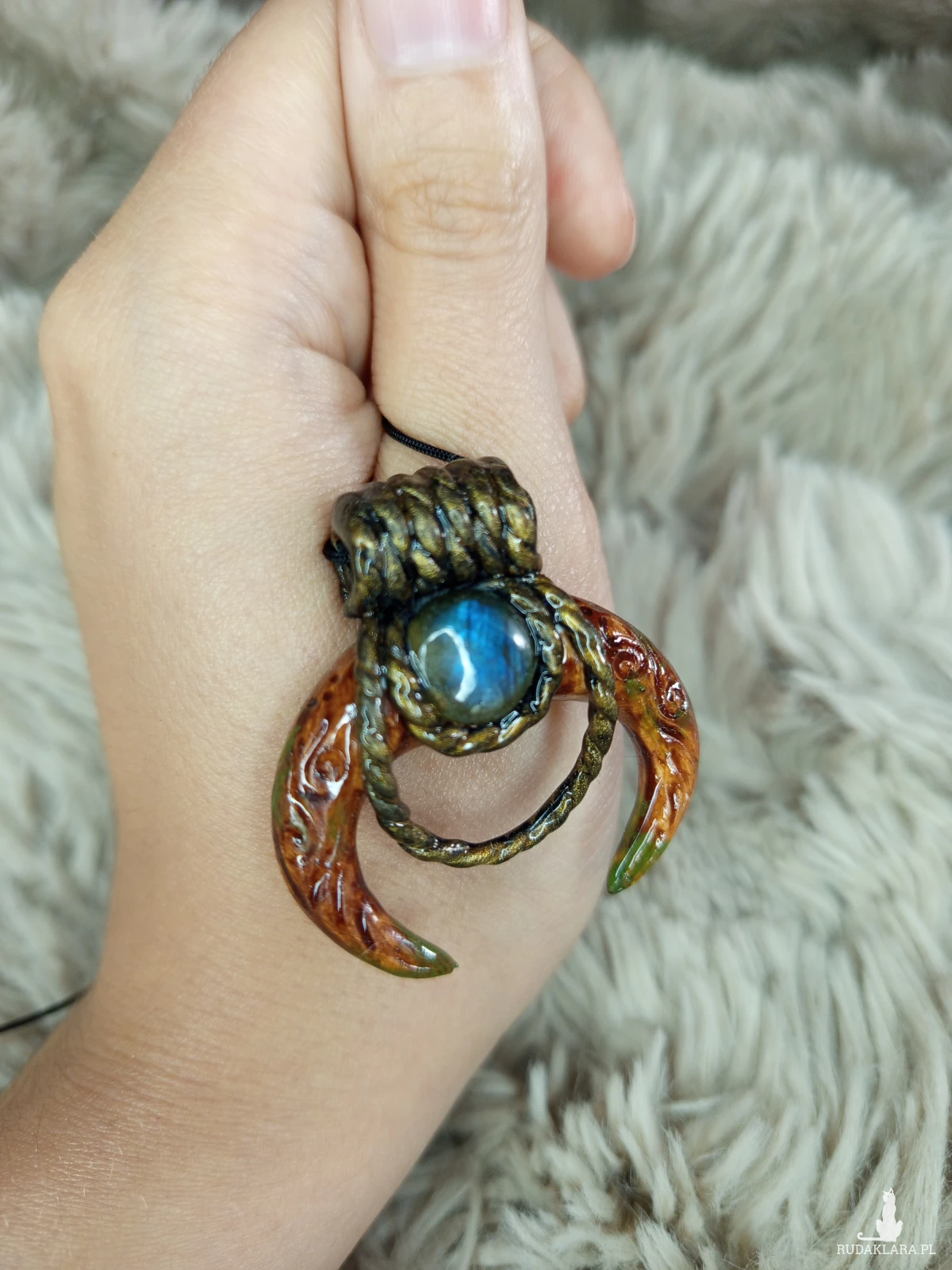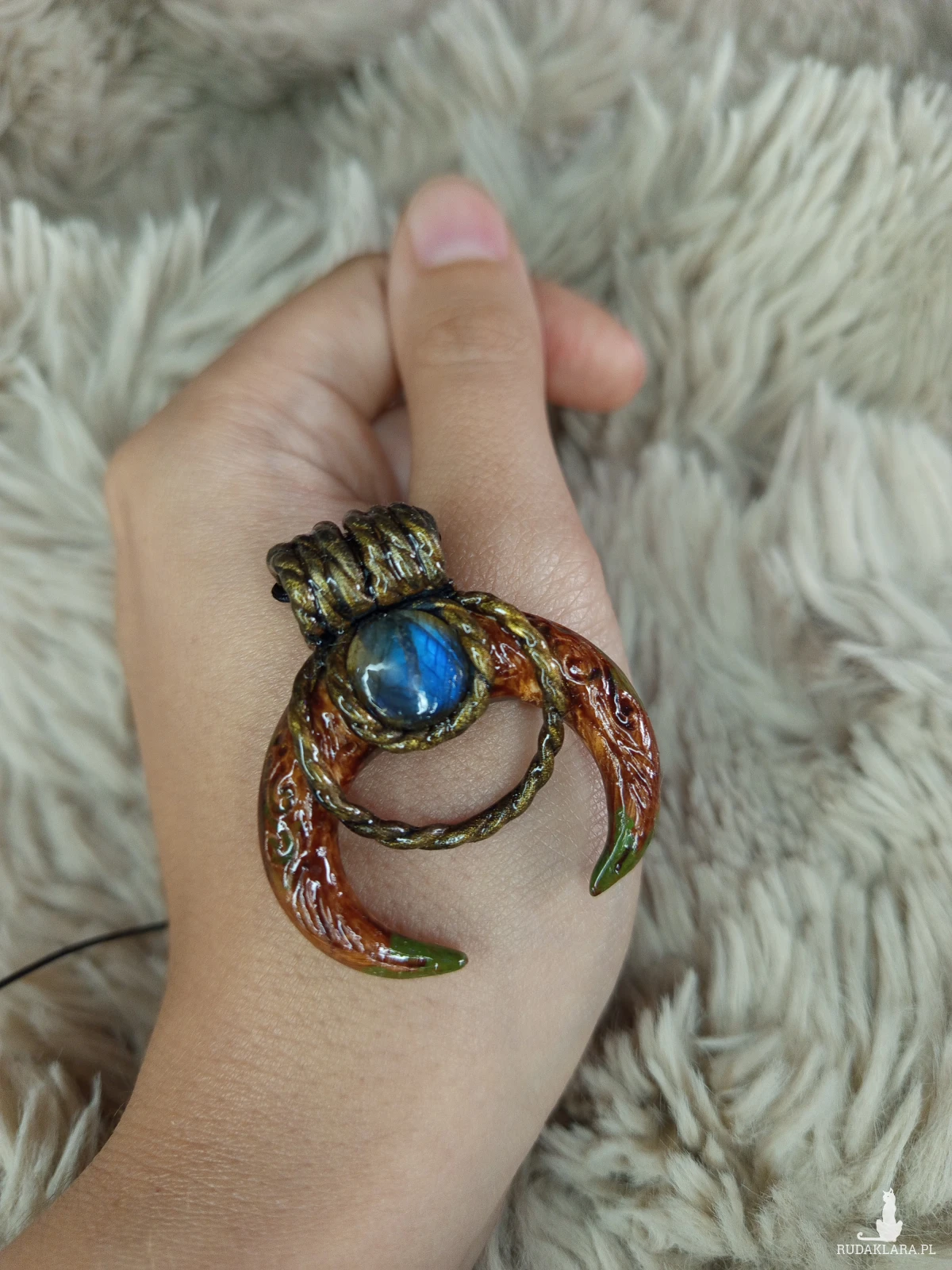 naszyjnik z masy polimerowej z labardorytem, ręcznie rzeźbiony oraz malowany