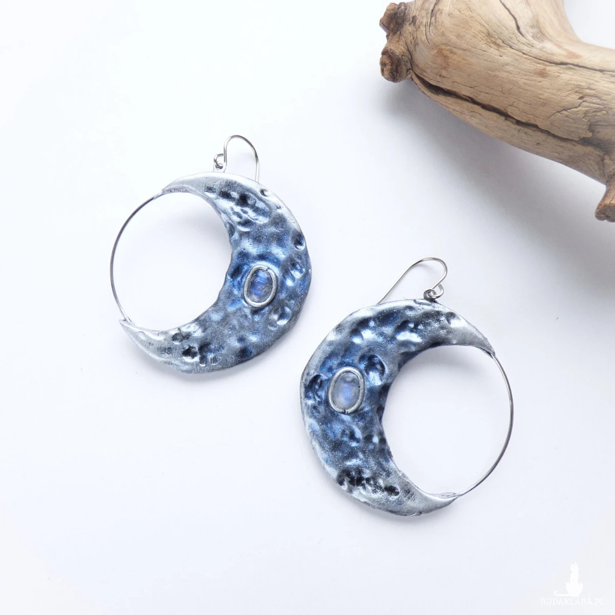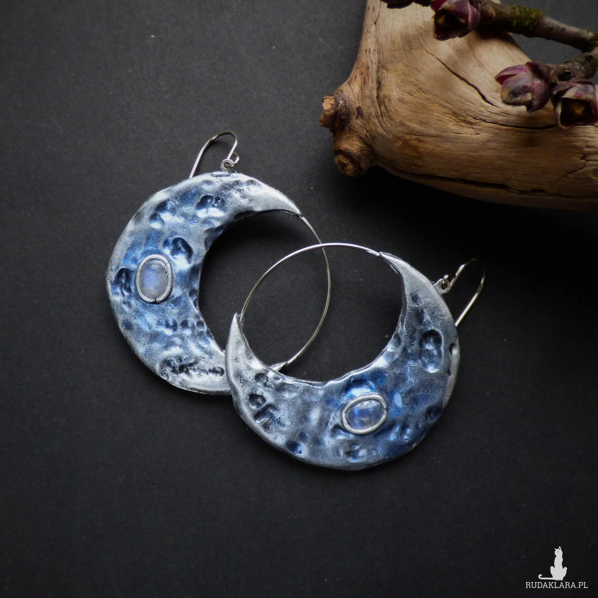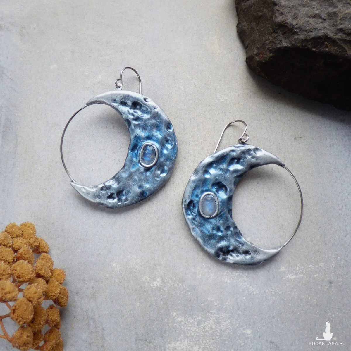 Kolczyki inspirowane tajemniczym pięknem nocnego nieba. Wykonane ręcznie z glinki polimerowej, formowanej i fakturowanej tak, by oddać wygląd powierzchni Księżyca - z delikatnymi kraterami i nieregularną strukturą. Pokryte metalicznym błękitem i srebrem, subtelnie połyskują w świetle.