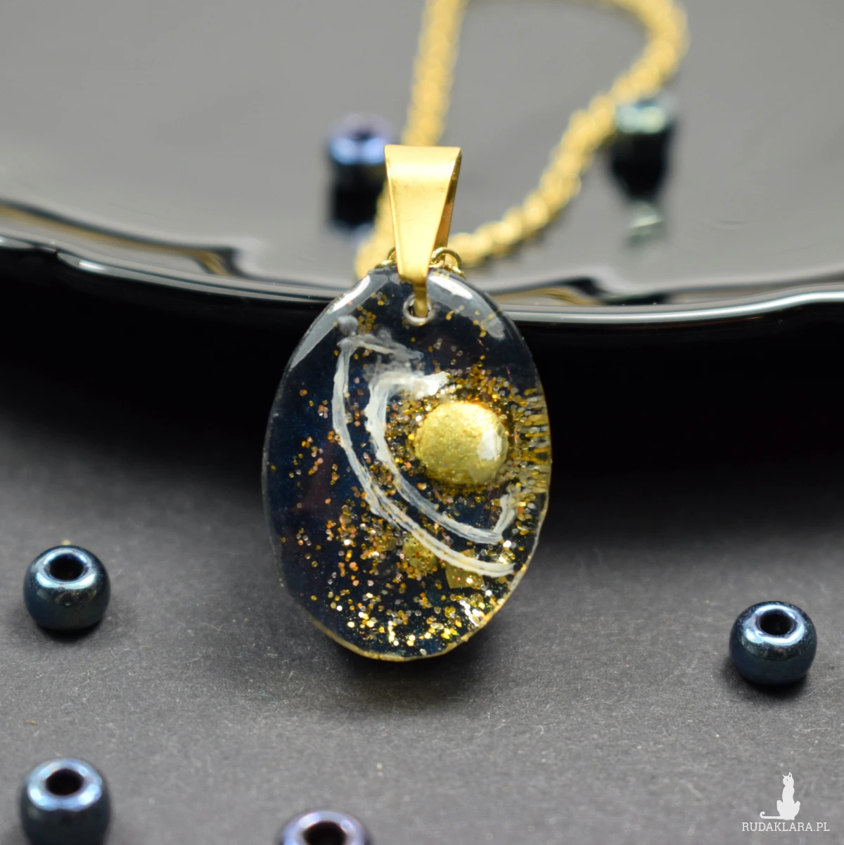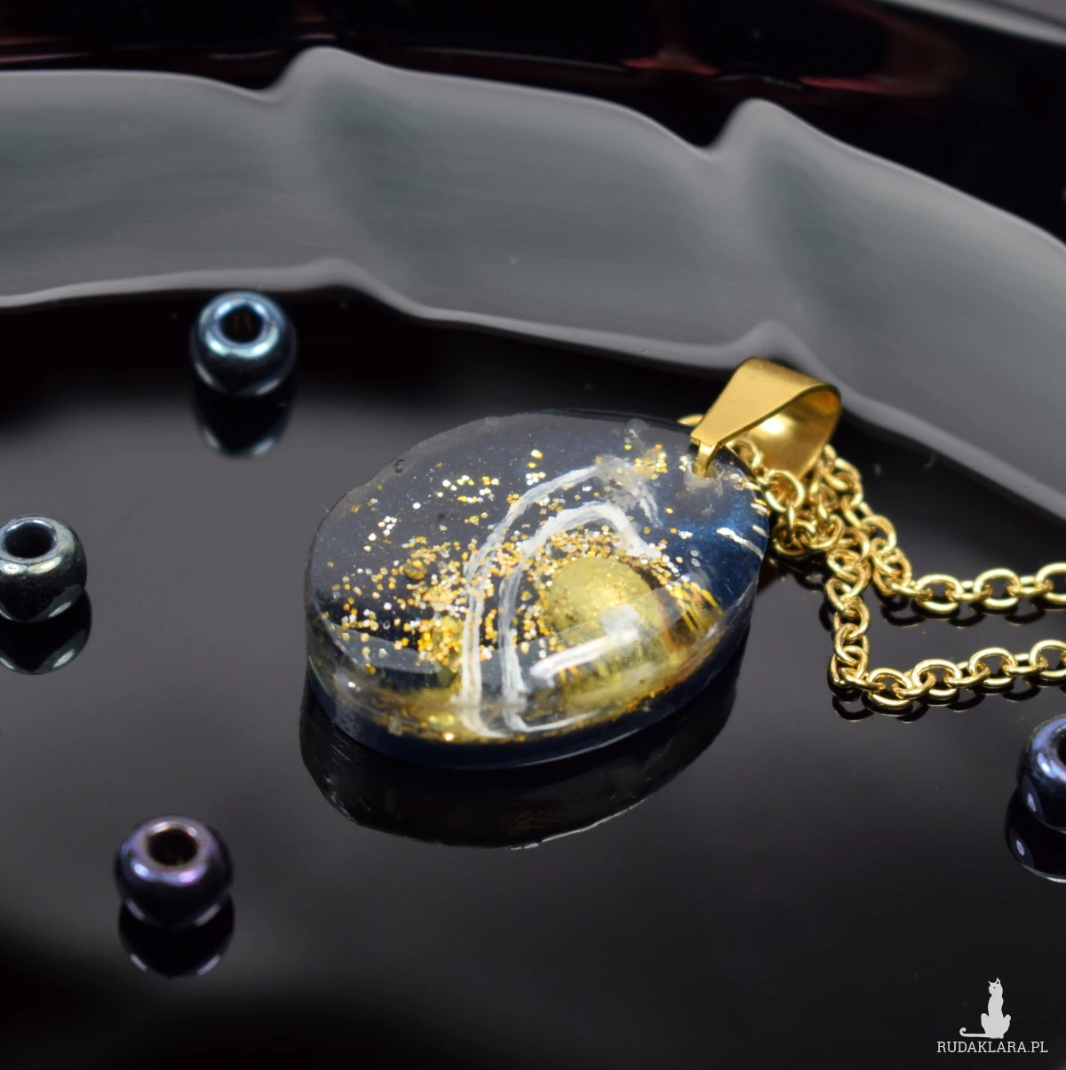 Owalny wisiorek wykonany ręcznie z transparentnej żywicy, z
