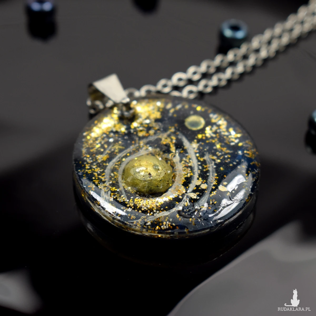 Okrągły, efektowny wisiorek wykonany ręcznie z transparentnej żywicy, z
