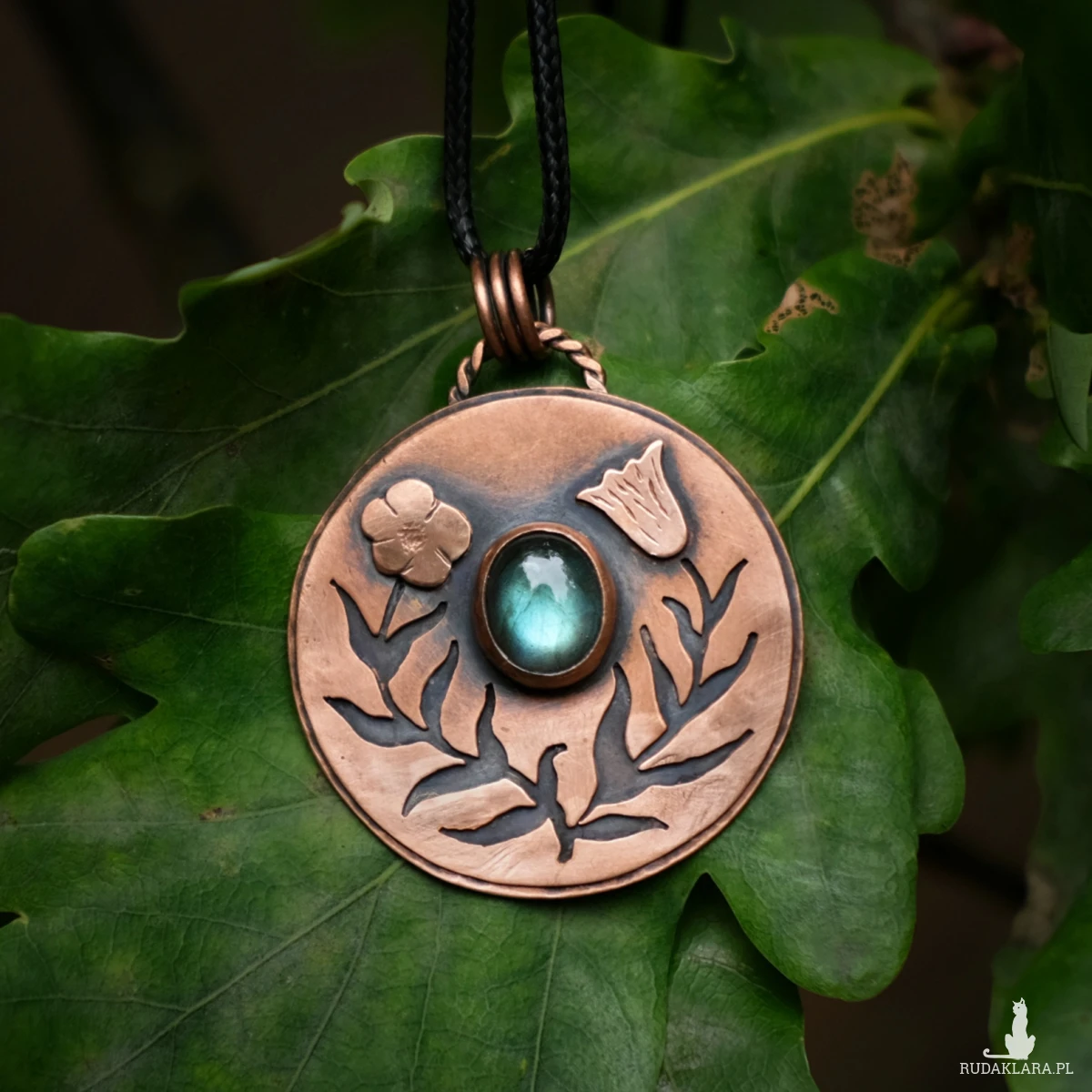 Unikatowy miedziany wisior z kwiatowym motywem mieści w sobie kamień labradorytu o pięknej błękitno-zielonkawej iryzacji. Wszystkie elementy zostały stworzone ręcznie na podstawie rysunku, co nadaje mu oryginalnego charakteru. Wisior został stworzony w jednym egzemplarzu, ma naniesioną patynę, miejscami posiada fakturę i przetarcia.