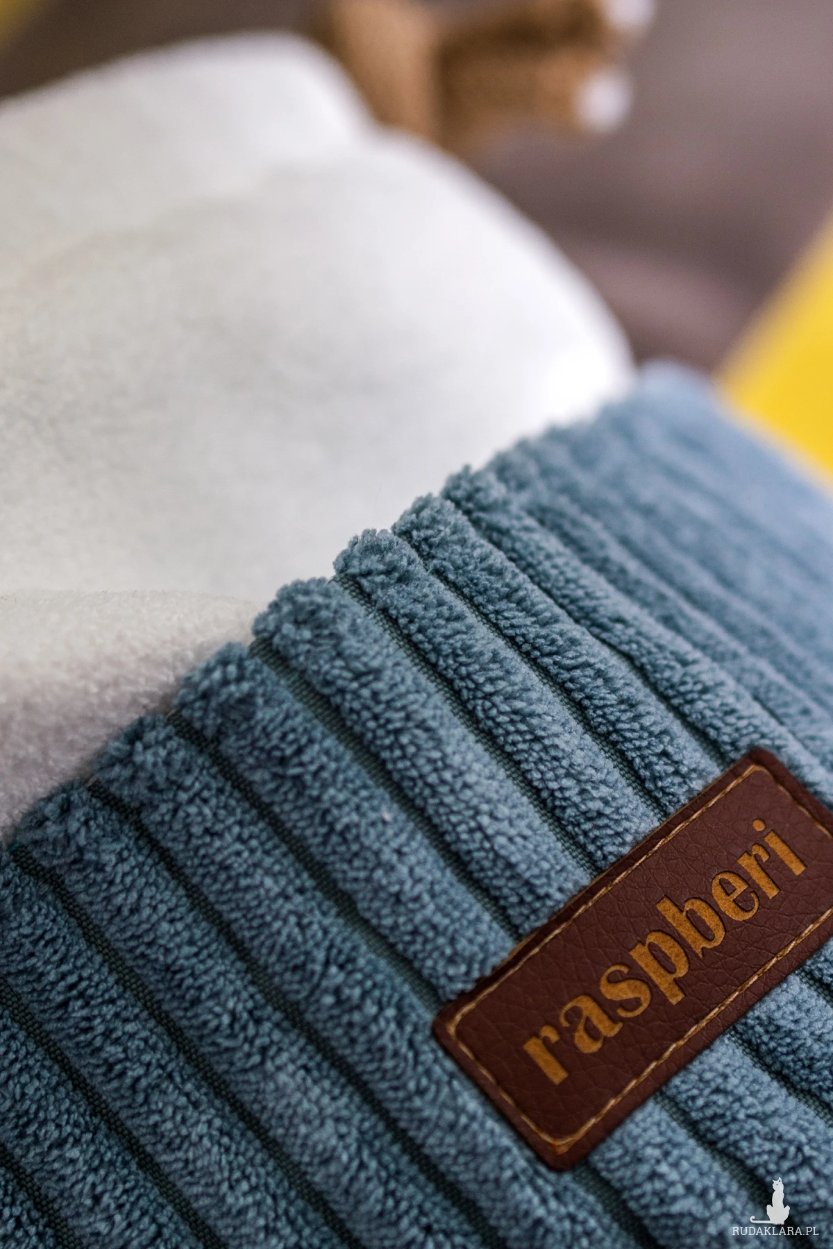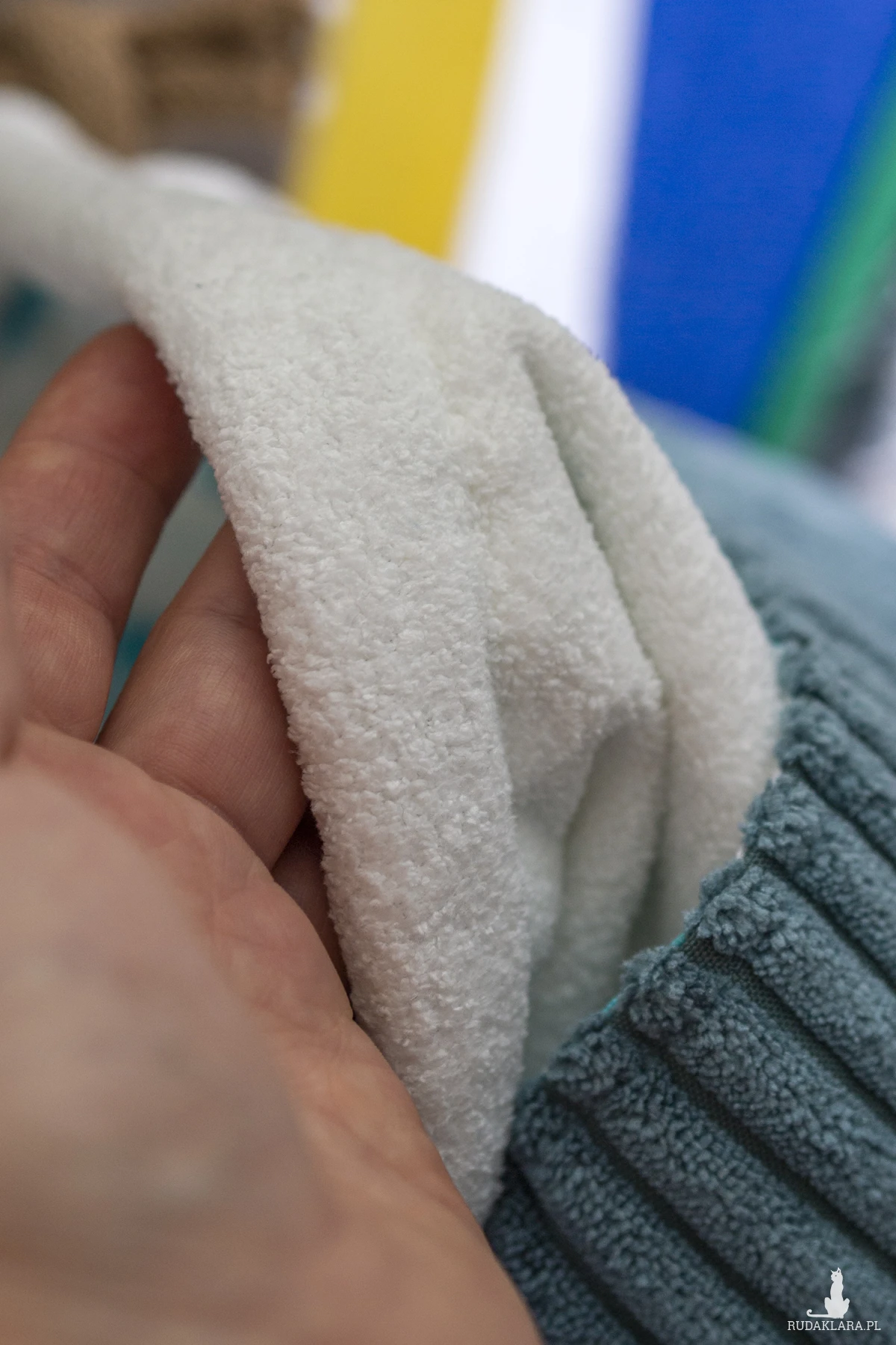 Wykonany z jasnej tkaniny miłej w dotyku (typu plusz/welur). Z przodu oraz z na tyle torebki kieszenie (np. na telefon czy chusteczki) z grubego niebieskiego sztruksu.