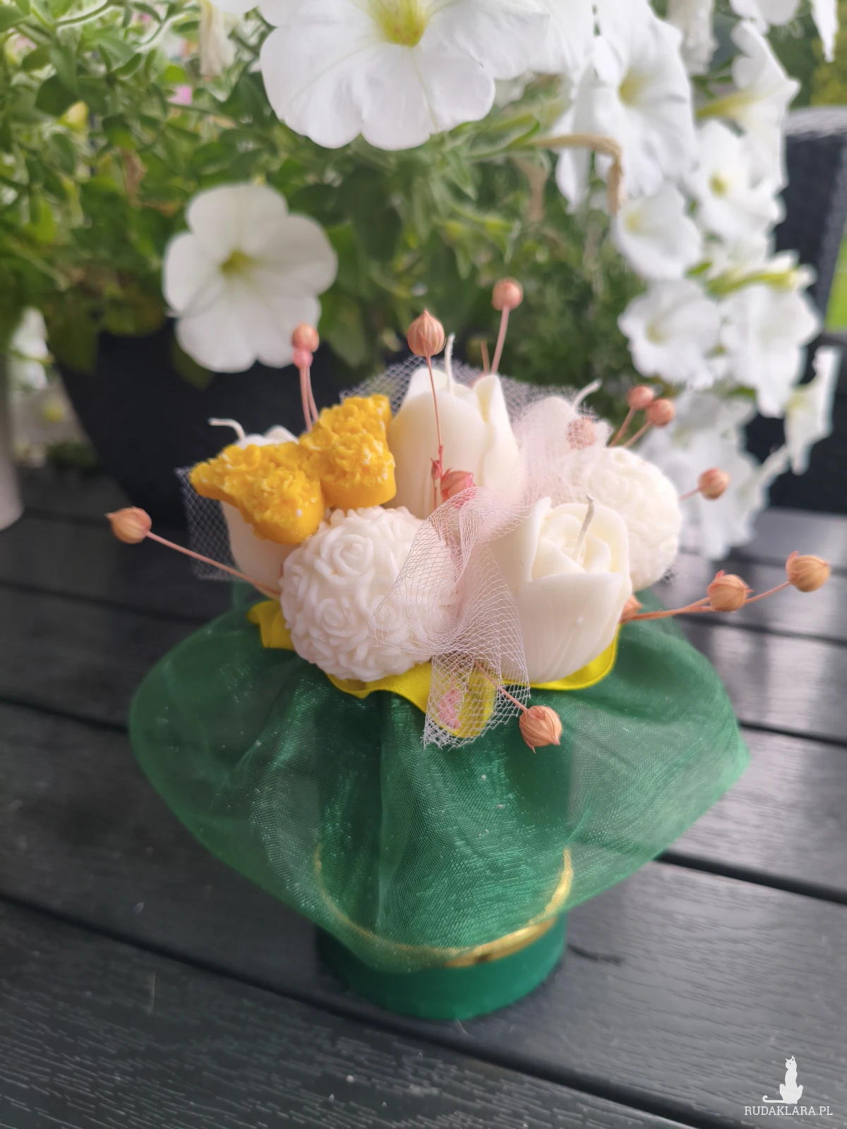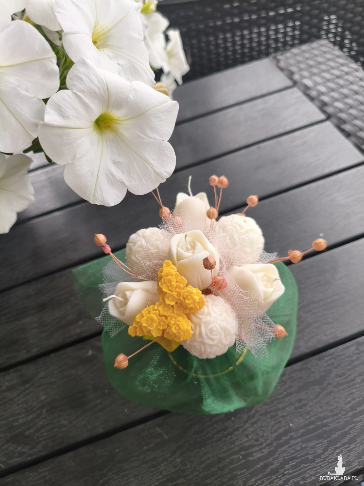 Świece wykonane są z naturalnego wosku sojowego oraz bawełnianego knota. Flower box zawiera główki kwiatów które po wyciągnięciu z bukietu można zapalić.