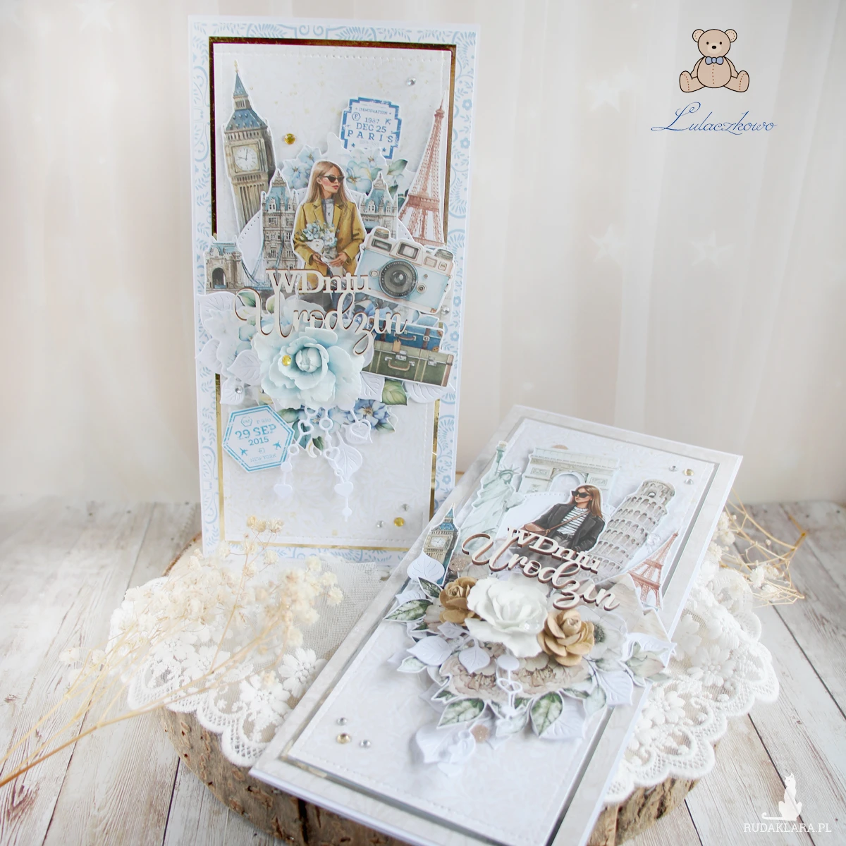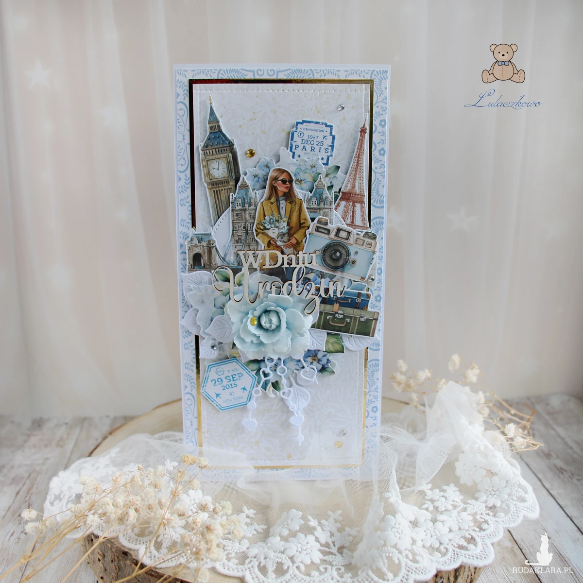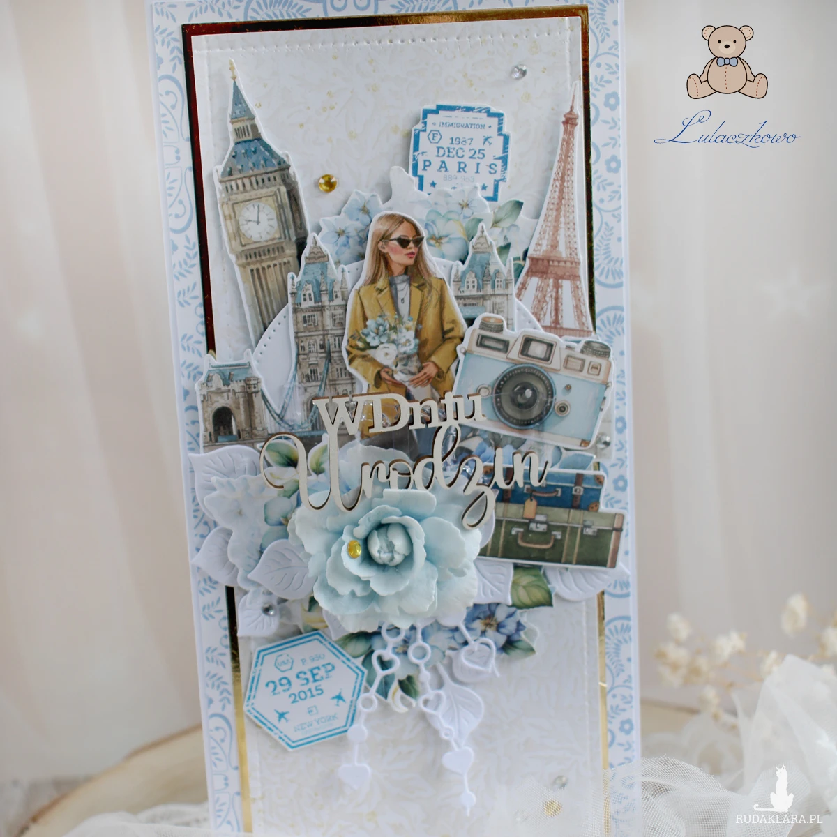 Elegancka i nietuzinkowa, bogato zdobiona kartka urodzinowa dla kobiety - z motywem podróżniczym. Utrzymana w odcieniach niebieskiego, beżu i bieli, z dodatkiem złotych błyszczących akcentów, z grafiką stylowej dziewczyny, otoczoną kompozycją kwiatową. Kartka ozdobiona licznymi grafikami podróżniczymi - budowli i zabytków, kryształkami, cekinami oraz tekturkowym napisem "W Dniu Urodzin".