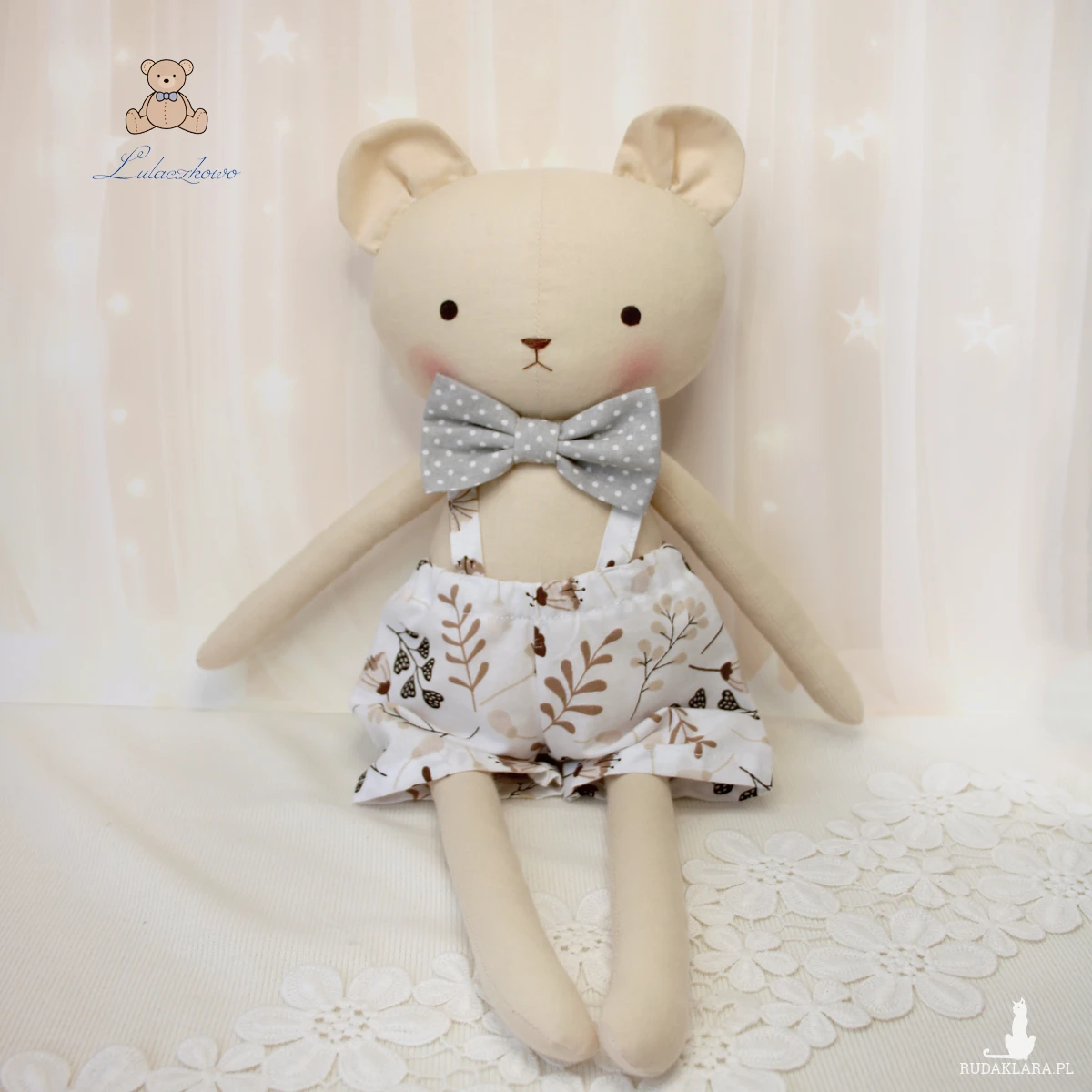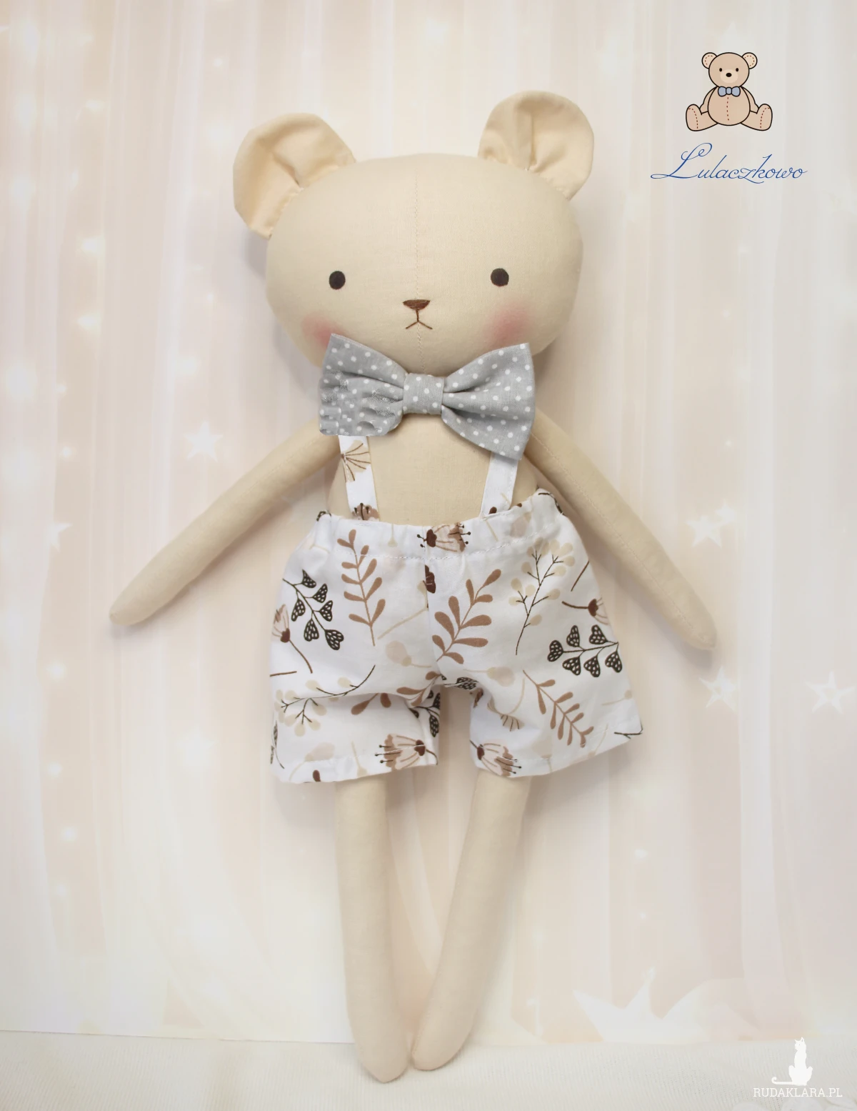 Przeurocza przytulanka, miś w kolorze beżowym, uszyty ręcznie z najwyższą starannością, ubrany w spodenki na szelkach w kolorze bieli w leśne wzorki i uroczą muszkę. Wykonany ze 100% bawełny, wypełniony antyalergiczną kulką silikonową. Oczka malowane wodoodpornym markerem, nosek i buźka wyszyte muliną. Górne i dolne łapki układają się luźno, misiulek siedzi z podparciem. Spodenki można swobodnie zdejmować, w pasie wszyta jest gumeczka, muszka również jest na gumeczce.