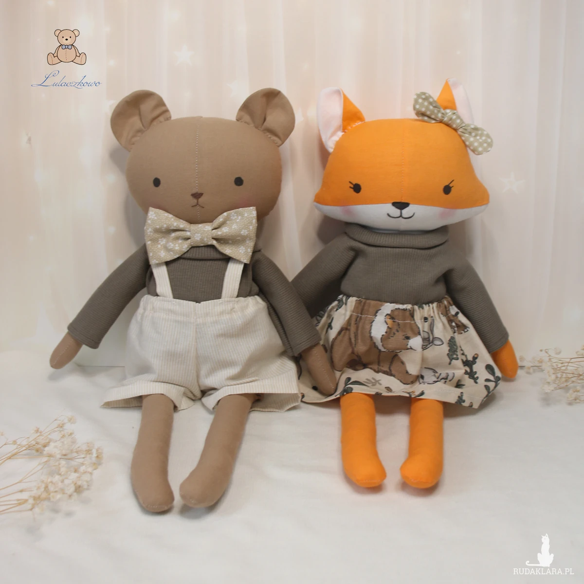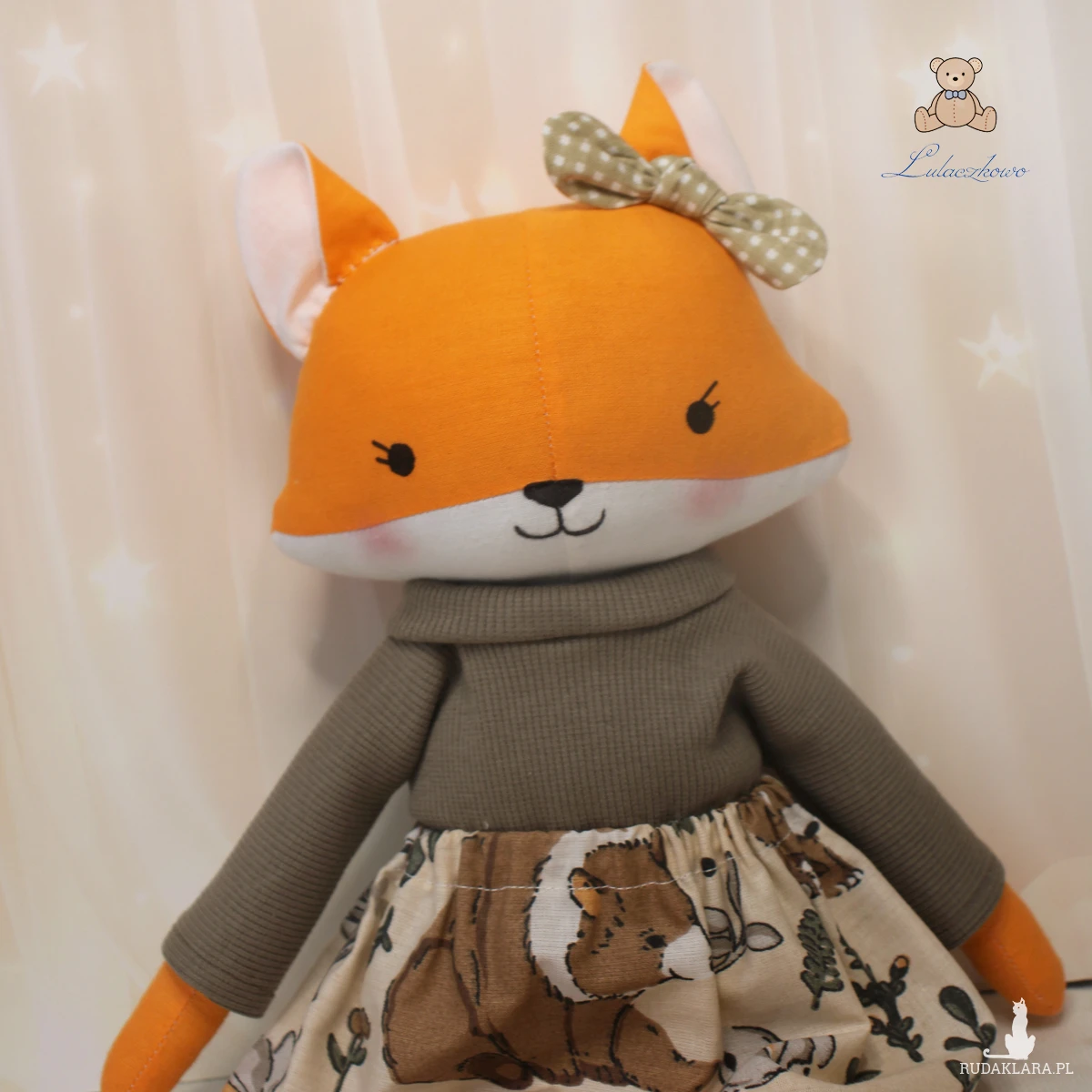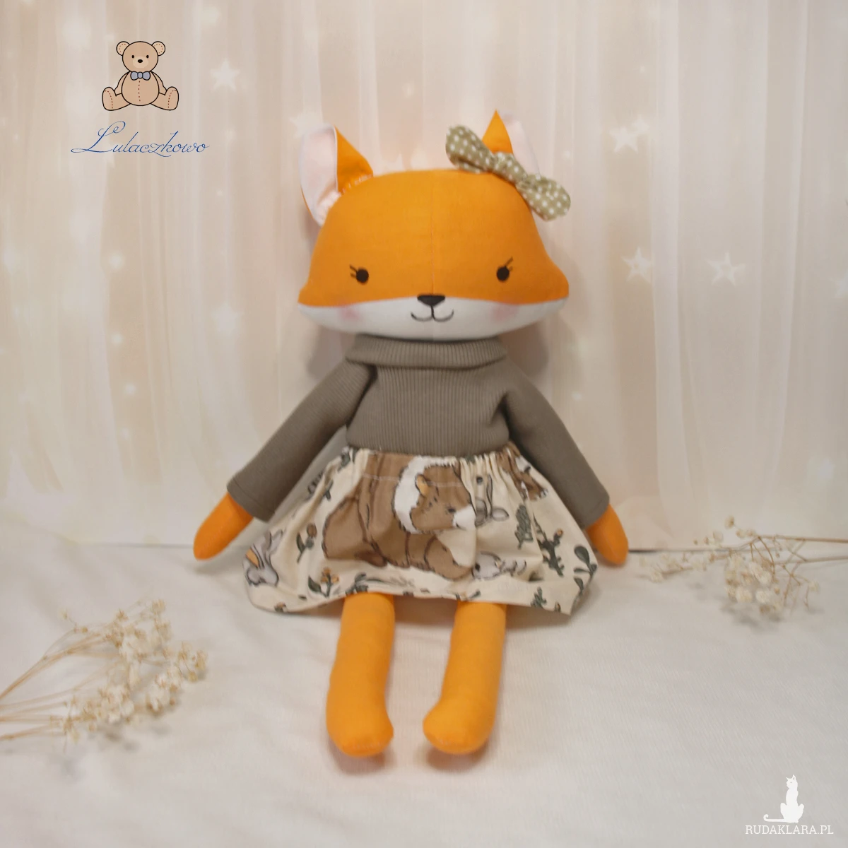 Przeurocza przytulanka, lisek a właściwie lisiczka w odcieniach pomarańczu i bieli, uszyta ręcznie z najwyższą starannością, ubrana w brązowy sweterek i beżową spódniczkę w leśne zwierzątka. Wykonana ze 100% bawełny, wypełniona antyalergiczną kulką silikonową. Oczka, nosek i uśmiech malowane wodoodpornym markerem, uszko ozdobione kokardką. Spódniczkę i sweterek można swobodnie zdejmować (sweterek zdejmujemy dołem, przez nóżki), spódniczka jest na gumeczce. Górne i dolne łapki układają się luźno, lisiczka siedzi z podparciem.