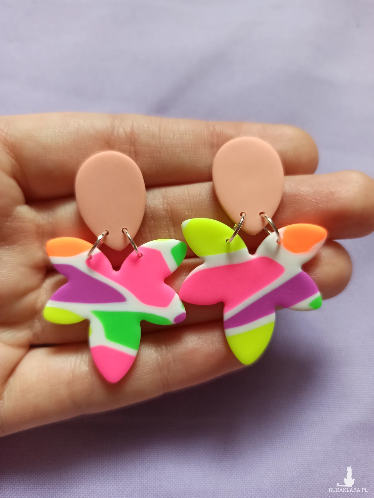 Kolczyki sztyfty w kształcie cielistych/nude łezek i elementu w neonowe wzory.