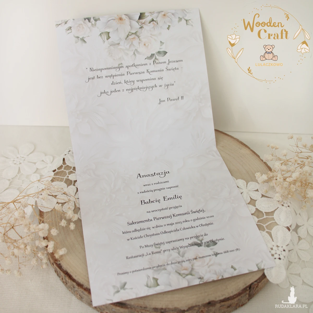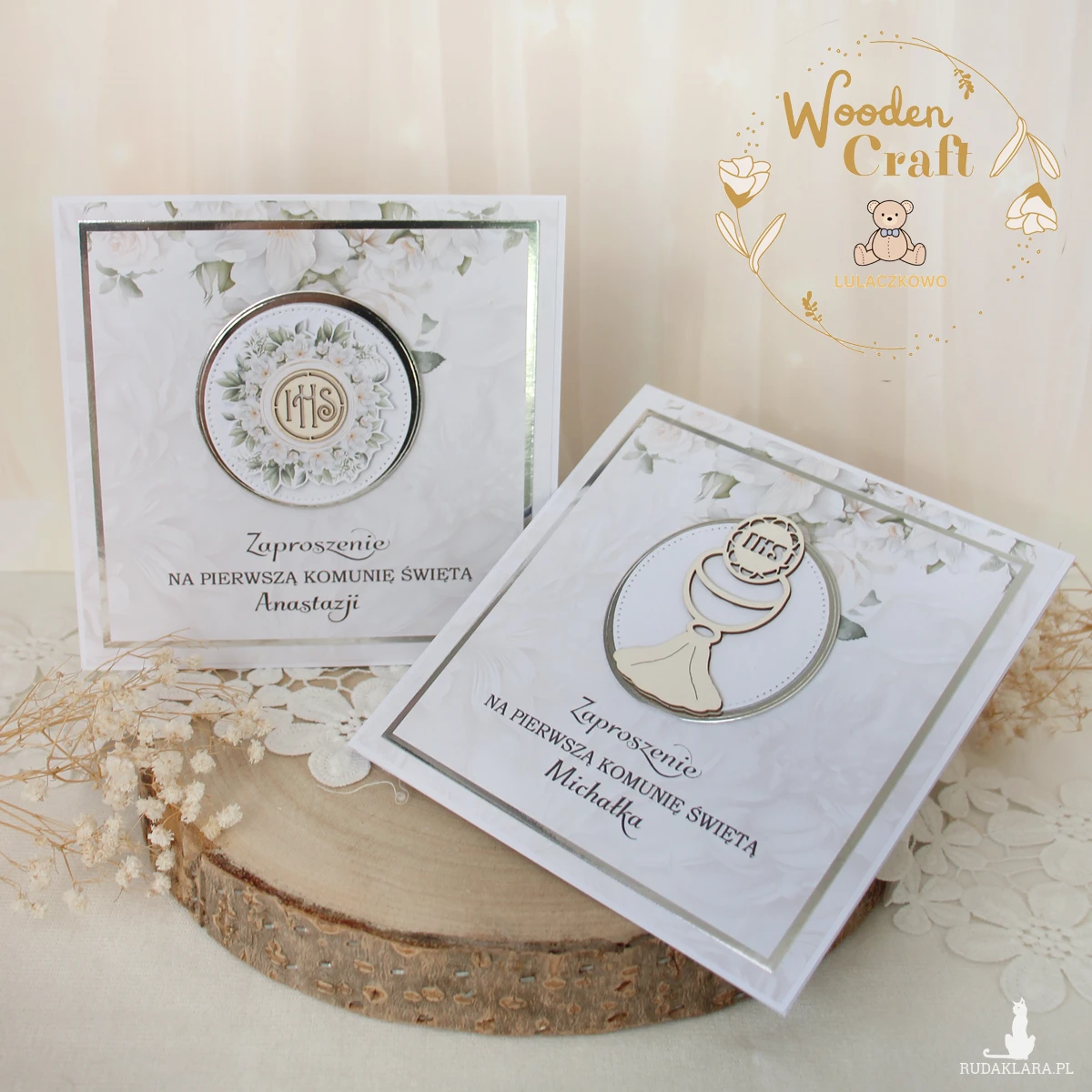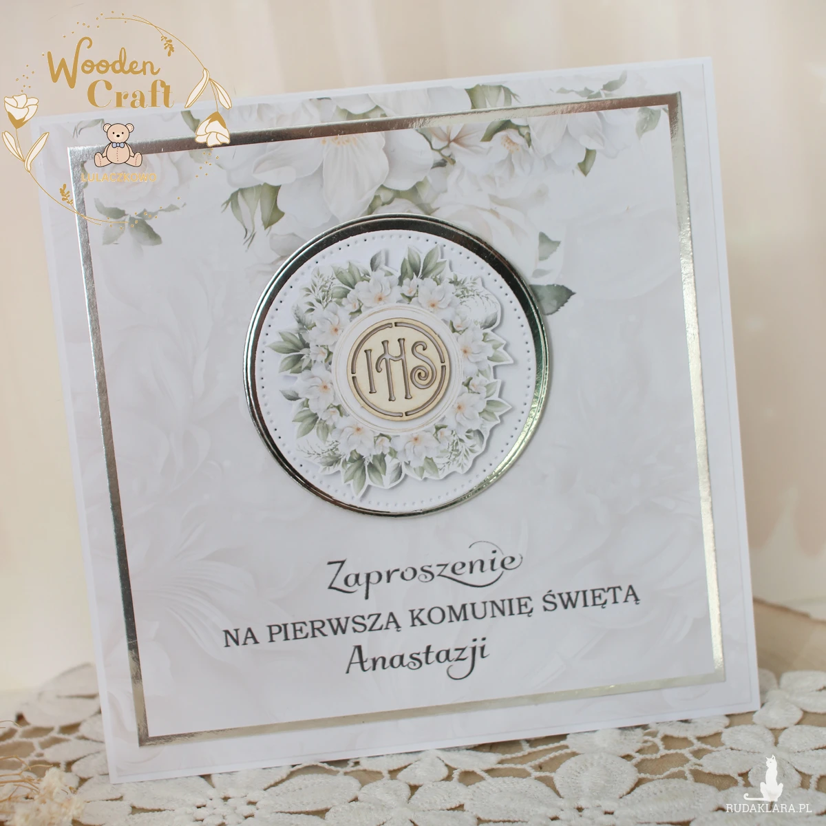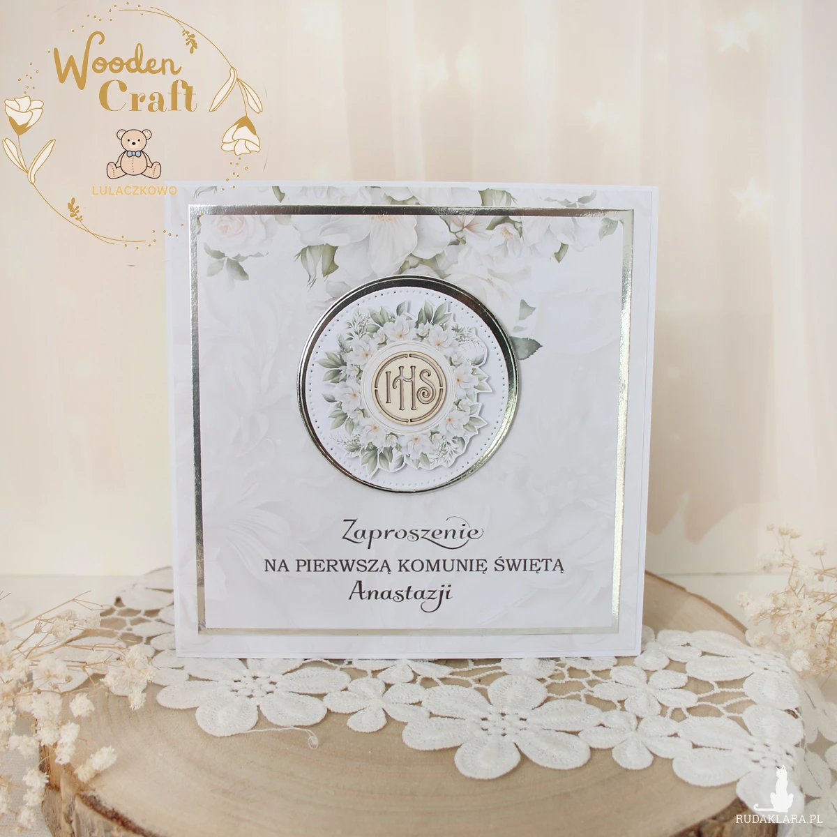 Niezwykle delikatne i eleganckie zaproszenia na Pierwszą Komunię Świętą, wykonane ręcznie z dbałością o każdy szczegół. Zaproszenia klejone warstwowo, dzięki czemu posiadają lekki efekt 3D. Centralny punkt zaproszenia stanowi przepiękna, tekturka hostia święta, otoczona wianuszkiem kwiatowym oraz srebrną, błyszczącą, okrągłą rameczką. Całość dopełnia papier scrapowy w odcieniu bieli wpadającej w lekki beż oraz błyszczący, srebrny papier lustrzany, a także nadrukowany napis "Zaproszenie na Pierwszą Komunię Świętą" (istnieje możliwość nadrukowania również imienia dziecka - w tym celu proszę o kontakt).