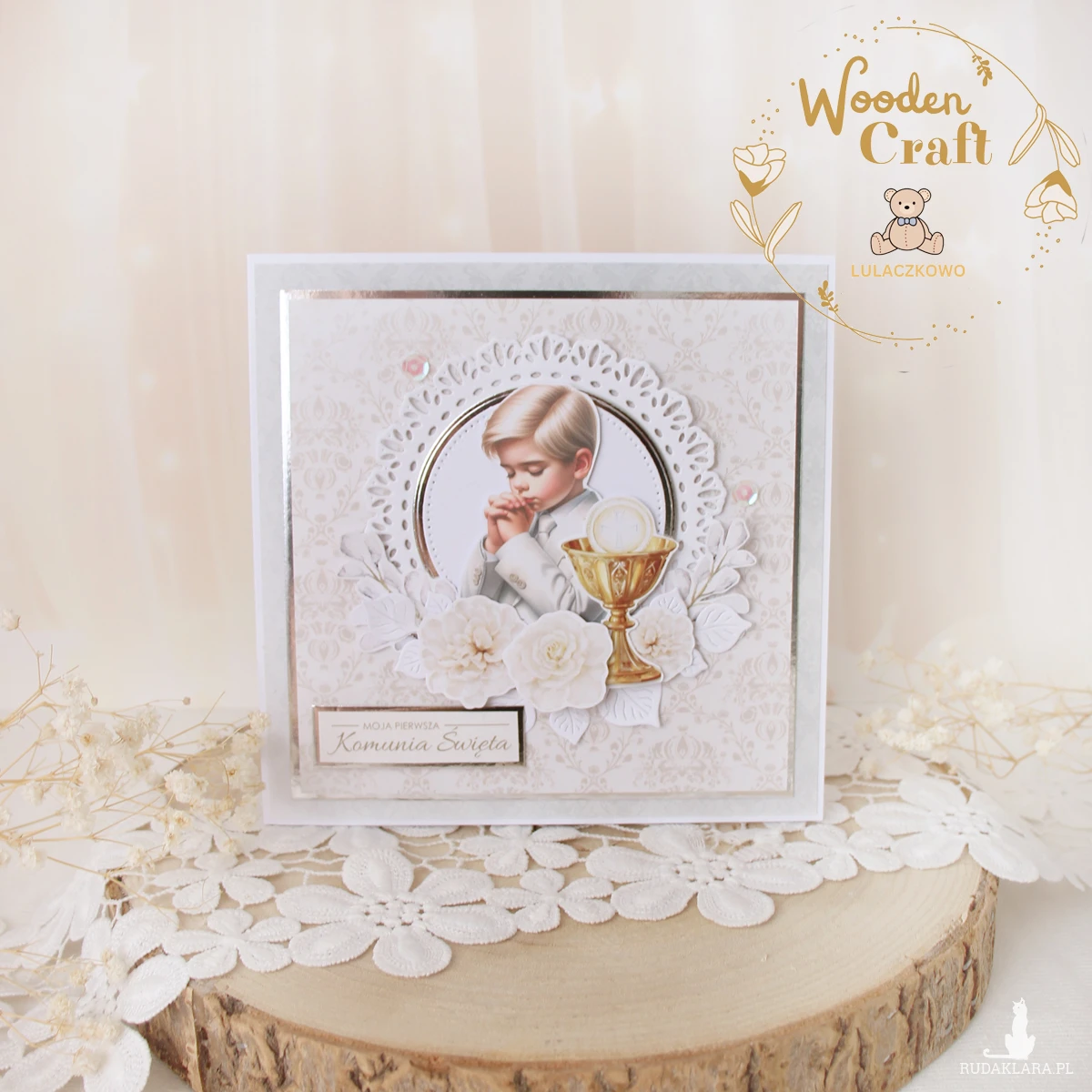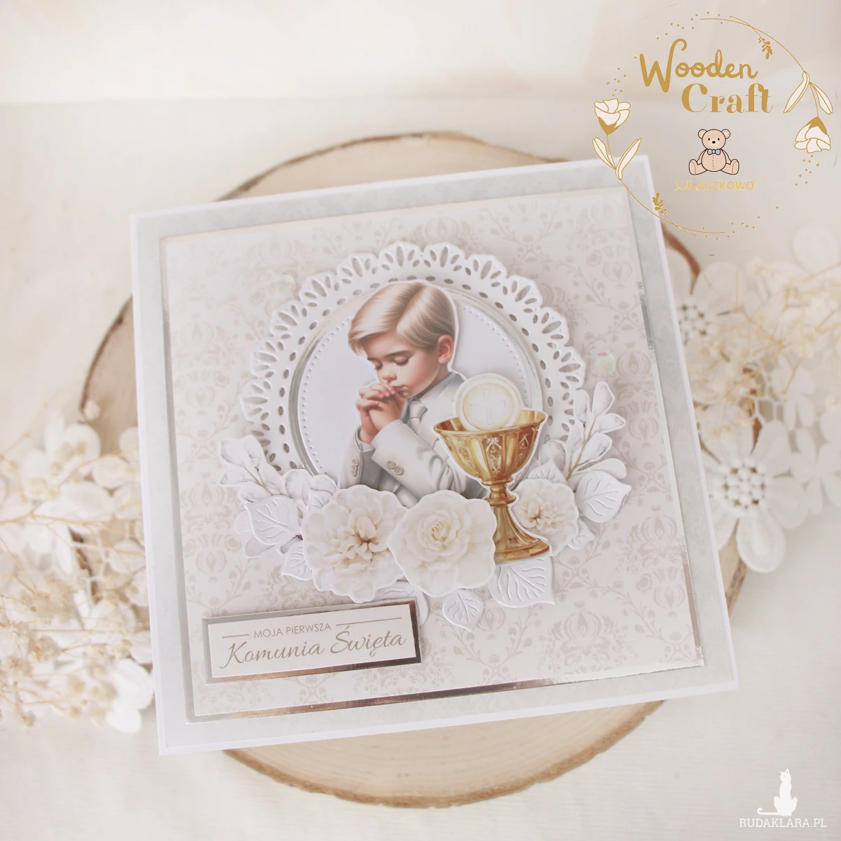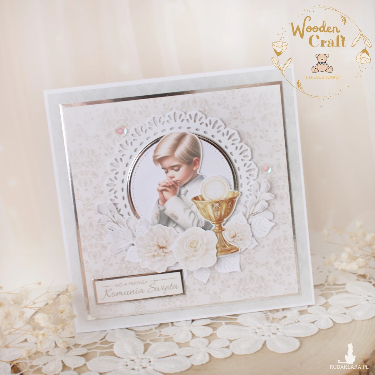 Piękna, delikatna kartka komunijna, pamiątka Pierwszej Komunii Świętej, wykonana ręcznie z najwyższą starannością, z cudownej kolekcji papierów "First Holy Communion", utrzymana w pastelowych odcieniach błękitu, szarości i bieli, z dodatkiem srebrnych, błyszczących akcentów. Na środku kartki umieszona została grafika modlącego się chłopca komunijnego w otoczeniu kielicha z hostią świętą, ozdobiona wyciętą wykrojnikiem, ażurową rameczką oraz grafikami kwiatowymi, cekinami oraz napisem "Moja Pierwsza Komunia Święta"- do napisu mogę również dodać imię dziecka lub całkowicie zmienić go na inny.