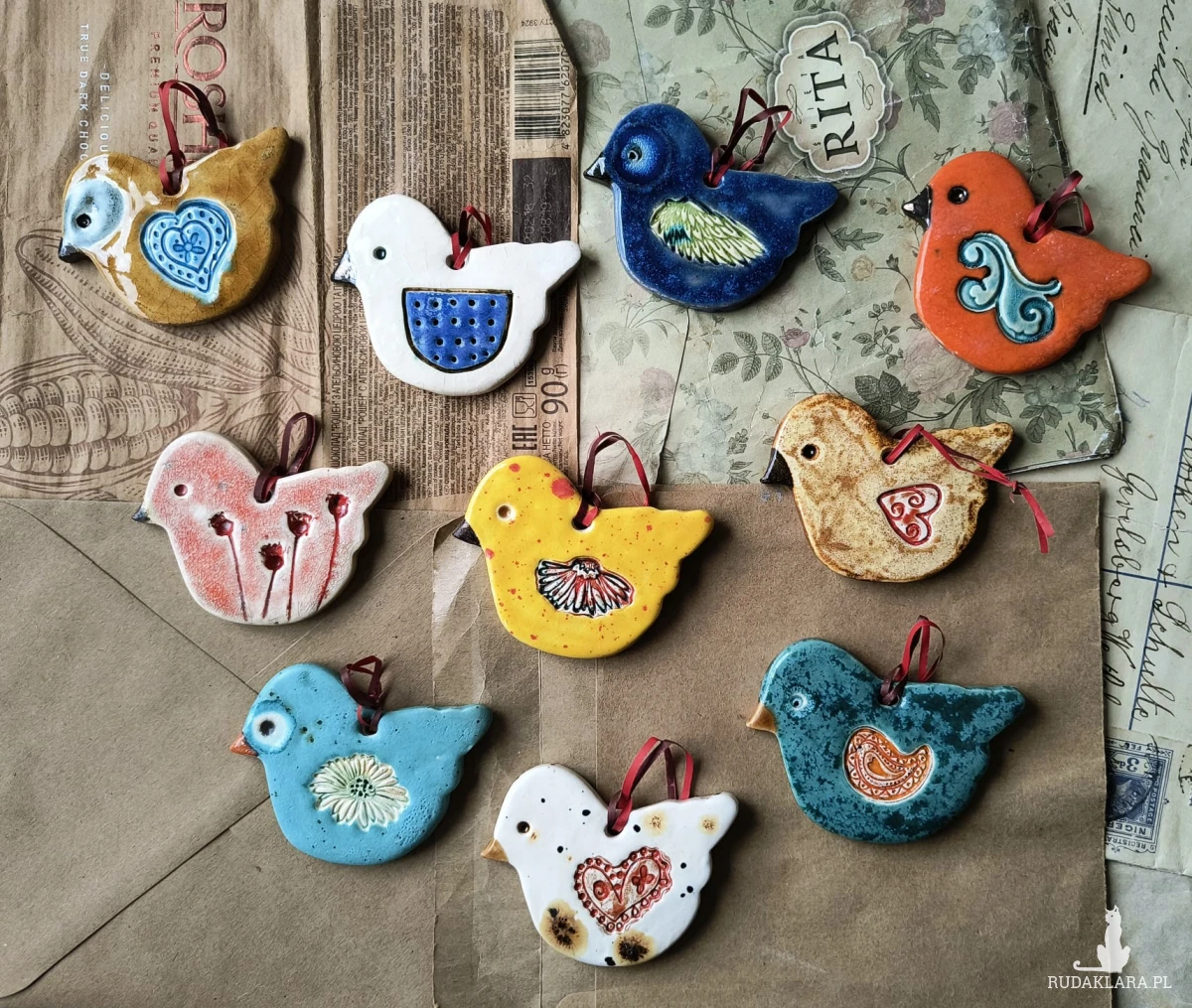 Zestaw złożony z 10 ptasząt do powieszenia na rarfii. Wykonany z gliny szamotowej, wypalony na biskwit, a następnie szkliwiony w temperaturze 1260 stopni C, o wymiarach ok 4,5 cm x 7 cm. Idealnie sprawdzą się jako prezent okolicznościowy lub ozdoba domu.