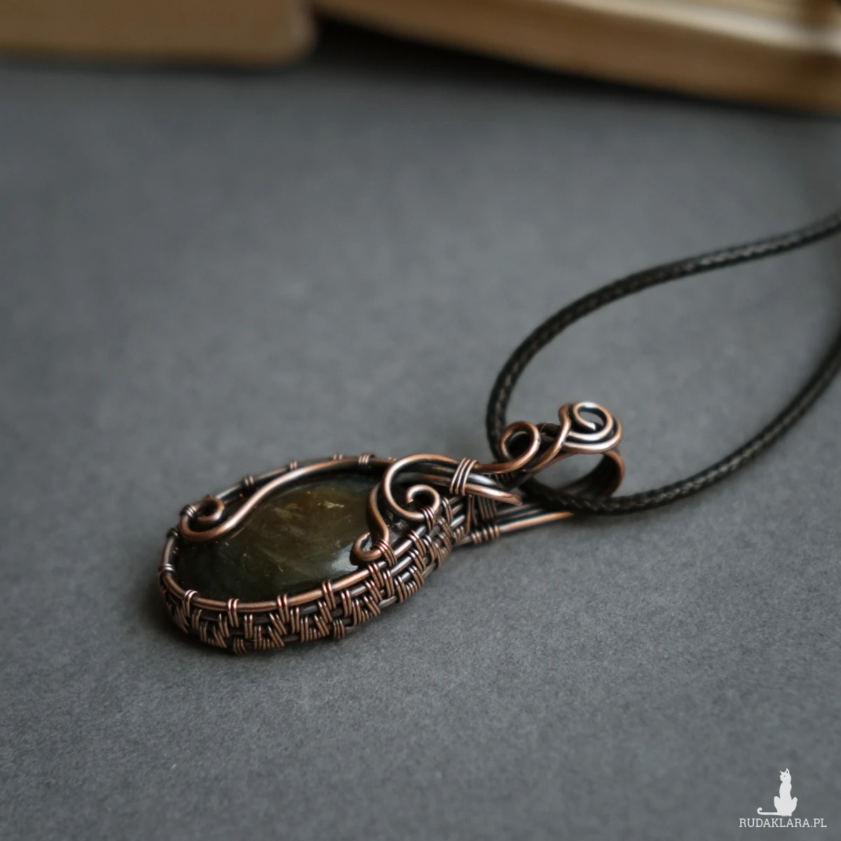 Oprawę wykonałam własnoręcznie pracochłonną techniką wire wrapping. Miedź poddałam oksydacji w celu uszlachetnienia barwy i nadania efektu patyny.