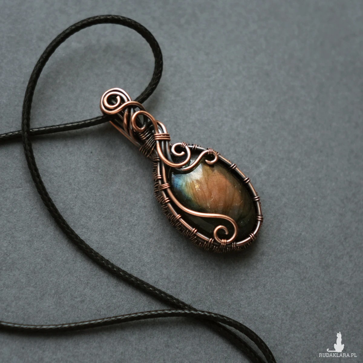 Miedziany wisiorek mieści w sobie kamień labradorytu o pięknej brzoskwiniowo-żółtej iryzacji, z domieszką błękitu. Posiada ozdobne boczki i fantazyjne sploty miedzianego drutu. Wisiorek jest unikatem, doda Twojej stylizacji oryginalności :-)