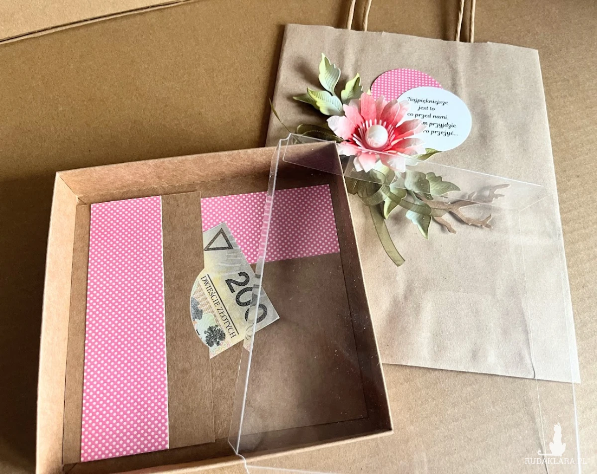 Wyjątkowa, bogato zdobiona kartka z okazji przejścia na emeryturę.Stworzona na bazie kraftowej z licznymi dodatkami w postaci tekturek oraz kwiatów ręcznie robionych. Wymiary kartki 14 x 14 cm. Do kompletu dołączone pudełko z przeźroczystym wieczkiem o wymiarze 15,5 x 15,5 w kolorze eco.Na dnie pudełka umieszczono kieszonkę na małe co nieco. Do kompletu dołączono torebkę kraftową w tej samej stylizacji o wym,22,5x18 Wewnątrz kartki umieszczono karnet na wypisanie własnych życzeń. W tej postaci kartka dostępna od ręki .Polecam