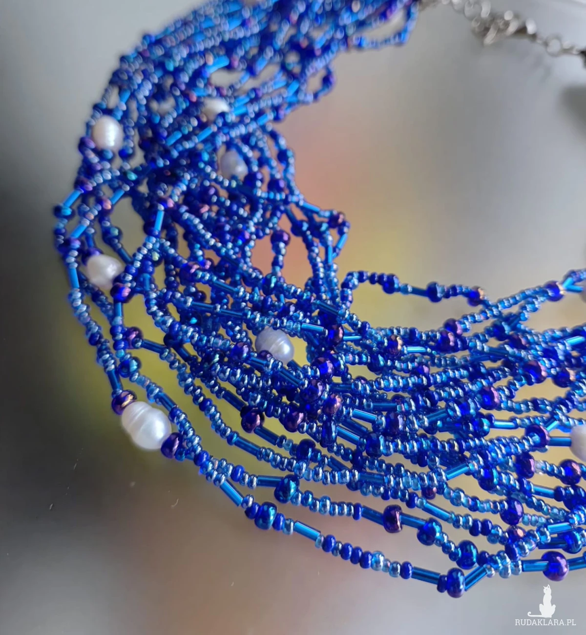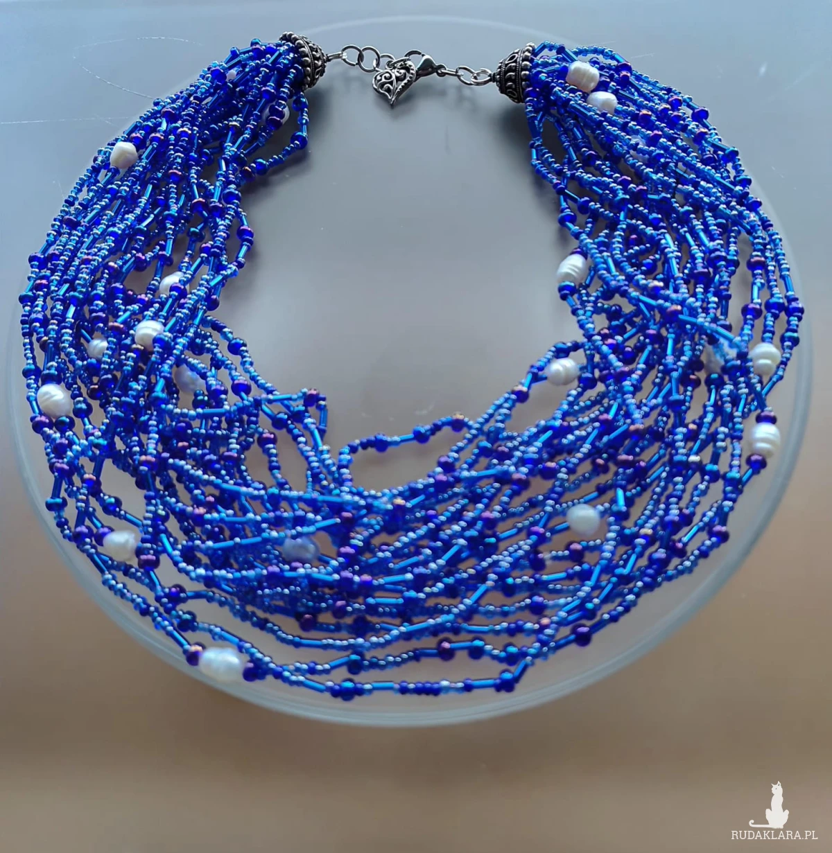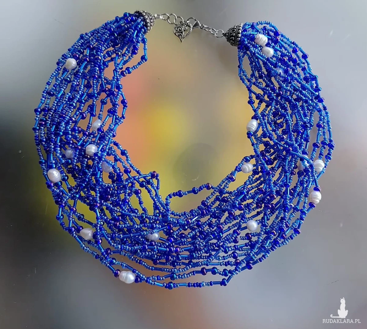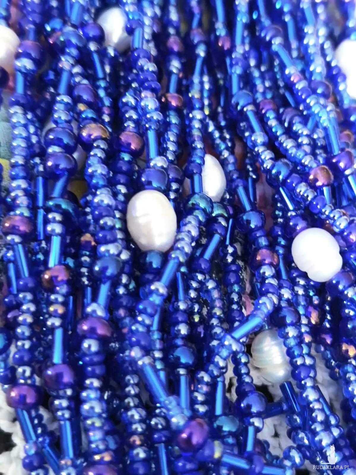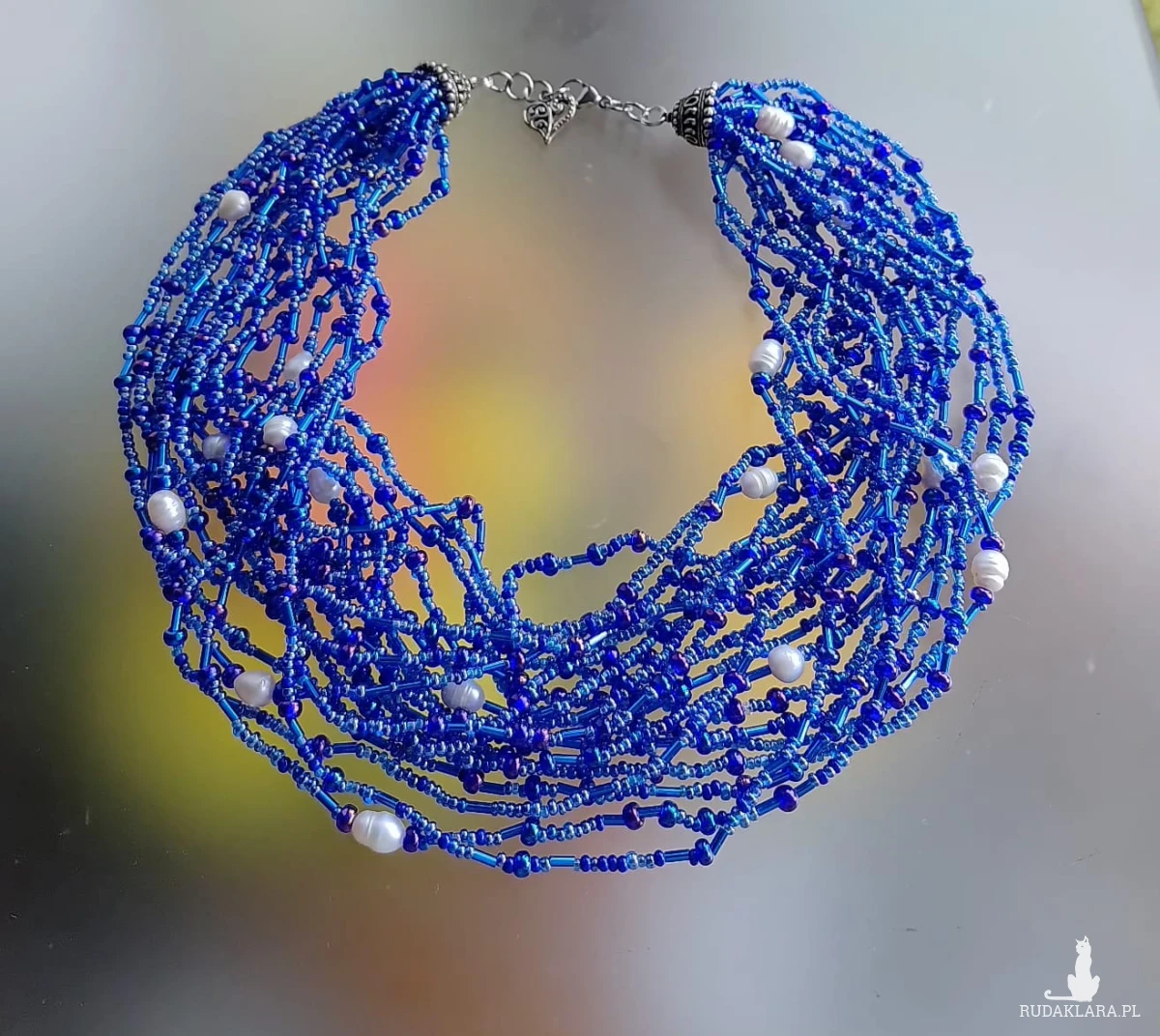 Naszyjnik piękny, duży z koralików niebieskich, granatowych, różnych. Koraliki ozdobione perełkami rzecznymi w kolorze białym. Końcówki metalowe ozdobne. Zapięcie ze stali nierdzewnej. Objetość 46-47 cm, metal, szkło,stal