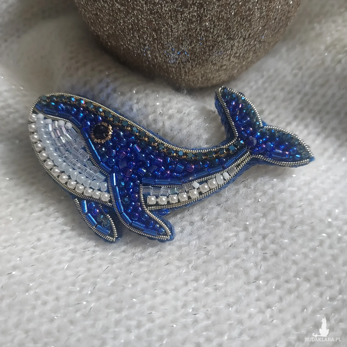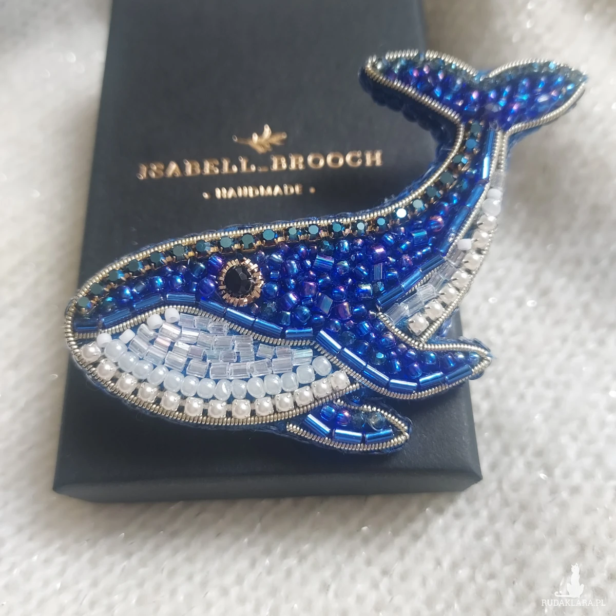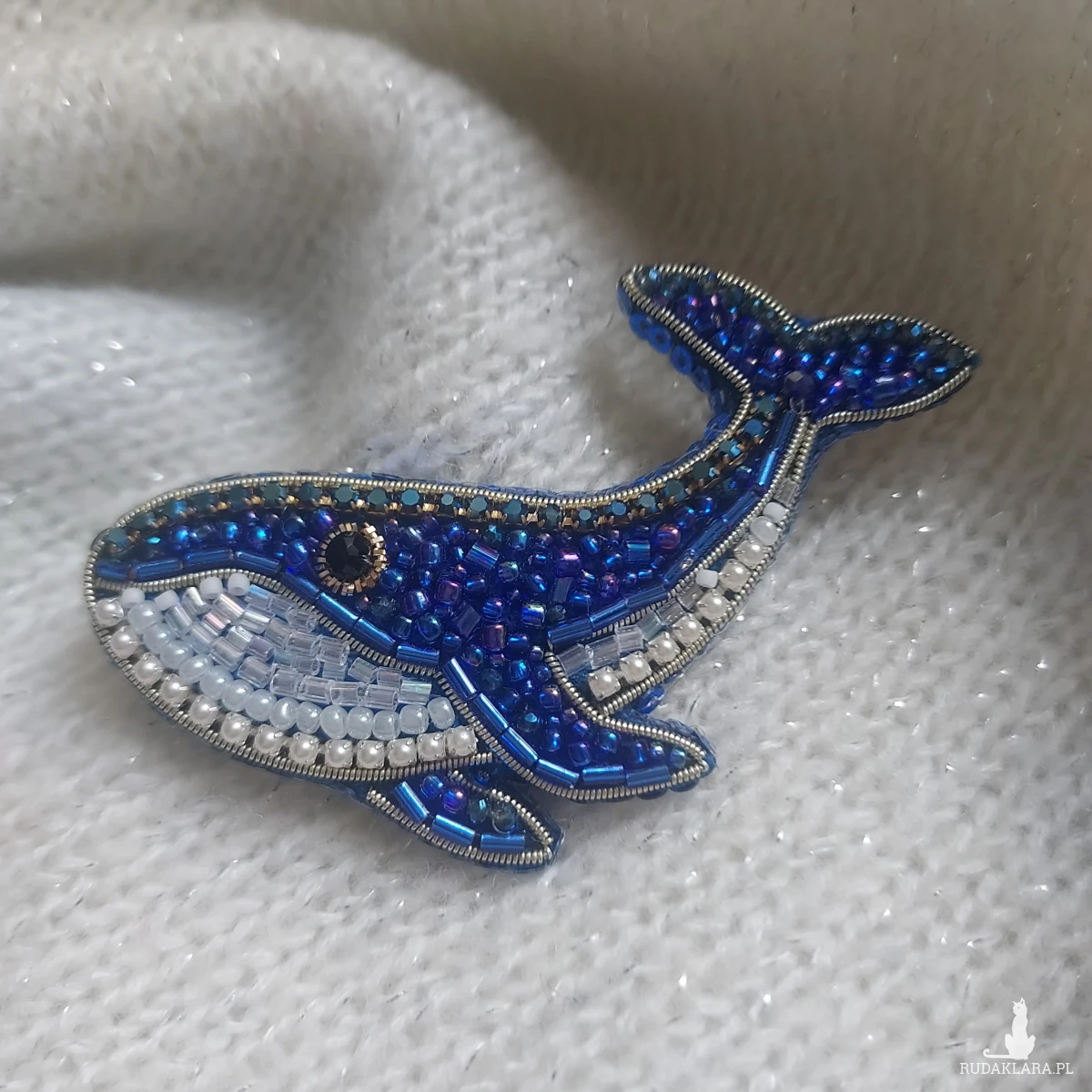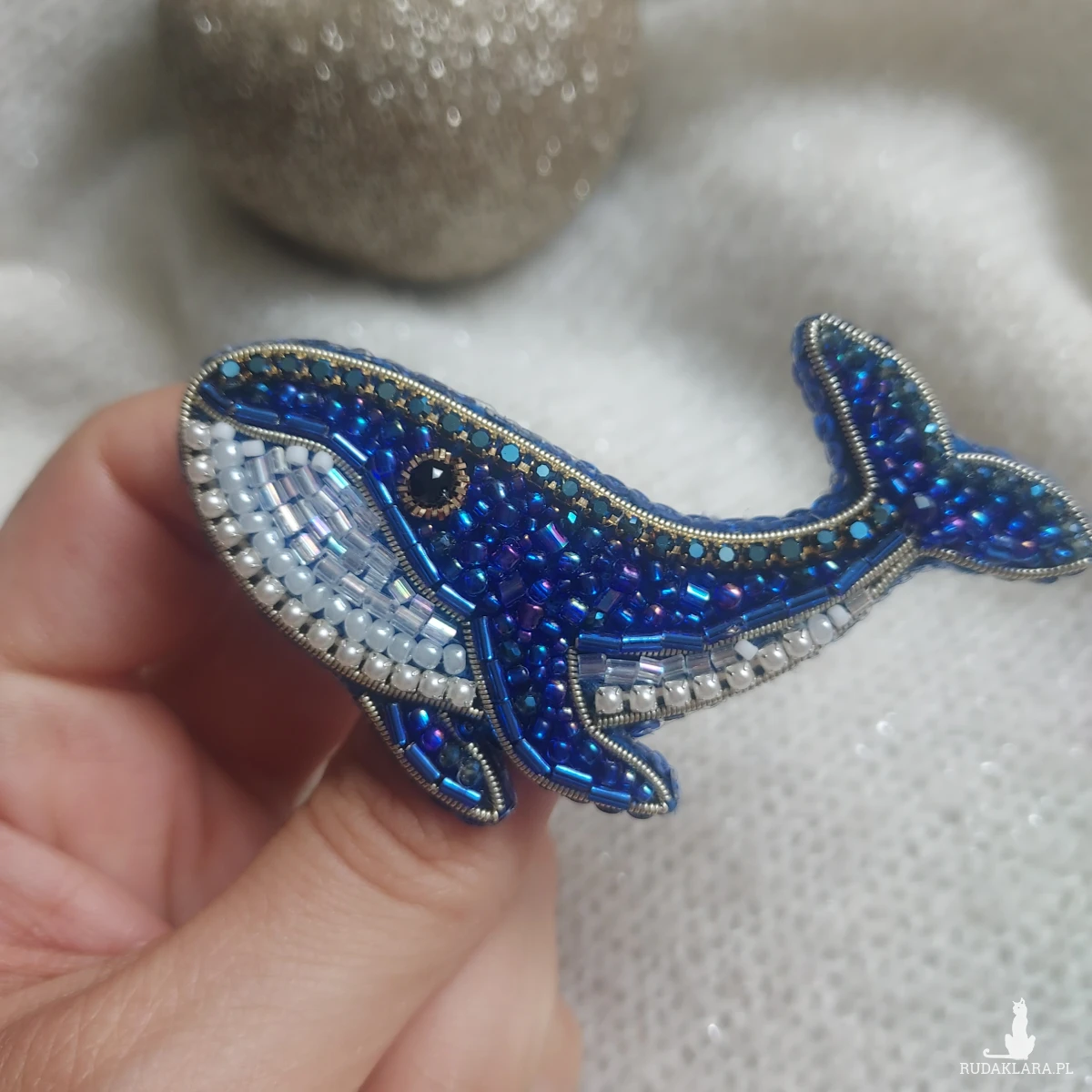 Autorska, niepowtarzalna, pełna blasku broszka WIELORYB powstała techniką haftu koralikowego.