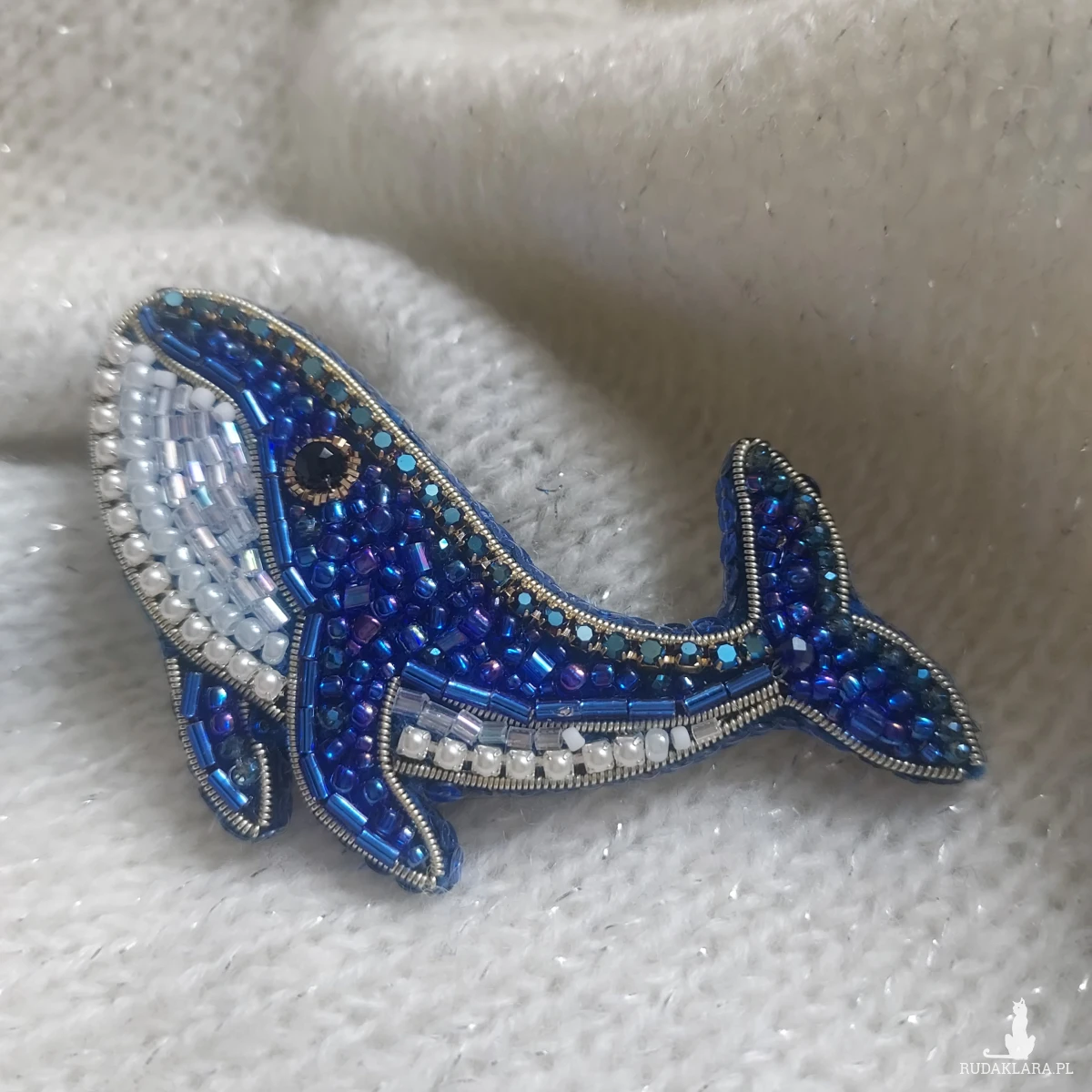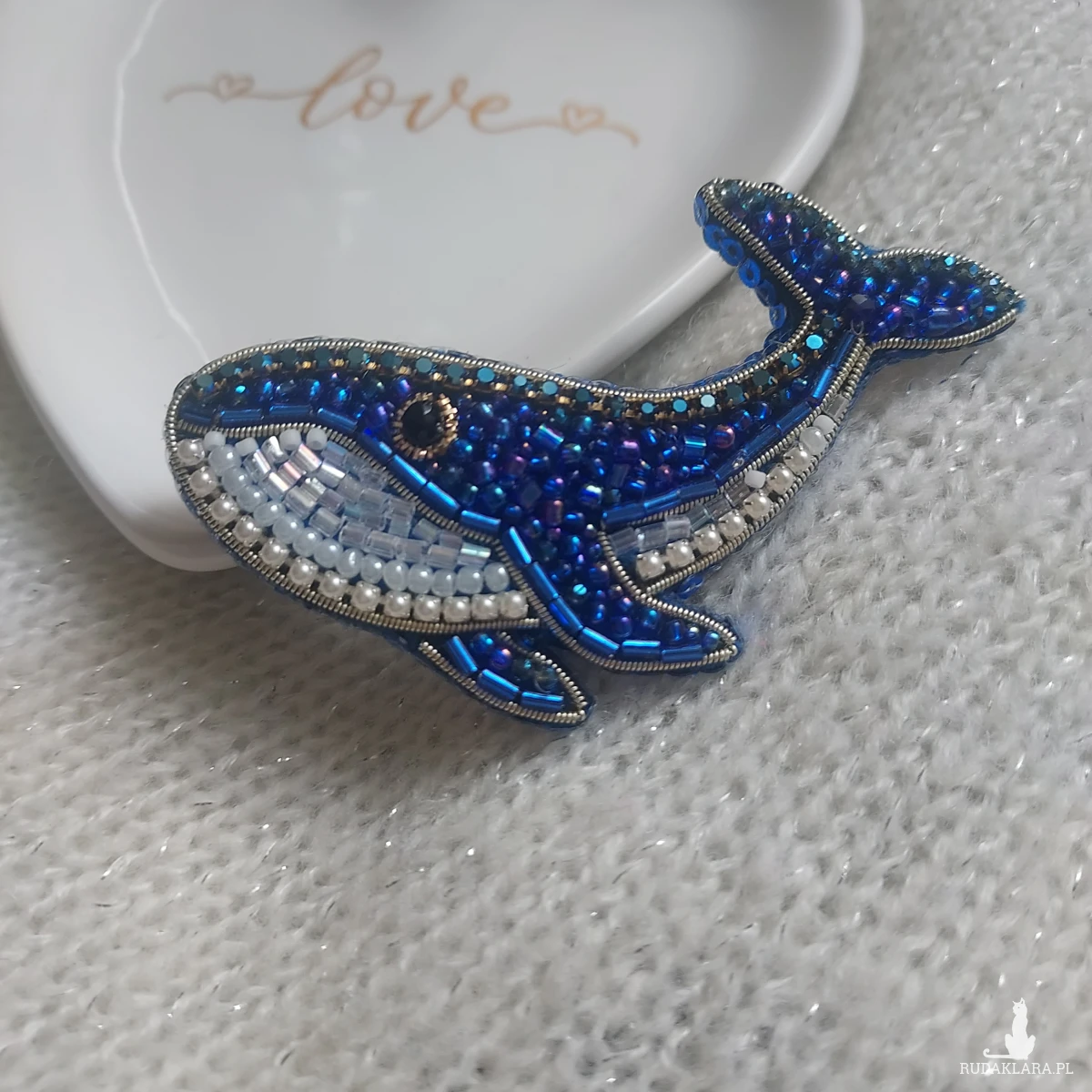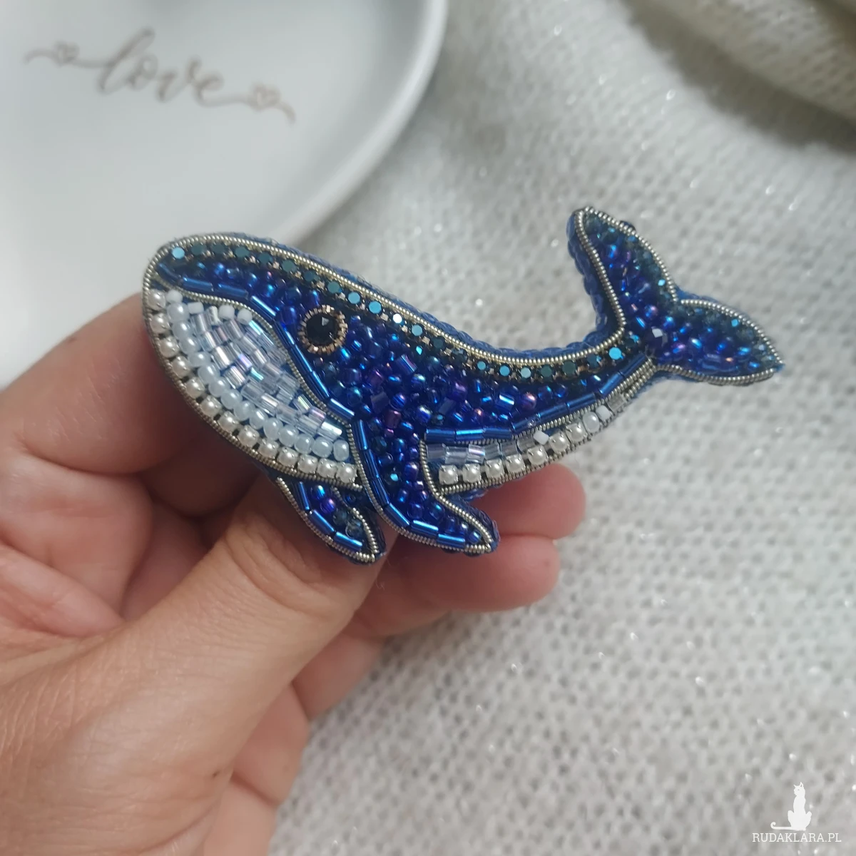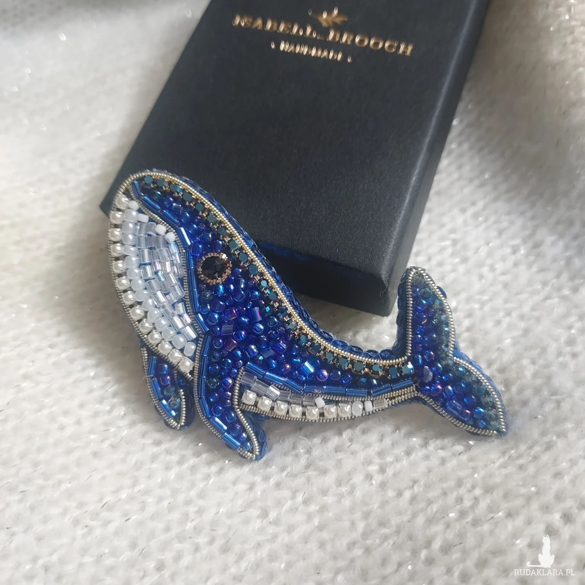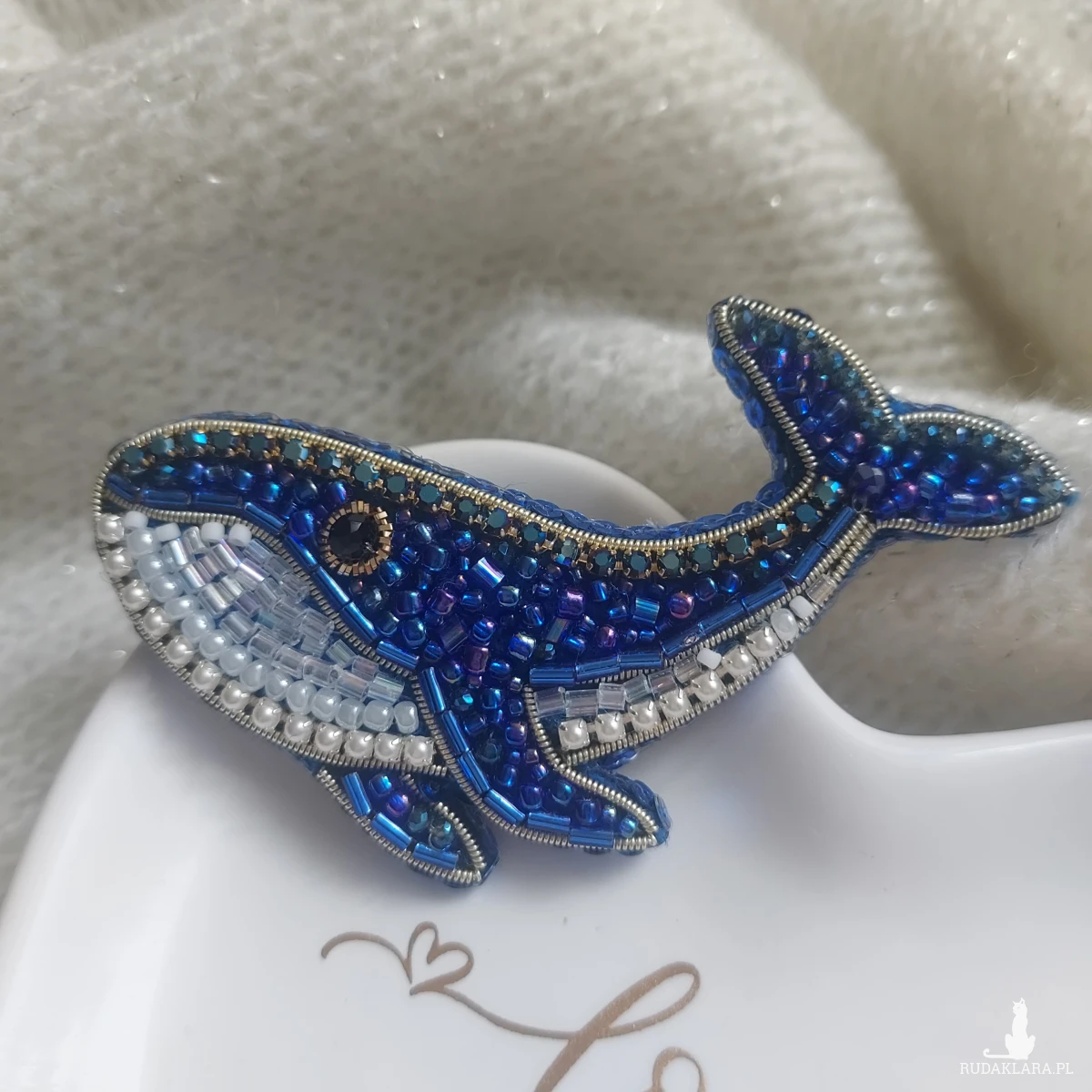 Autorska, niepowtarzalna, pełna blasku broszka WIELORYB powstała techniką haftu koralikowego.