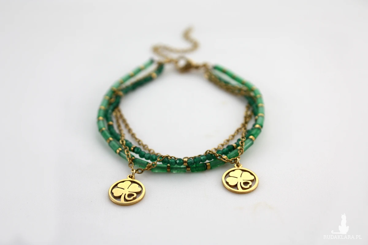 Bransoletka z dwóch sznurów zielonych naturalnych kamieni oraz dwóch łańcuszków ze stali szlachetnej, na których zawiesiłam symbole szczęścia- koniczynki. Doskonała na prezent. Zielone kamienie to chalcedon o kształcie walca oraz fasetowane kuli z jadeitu.