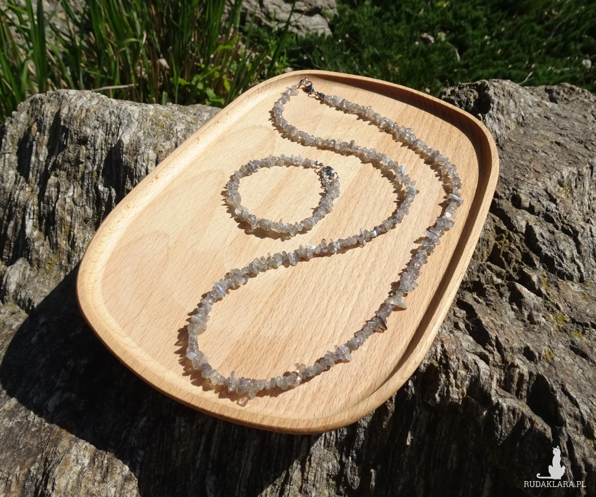 Komplet z sieczki labradorytu wielkości 3-5mm i elementów ze stali szlachetnej. W komplecie długi naszyjnik i bransoletka z zapięciem.Długość naszyjnika – 64cm, bransoletki – 17,5cm + przedłużka 3cm. Kamienie z bardzo wyraźnym efektem labradoryzacji – mienią się wszystkimi kolorami tęczy (m.in. niebieskim, zielonym i złotym).
