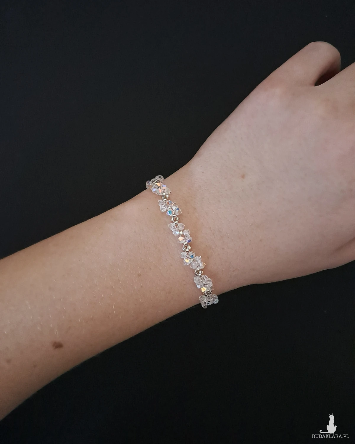 Ślubna bransoletka z kryształków Preciosa Crystal AB łączy w sobie lekkość i blask. Kryształki w odcieniu Crystal AB delikatnie opalizują – raz chłodne, raz ciepłe, zawsze świetliste. Srebrne koraliki Miyuki Delica dodają kompozycji elegancji, a stal nierdzewna dba o komfort noszenia przez cały dzień.