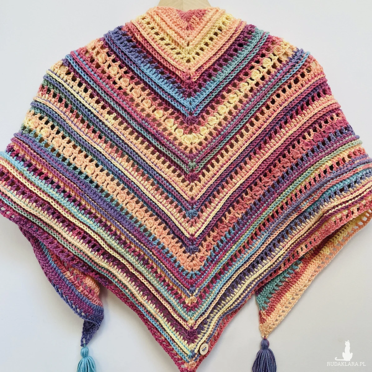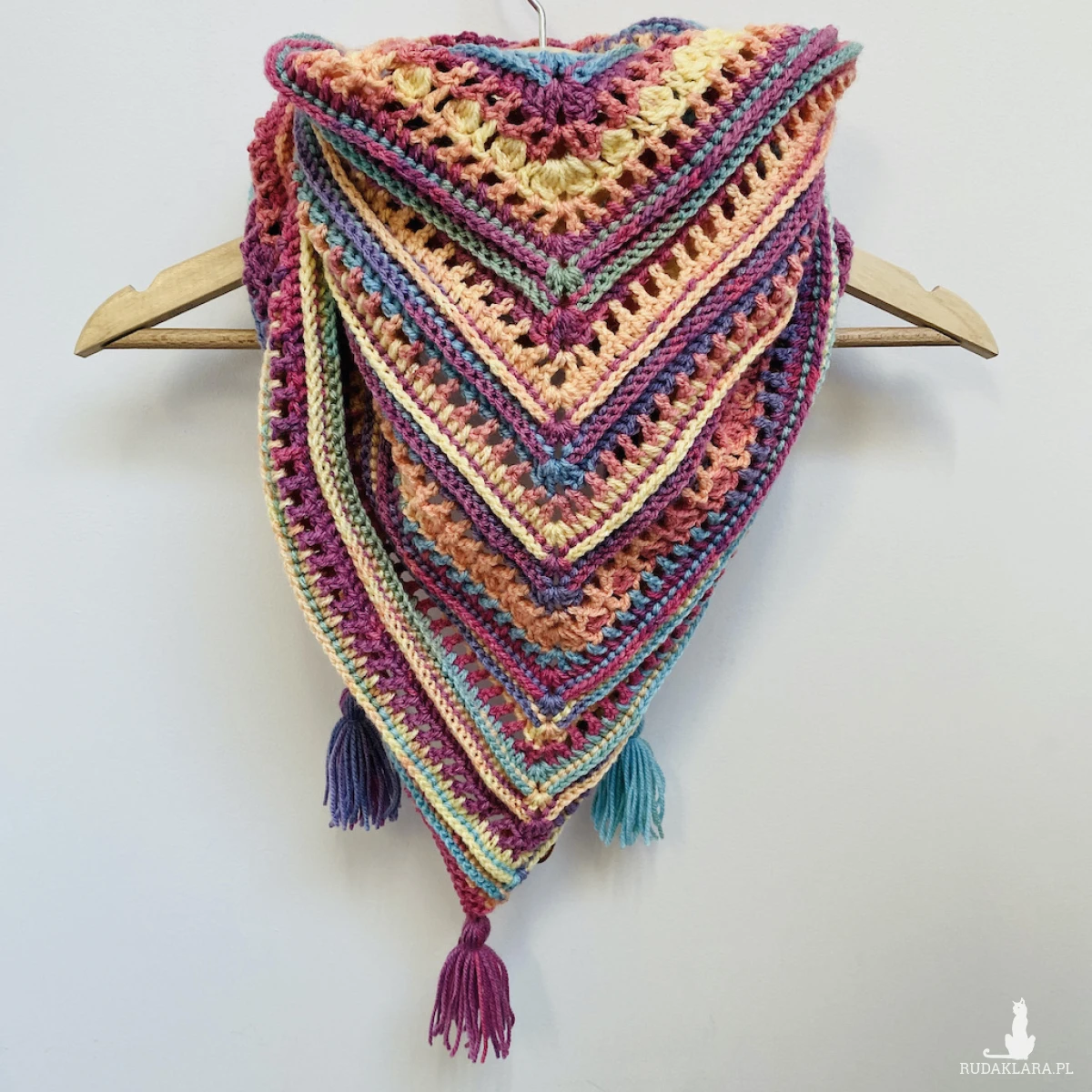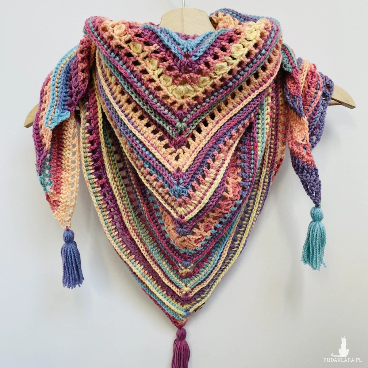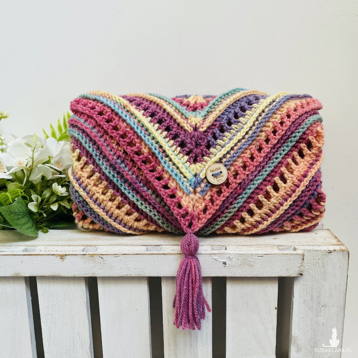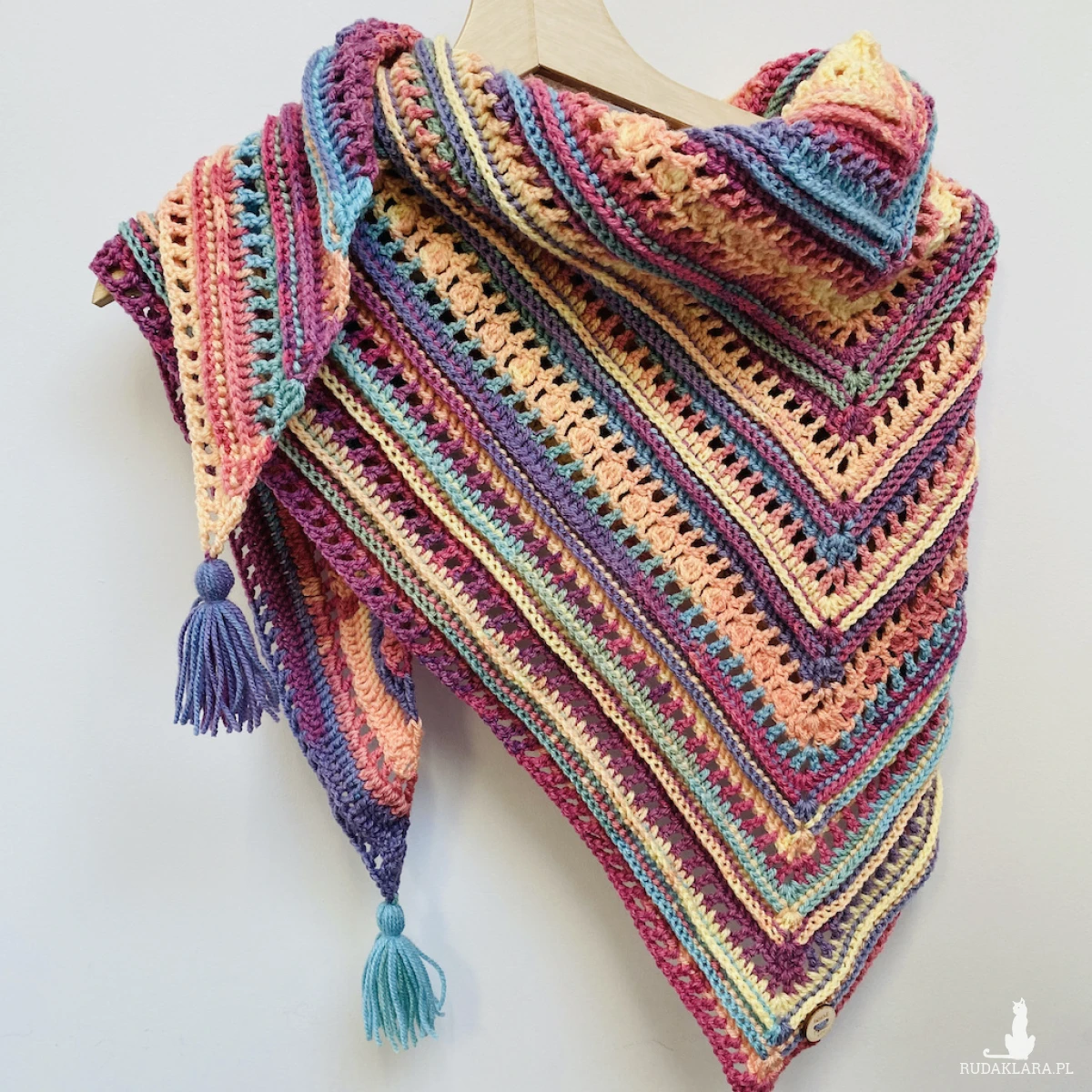 Chustę wykonałam na szydełku z miękkiej włóczki akrylowej, która zachwyca intensywnością koloru i delikatnością. Certyfikat OEKO-TEX® Standard 100 potwierdza, że jest bezpieczna dla a zdrowia materiały użyte do jej produkcji są wolne od szkodliwych substancji chemicznych.